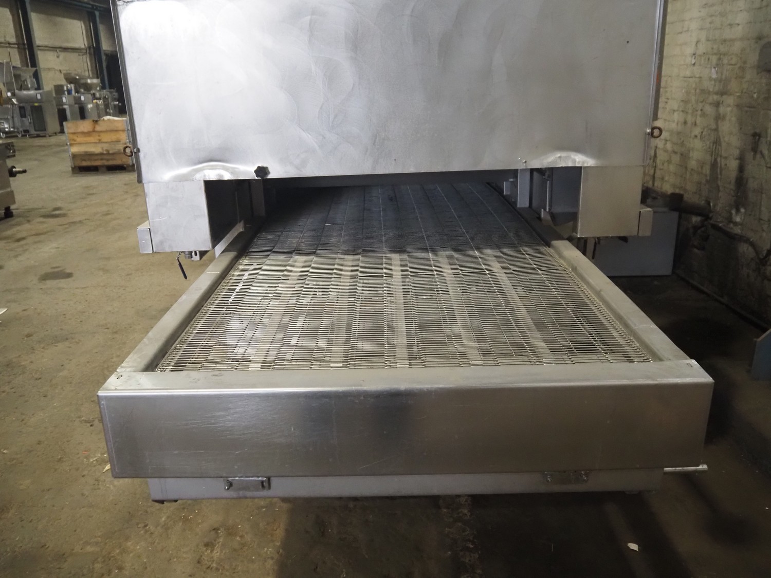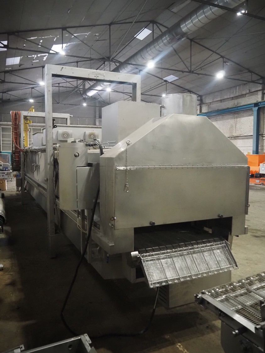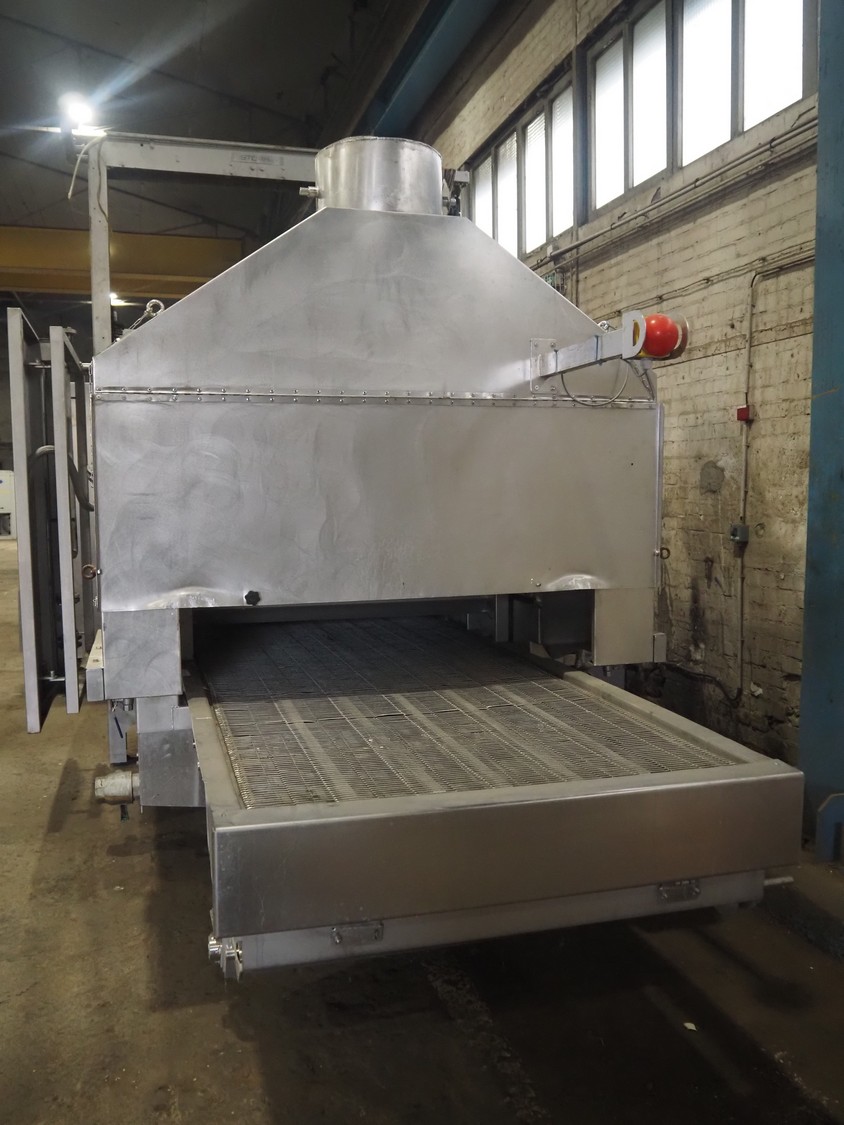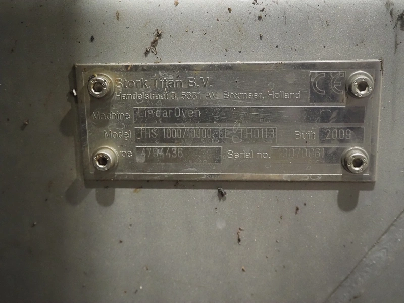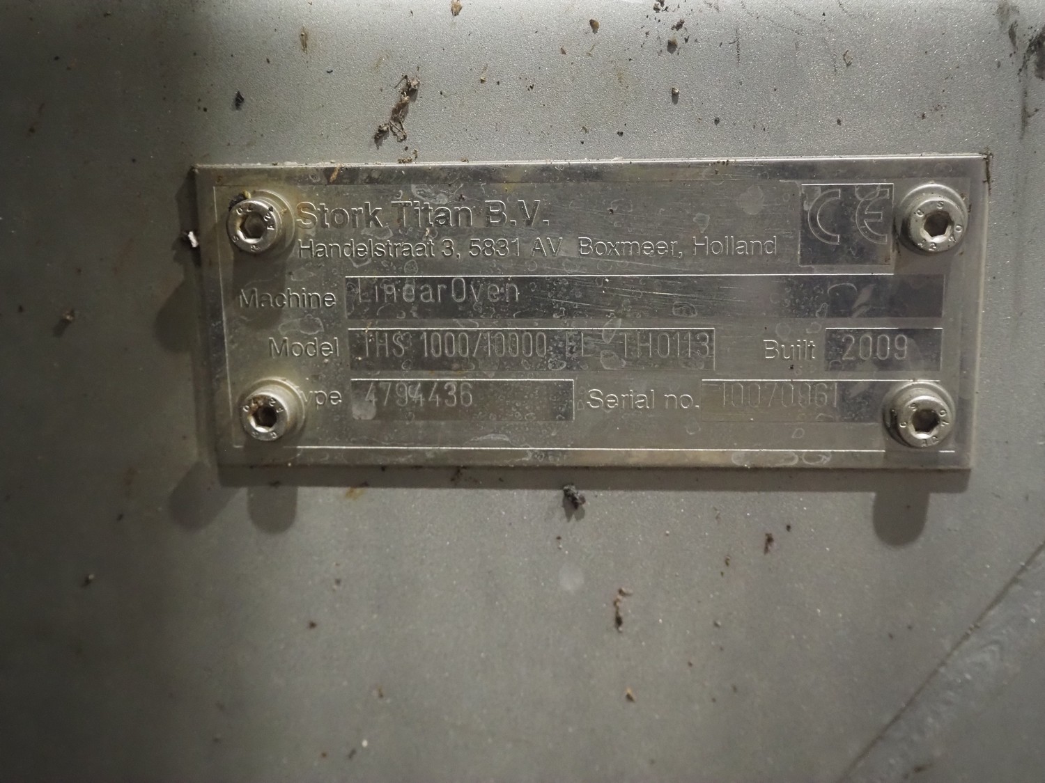 Stork Titan B.V. hot air tunnel oven, model: THS 1000/10000 EL THO113, type: 4794436, serial number: 10070961, year of construction: 2009, s/s mesh belt, belt width: 1000 mm, clearence: 1020 mm x 130 mm, total dimensions: 12700 mm x 2850 mm x 3320 mm. Including various parts.
