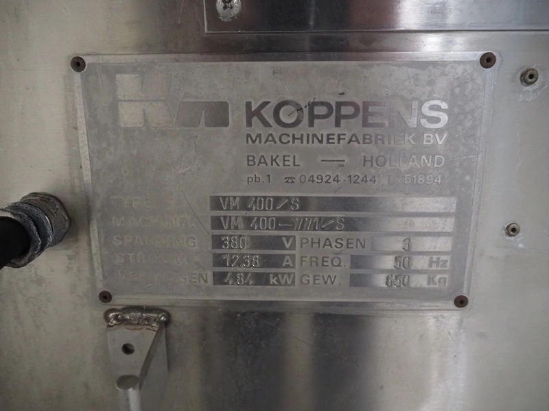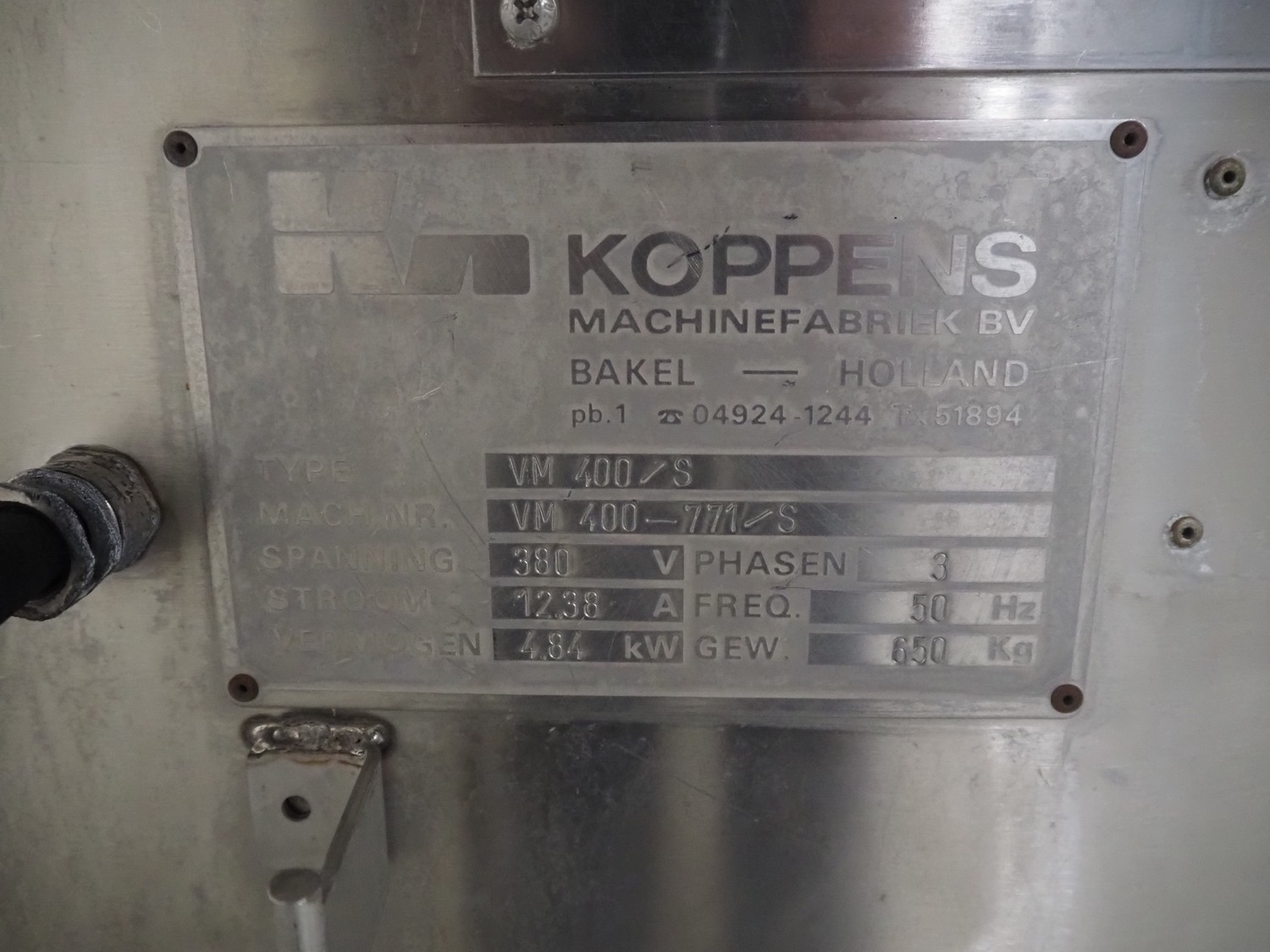 Koppens Machinefabriek BV mobile forming machine, type: VM 400/S, machine number: VM 400 - 771/S, 380 V, 3 Ph, 50 Hz, 12.38 A, 4.84 kW, weight: 650 Kg, dimensions: 2030 mm x 700 mm x 2300 mm. Including pallet with parts, oval dye: (8x) 70 mm x 55 mm, total dimensions: 1200 mm x 800 mm x 350 mm. Missing belt.