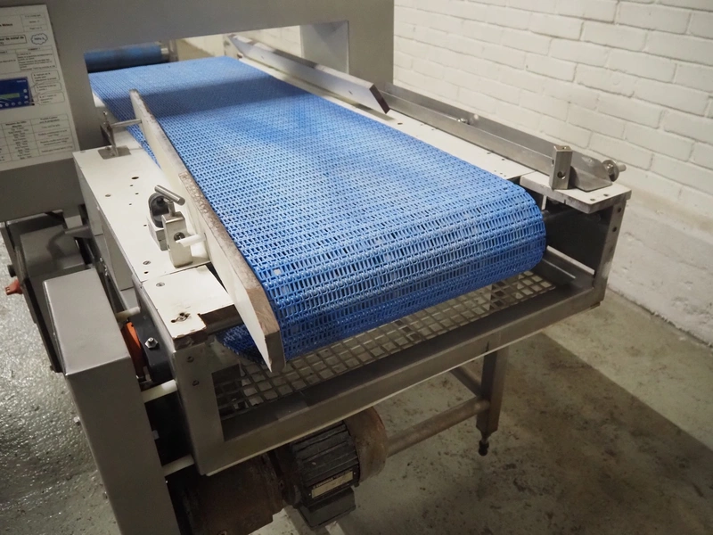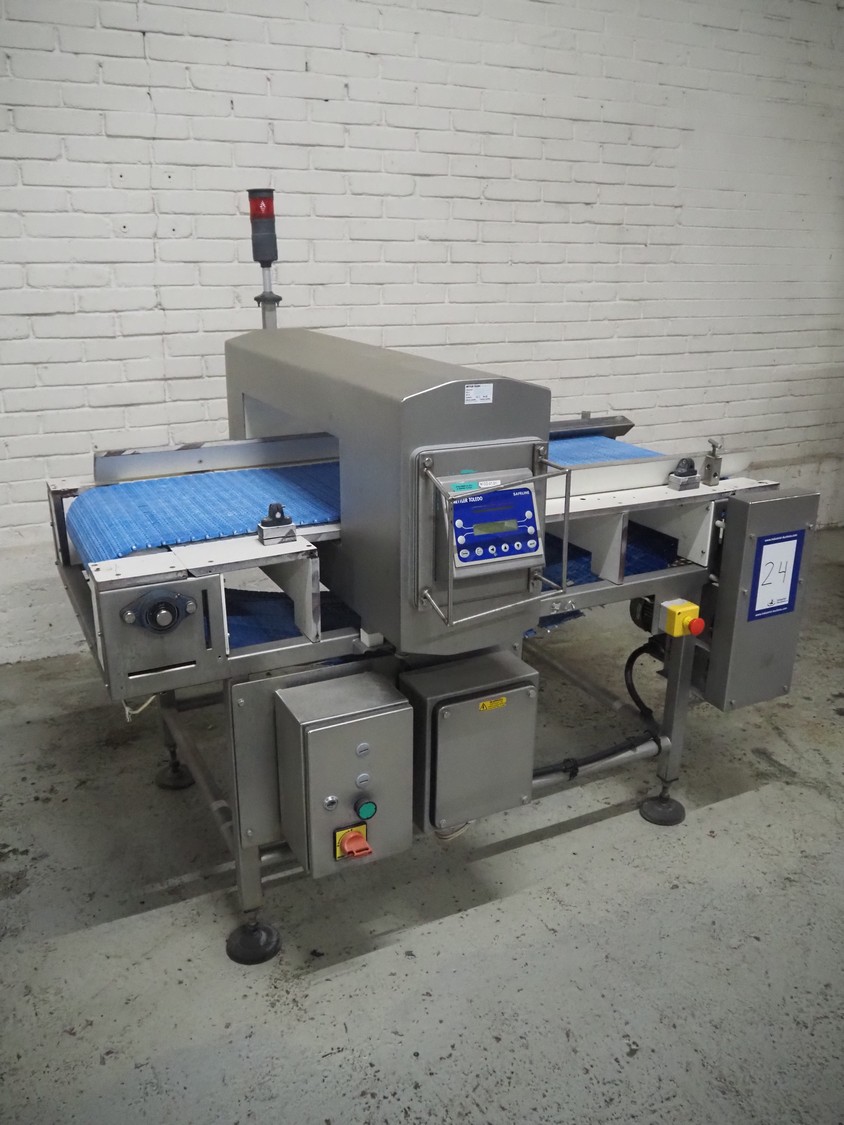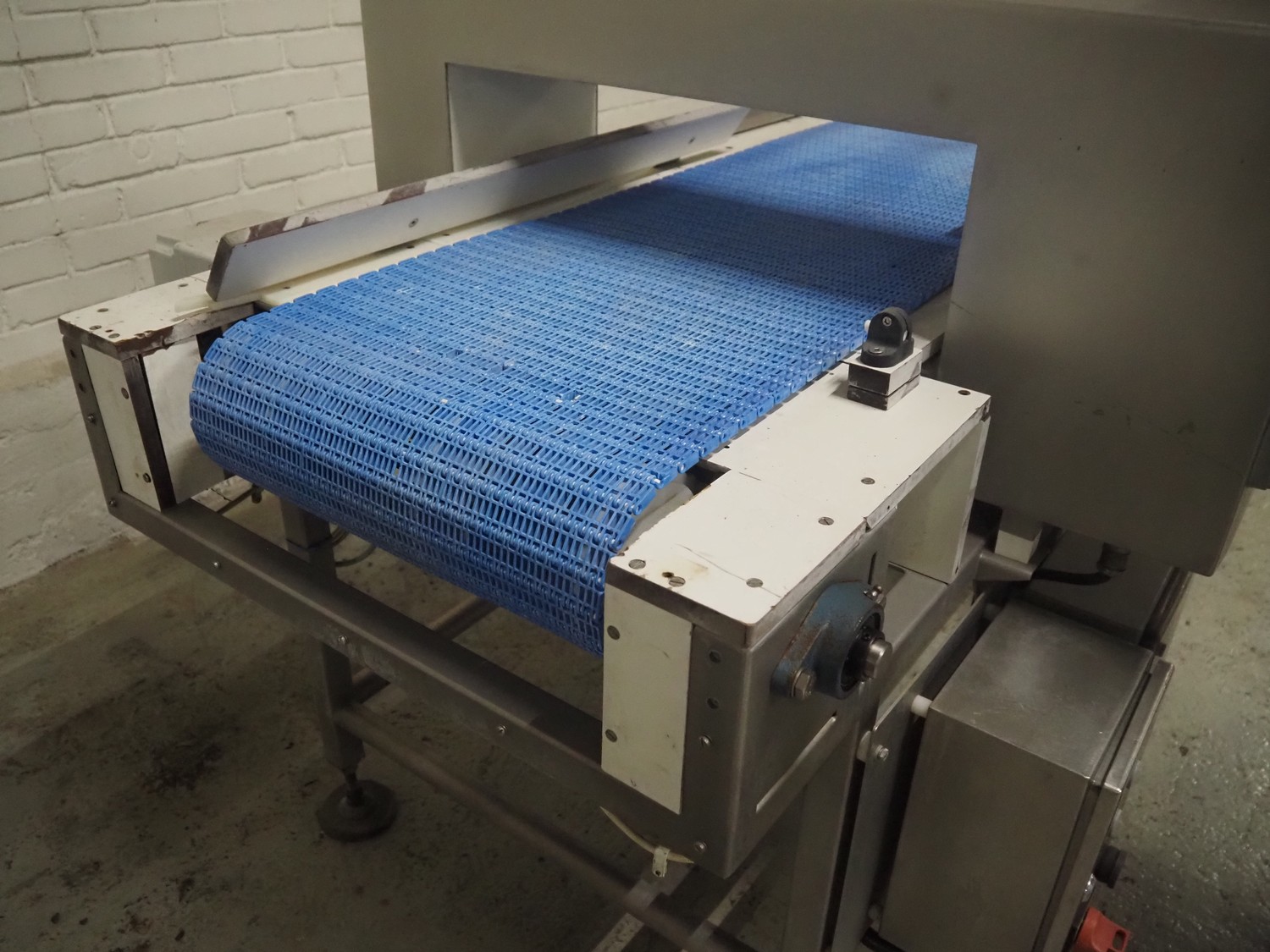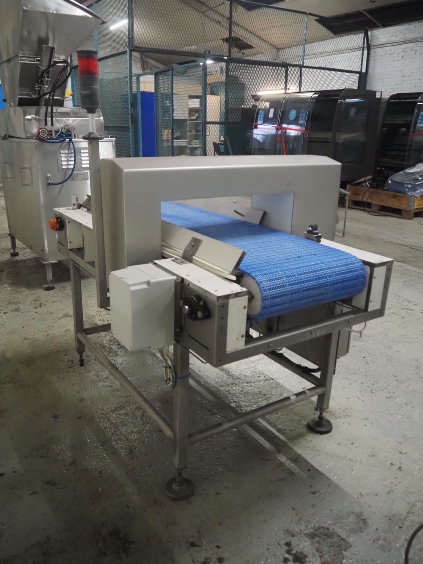 Mettler Toledo Safeline Ltd metal detector, plastic mesh belt, belt width: 455 mm, clearence: 600 mm x 160 mm, total dimensions: 1500 mm x 1230 mm x 1480 mm. Screen damaged.
