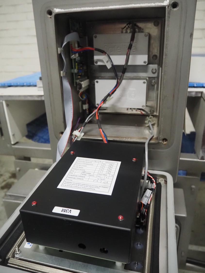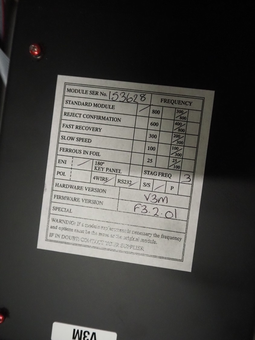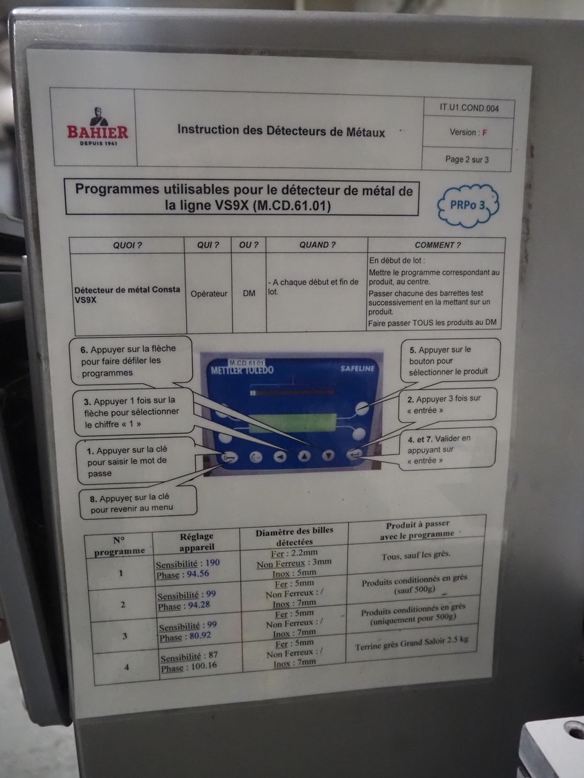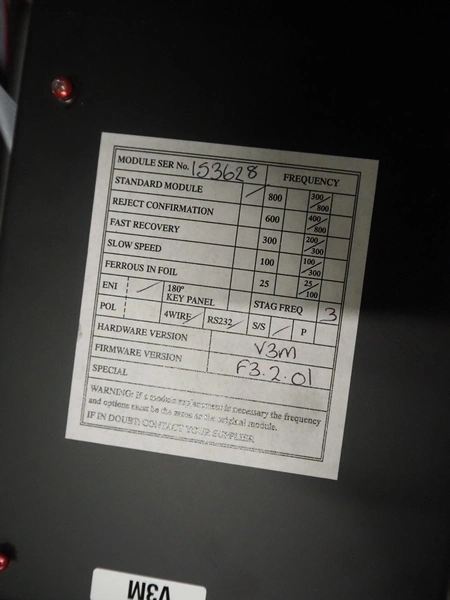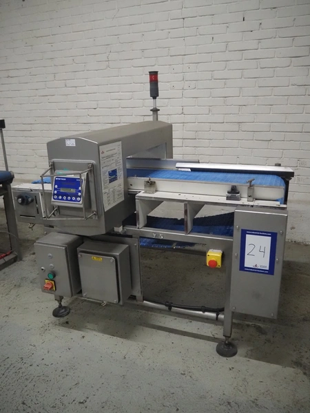 Mettler Toledo Safeline Ltd metal detector, plastic mesh belt, belt width: 455 mm, clearence: 600 mm x 160 mm, total dimensions: 1500 mm x 1230 mm x 1480 mm. Screen damaged.