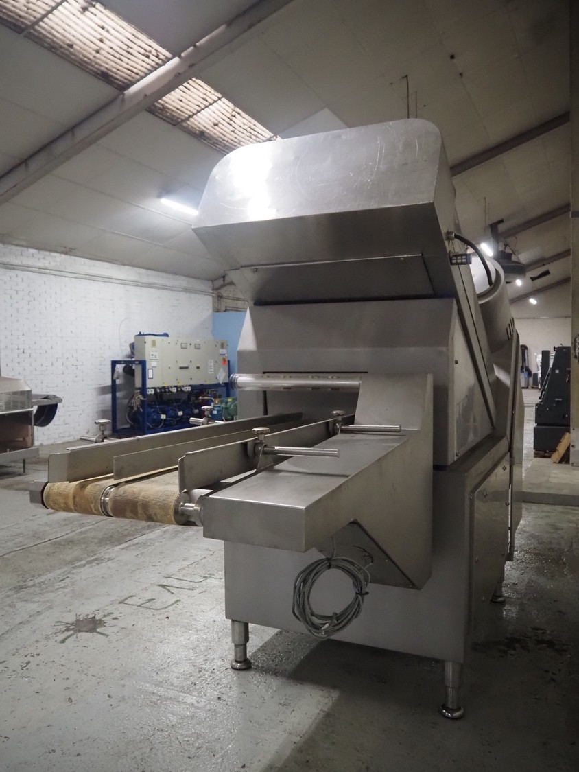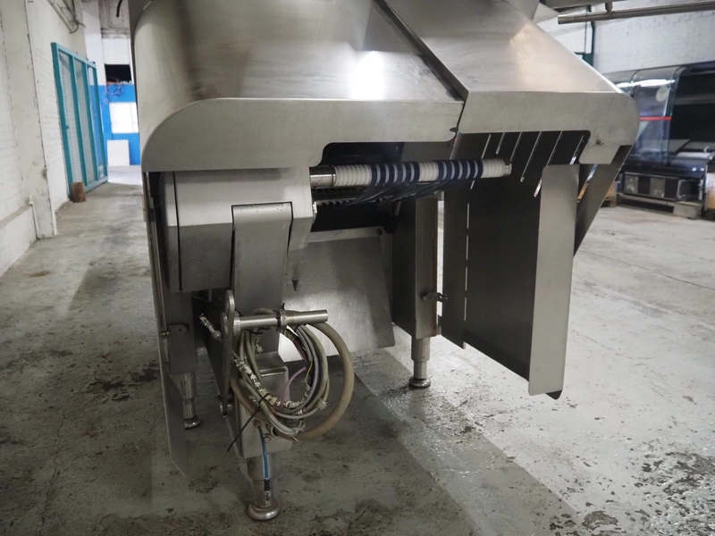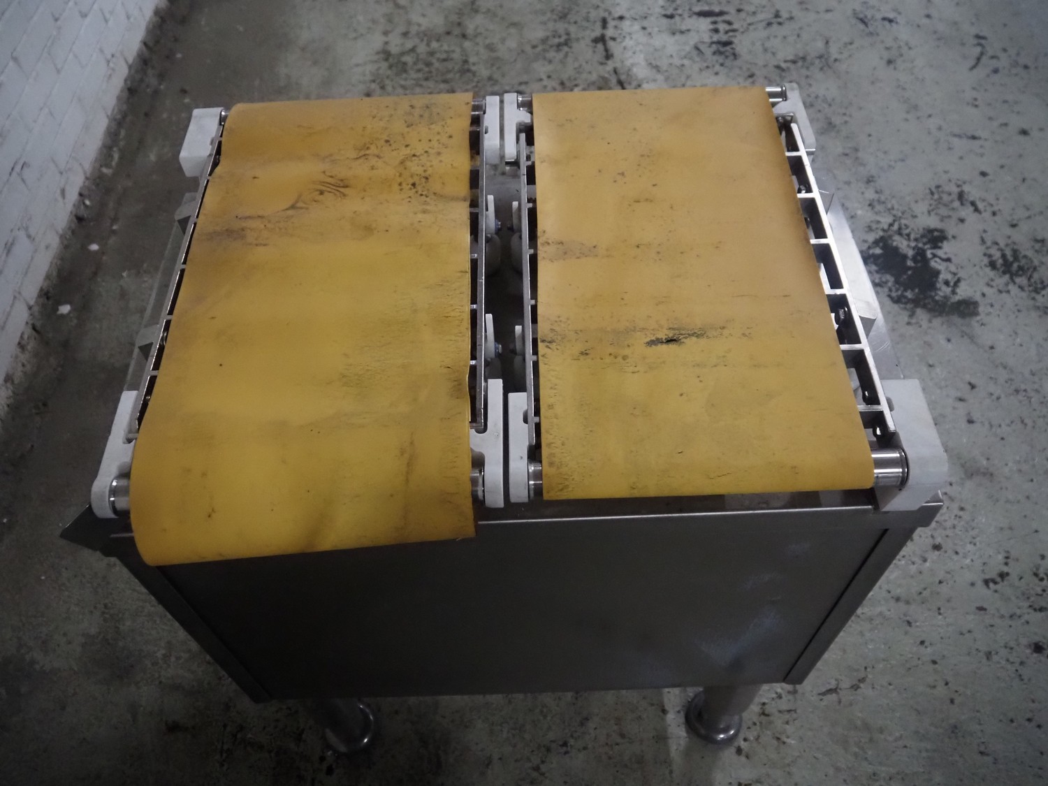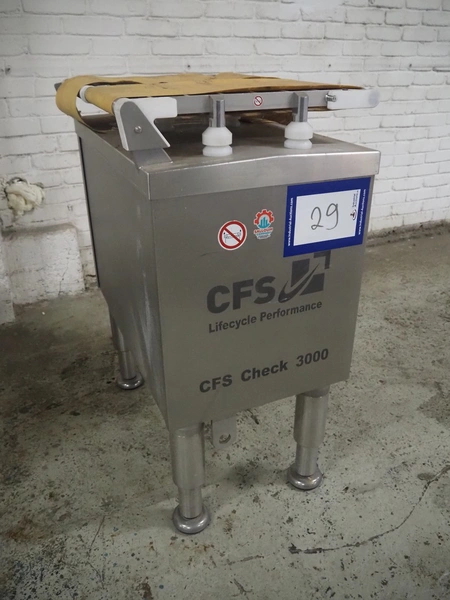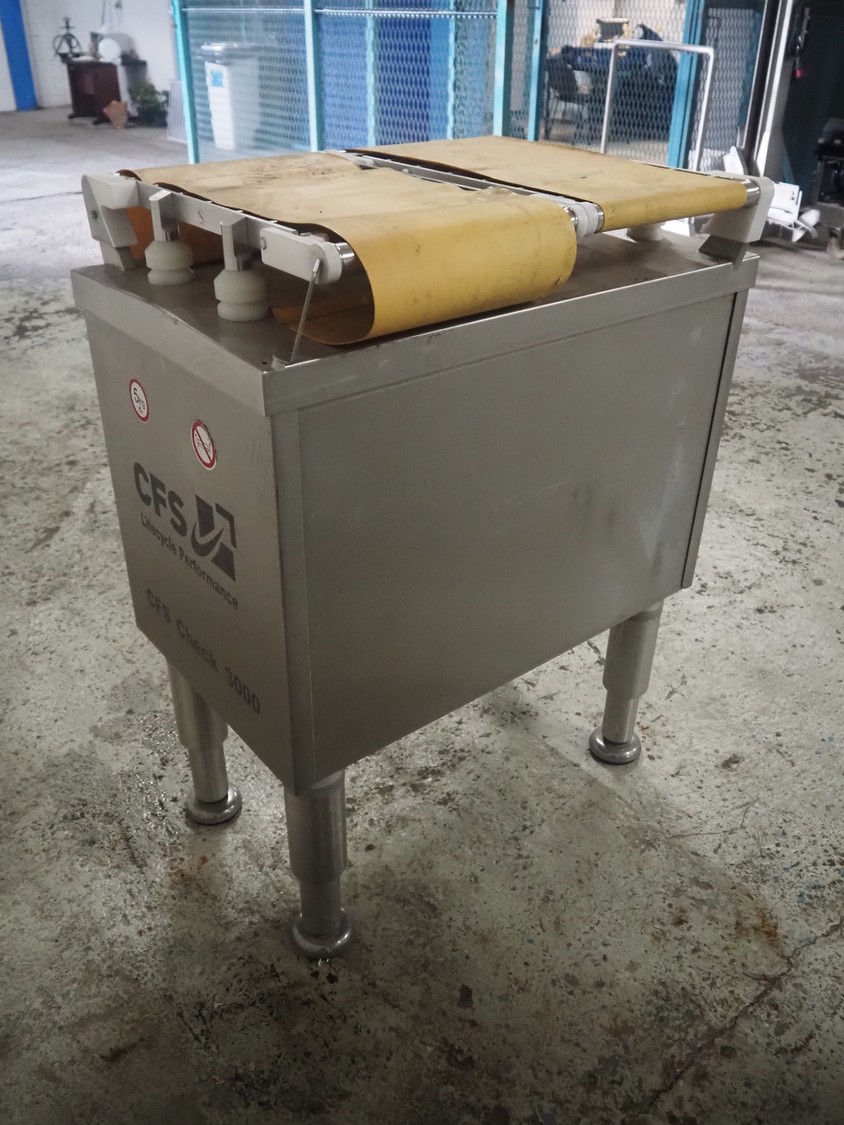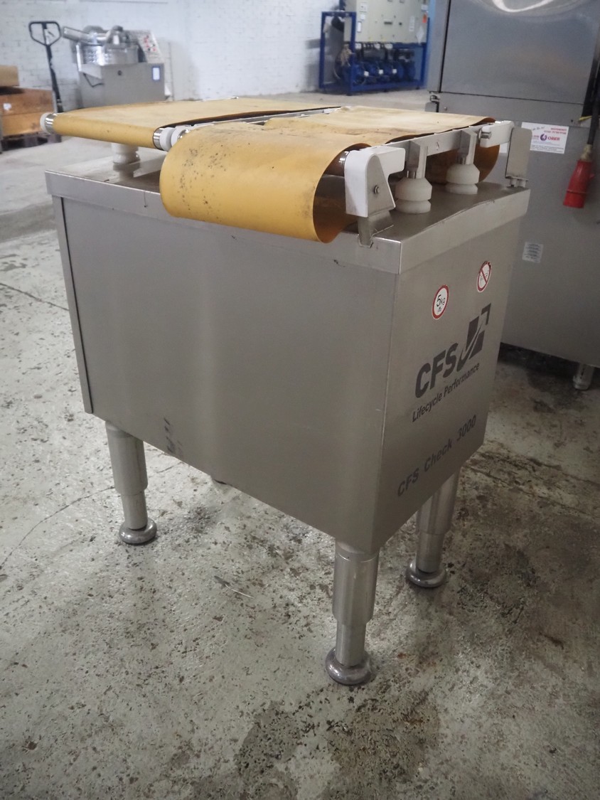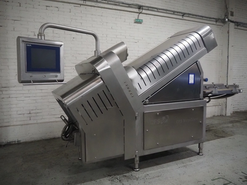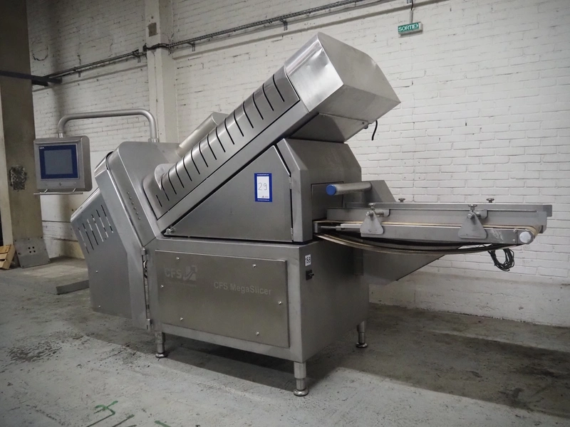 CFS megaslicer, plastic belt, belt width: (2x) 193 mm, string belt, belt width: 470 mm, total dimensions: 4400 mm x 1200 mm x 1350 mm, with CFS checkweigher, type: Check 3000, plastic belt, belt width: 285 mm and 270 mm, total dimensions: 800 mm x 520 mm x 1050 mm. Slicer missing knife.