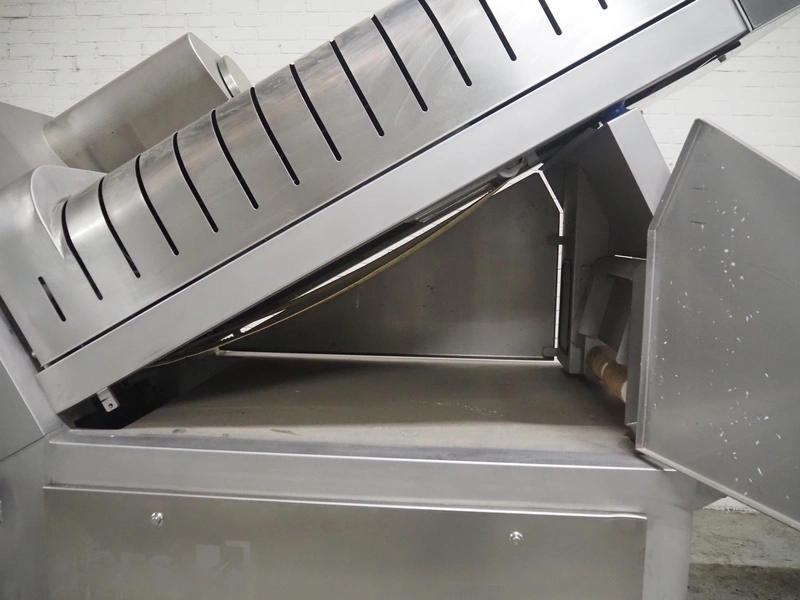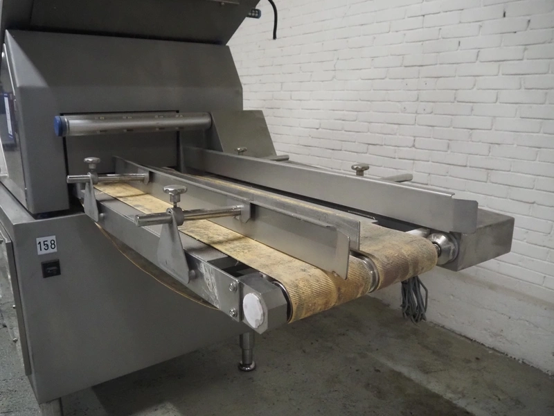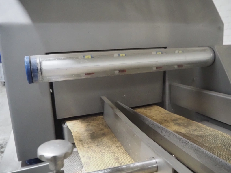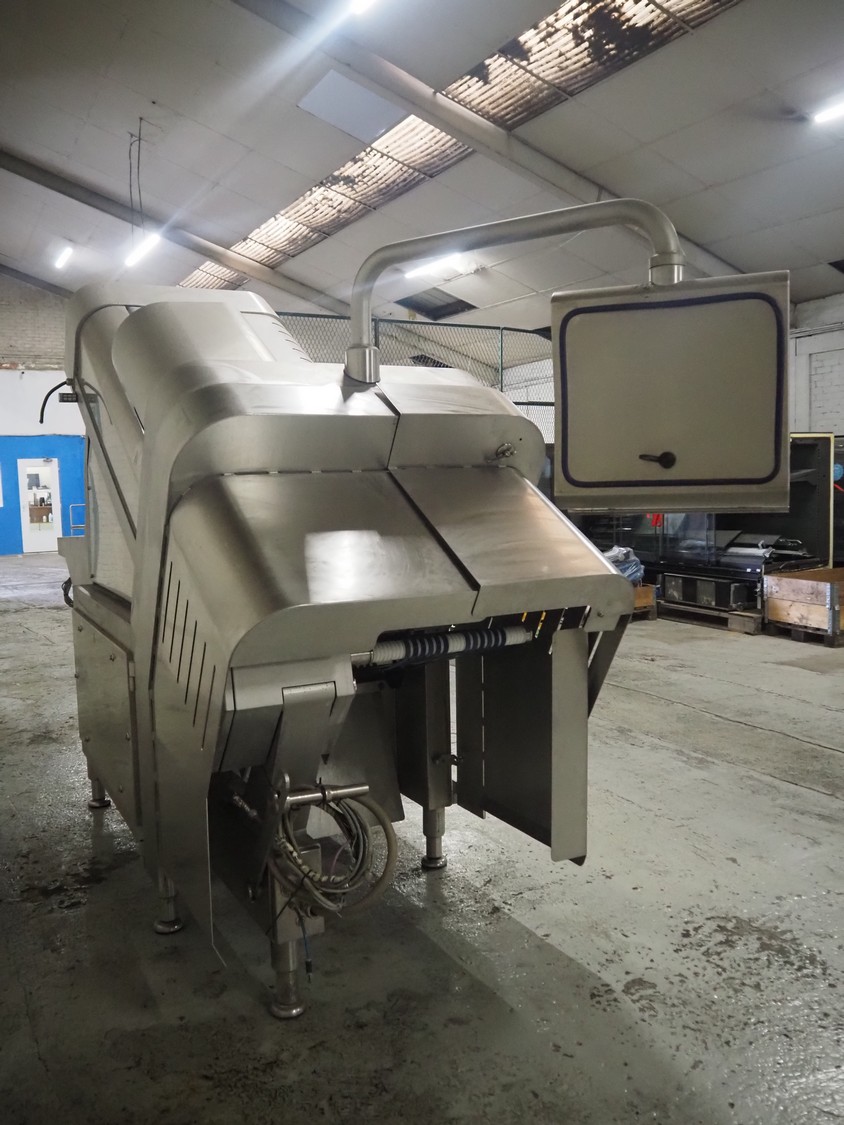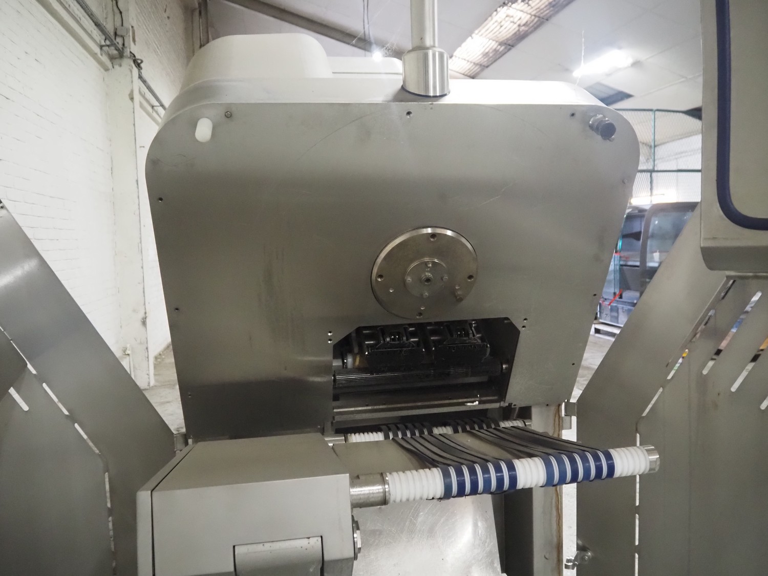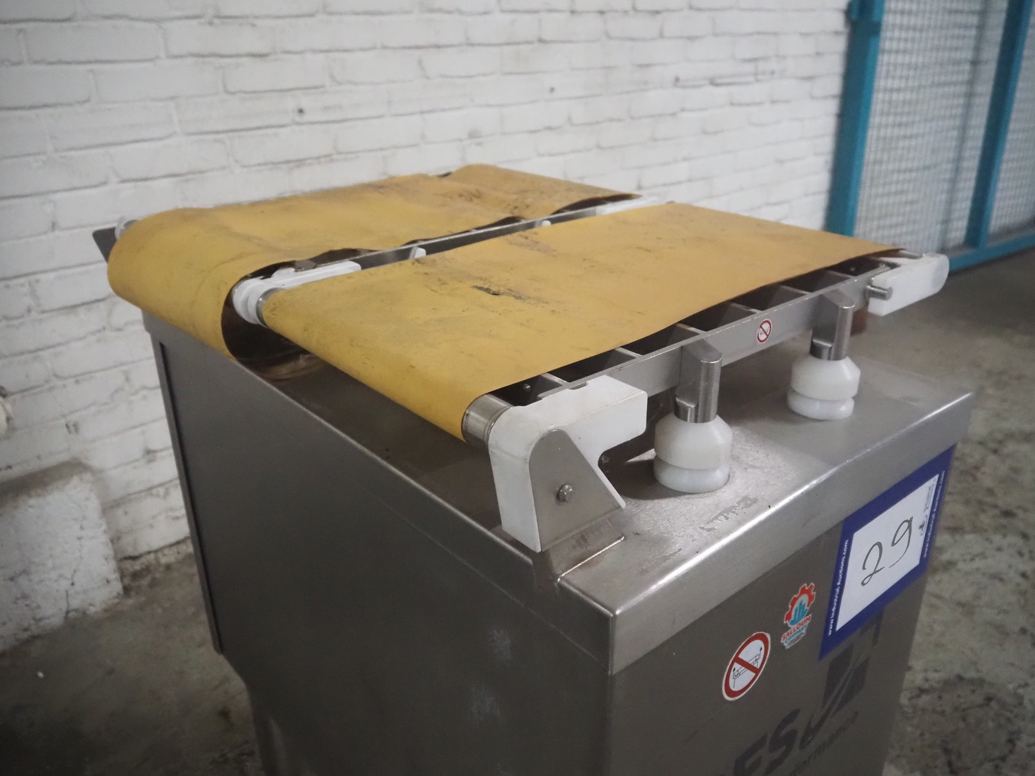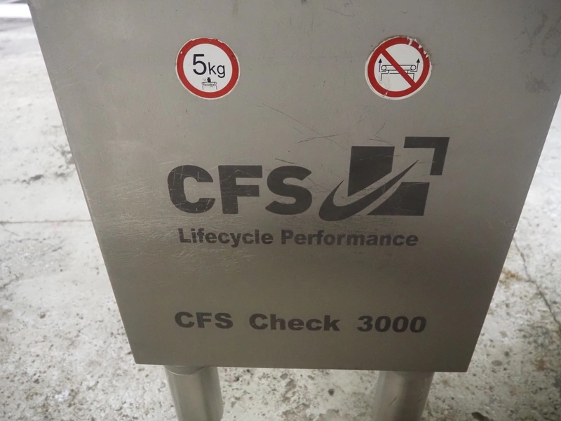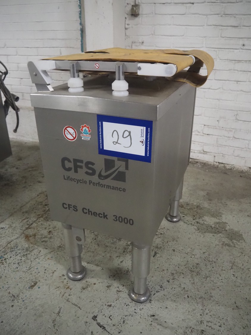 CFS megaslicer, plastic belt, belt width: (2x) 193 mm, string belt, belt width: 470 mm, total dimensions: 4400 mm x 1200 mm x 1350 mm, with CFS checkweigher, type: Check 3000, plastic belt, belt width: 285 mm and 270 mm, total dimensions: 800 mm x 520 mm x 1050 mm. Slicer missing knife.