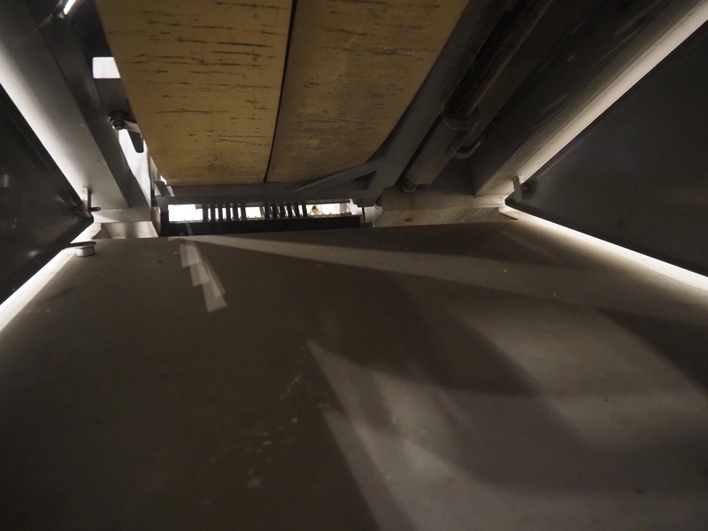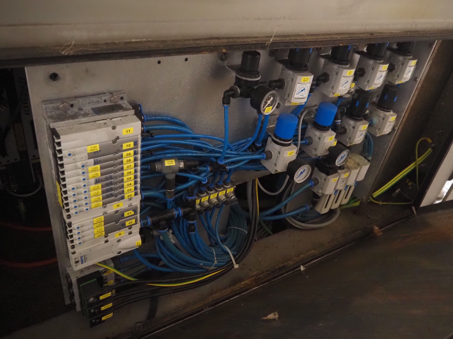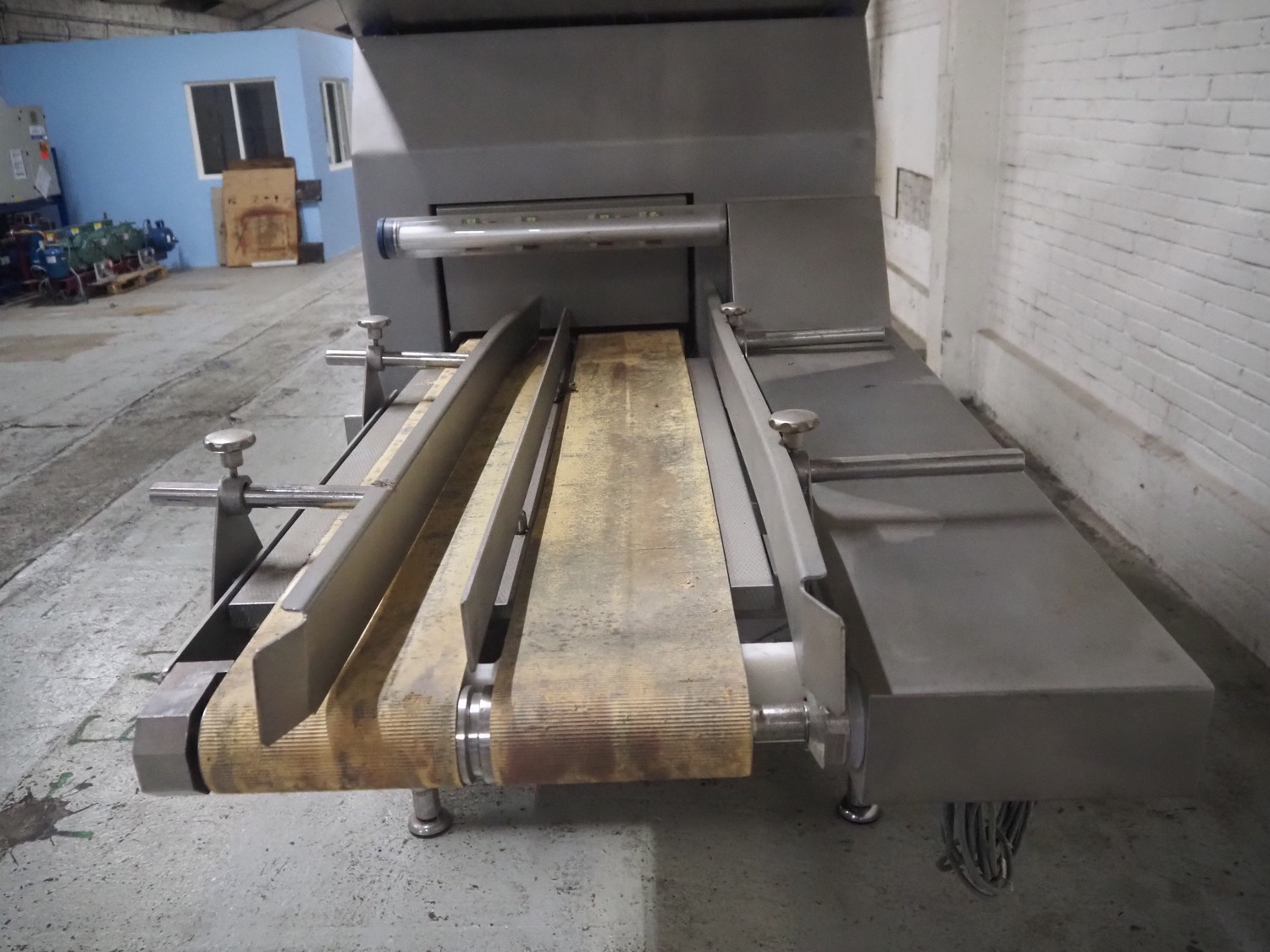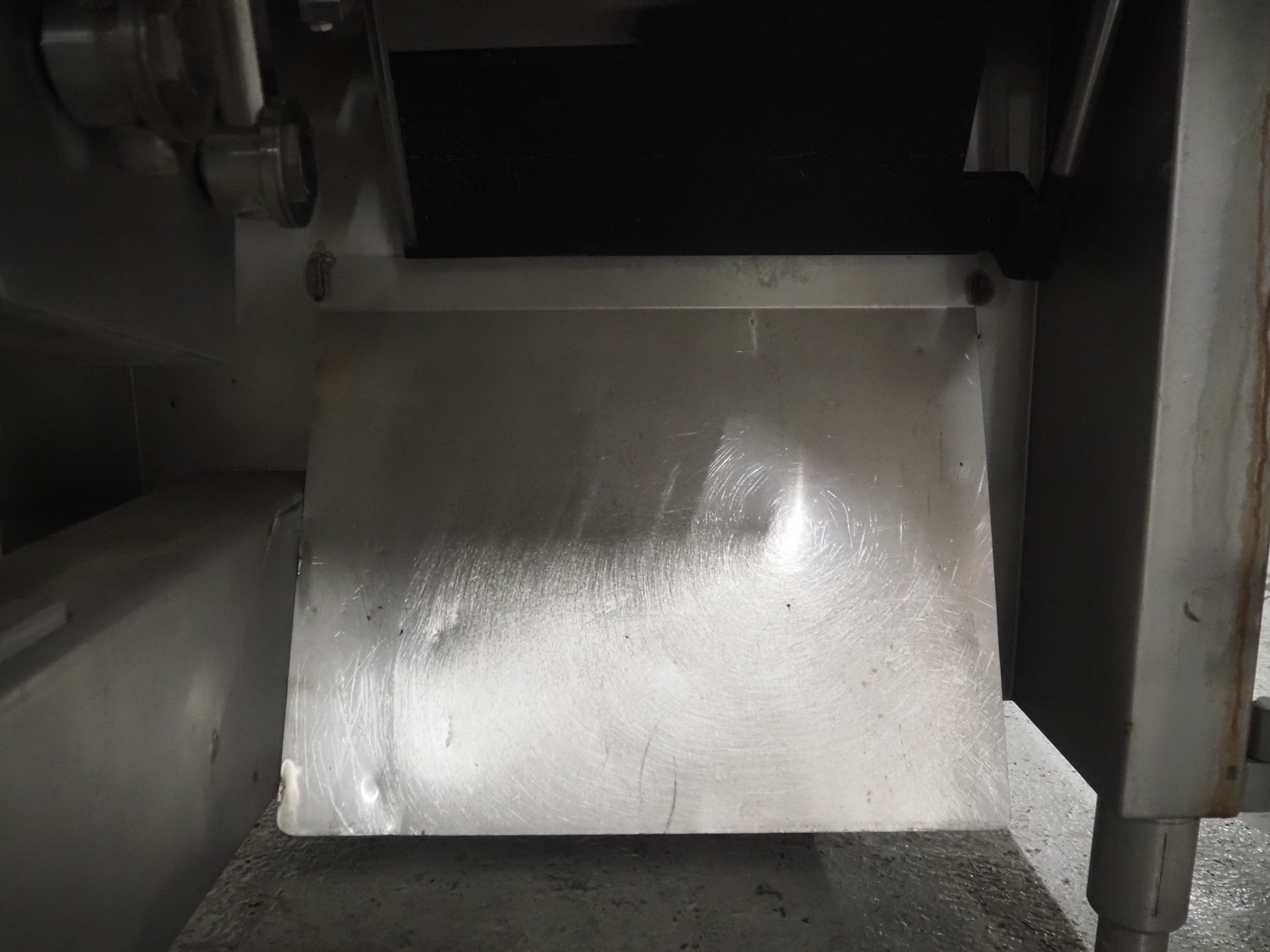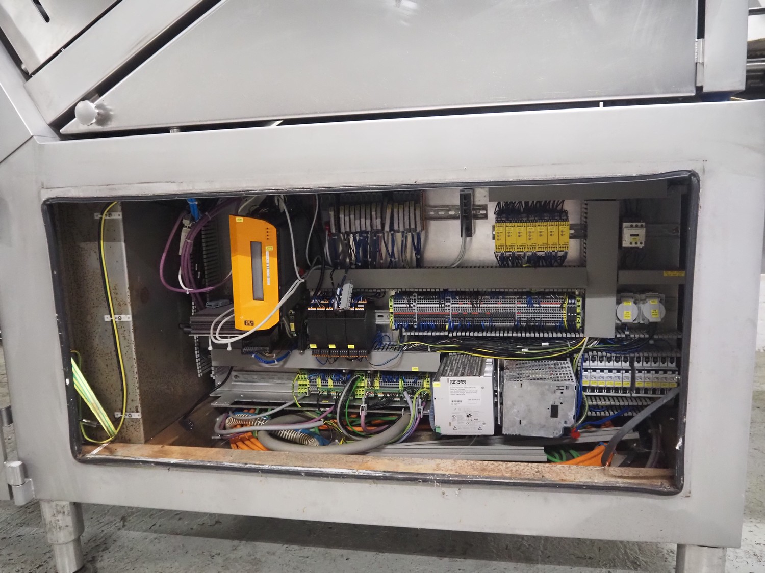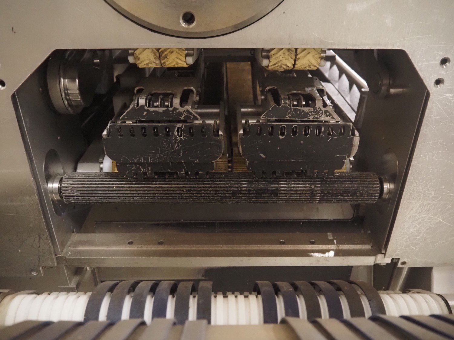 CFS megaslicer, plastic belt, belt width: (2x) 193 mm, string belt, belt width: 470 mm, total dimensions: 4400 mm x 1200 mm x 1350 mm, with CFS checkweigher, type: Check 3000, plastic belt, belt width: 285 mm and 270 mm, total dimensions: 800 mm x 520 mm x 1050 mm. Slicer missing knife.