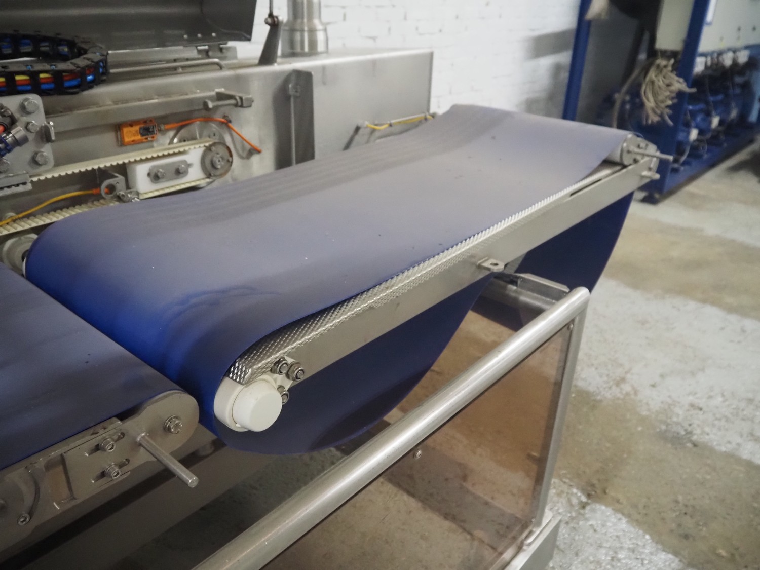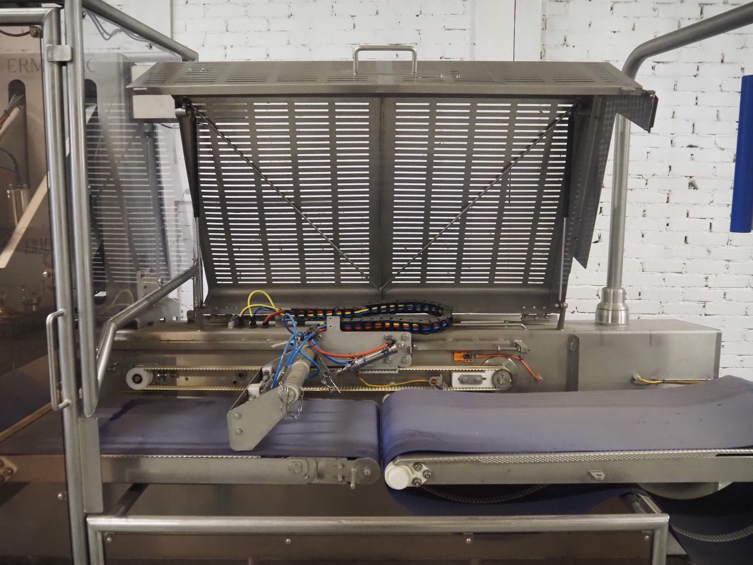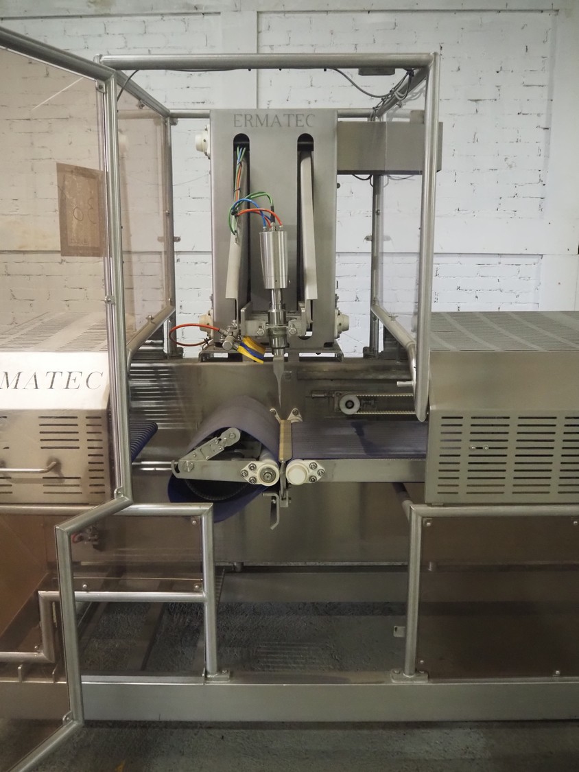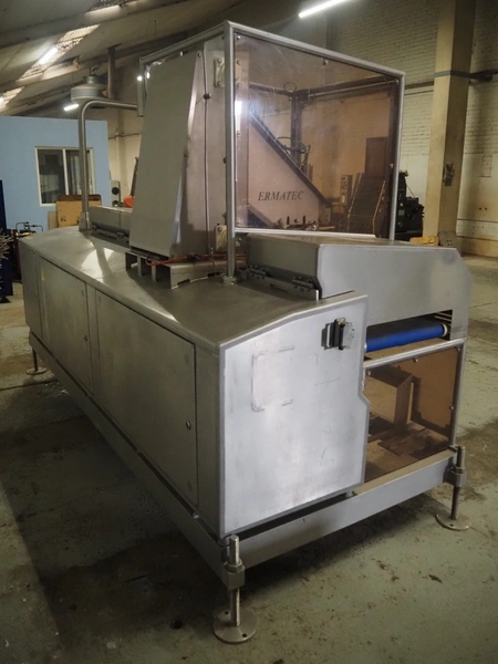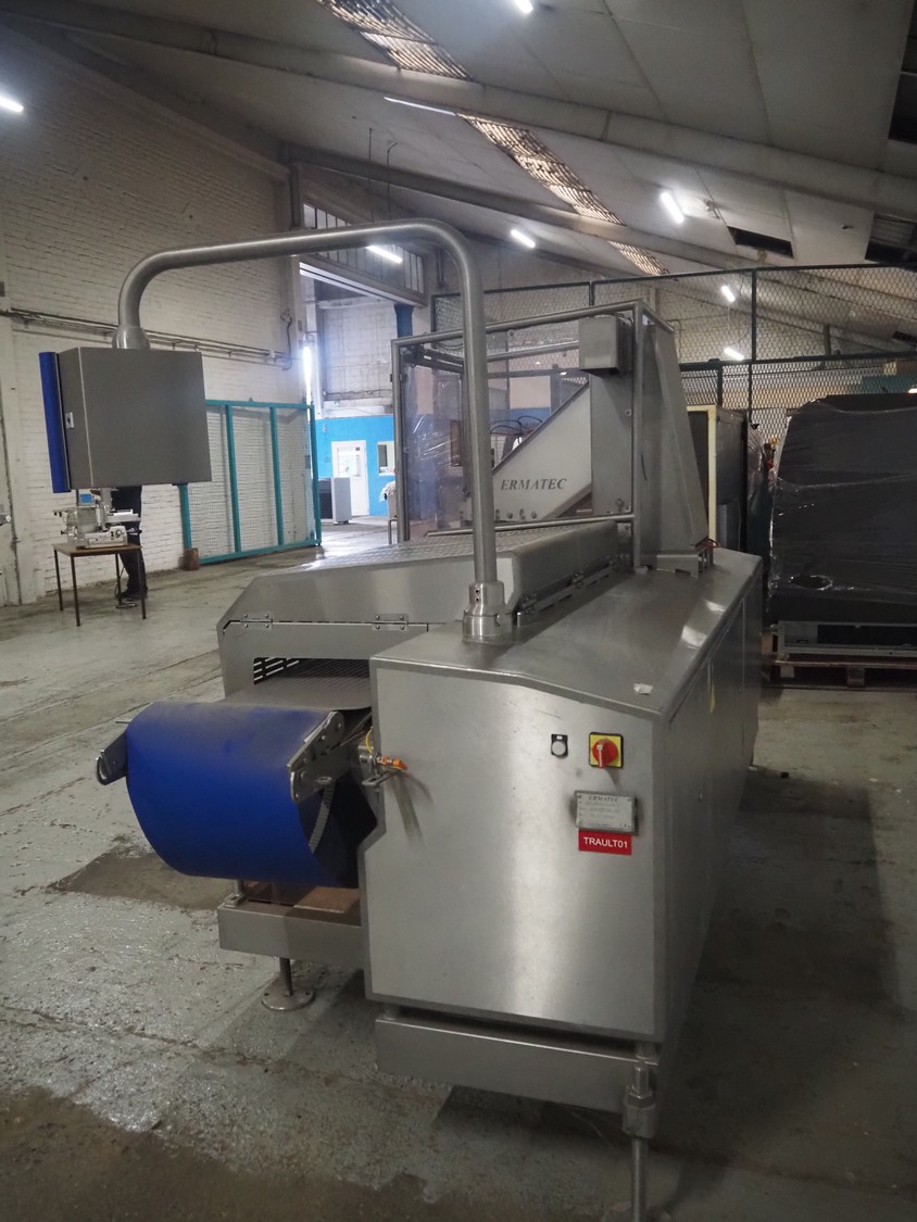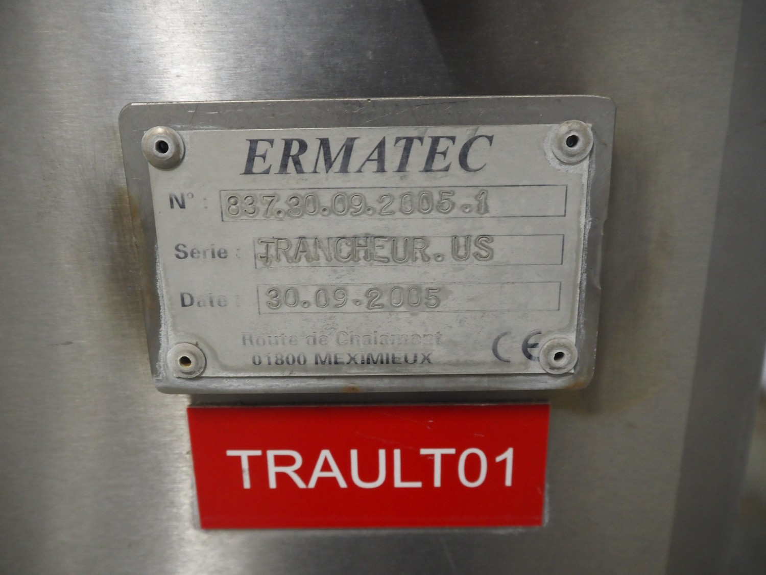 Ermatec slicer for cheese, serie: TRENCHEUR.US, number: 837, year of construction: 30.09.2005, plastic belt, belt width: 420 mm, working width: 485 mm, total dimensions: 3200 mm x 1300 mm x 2000 mm.
