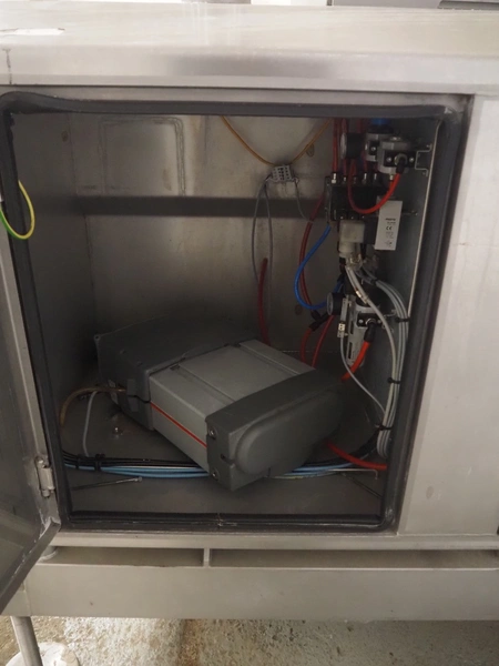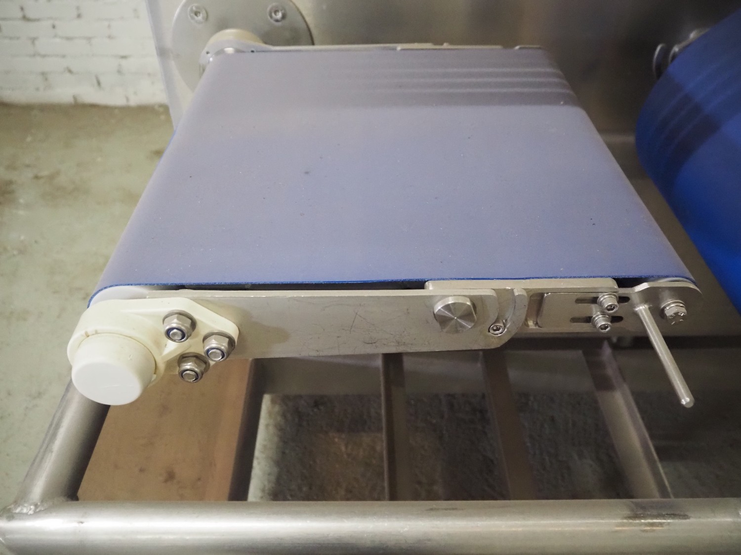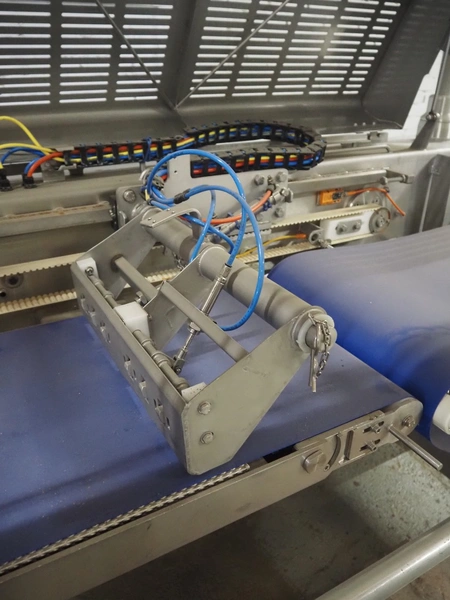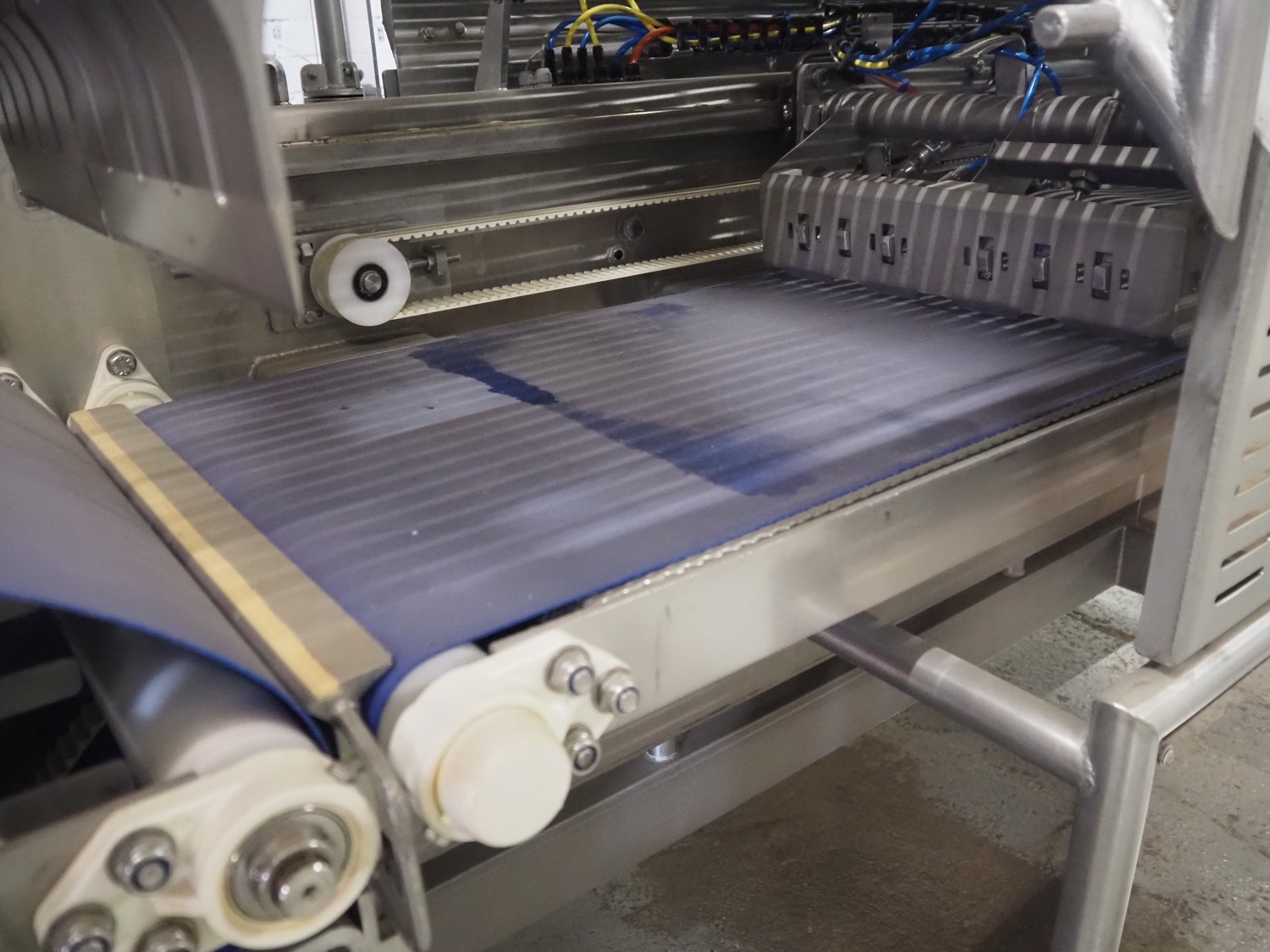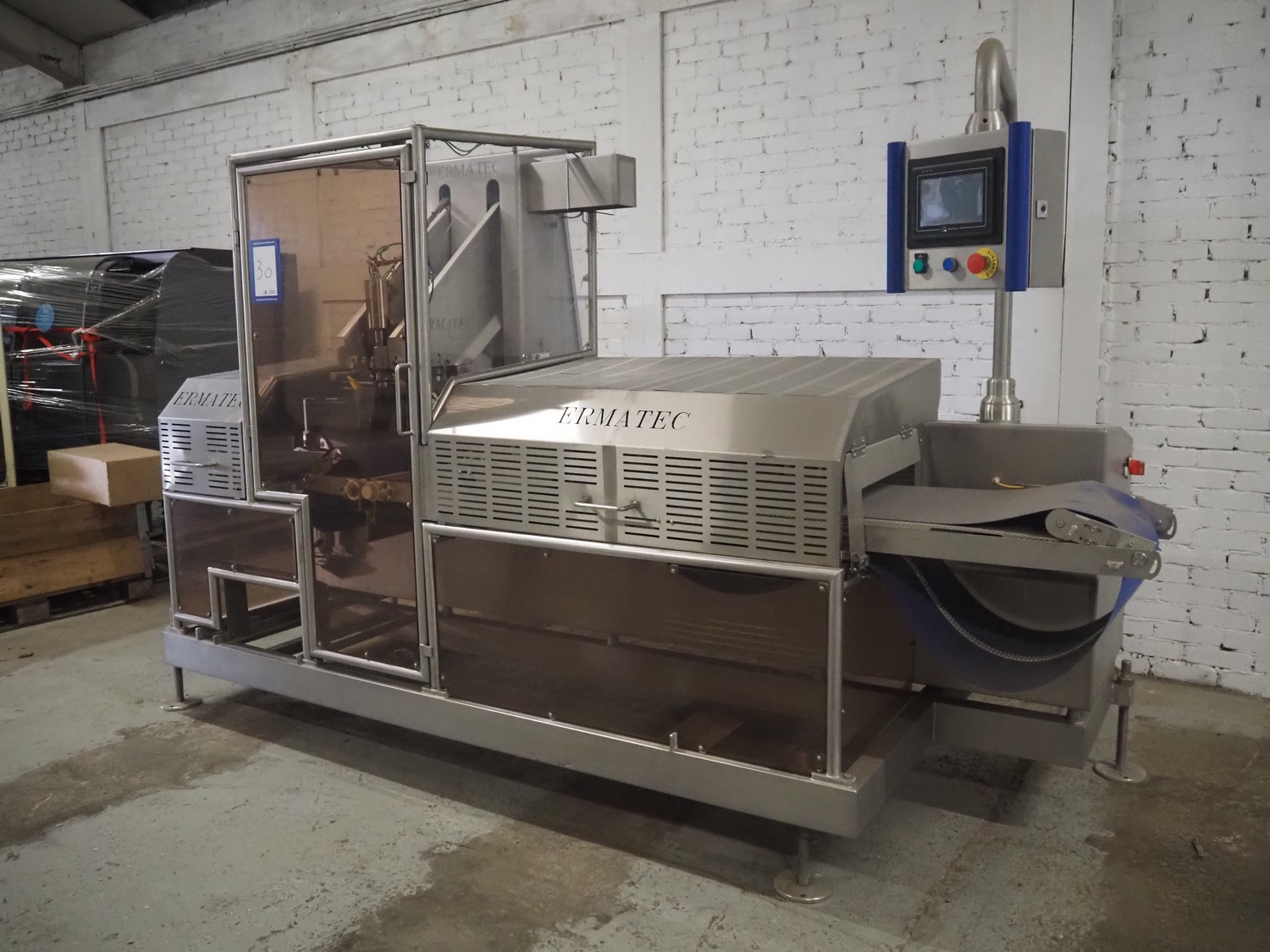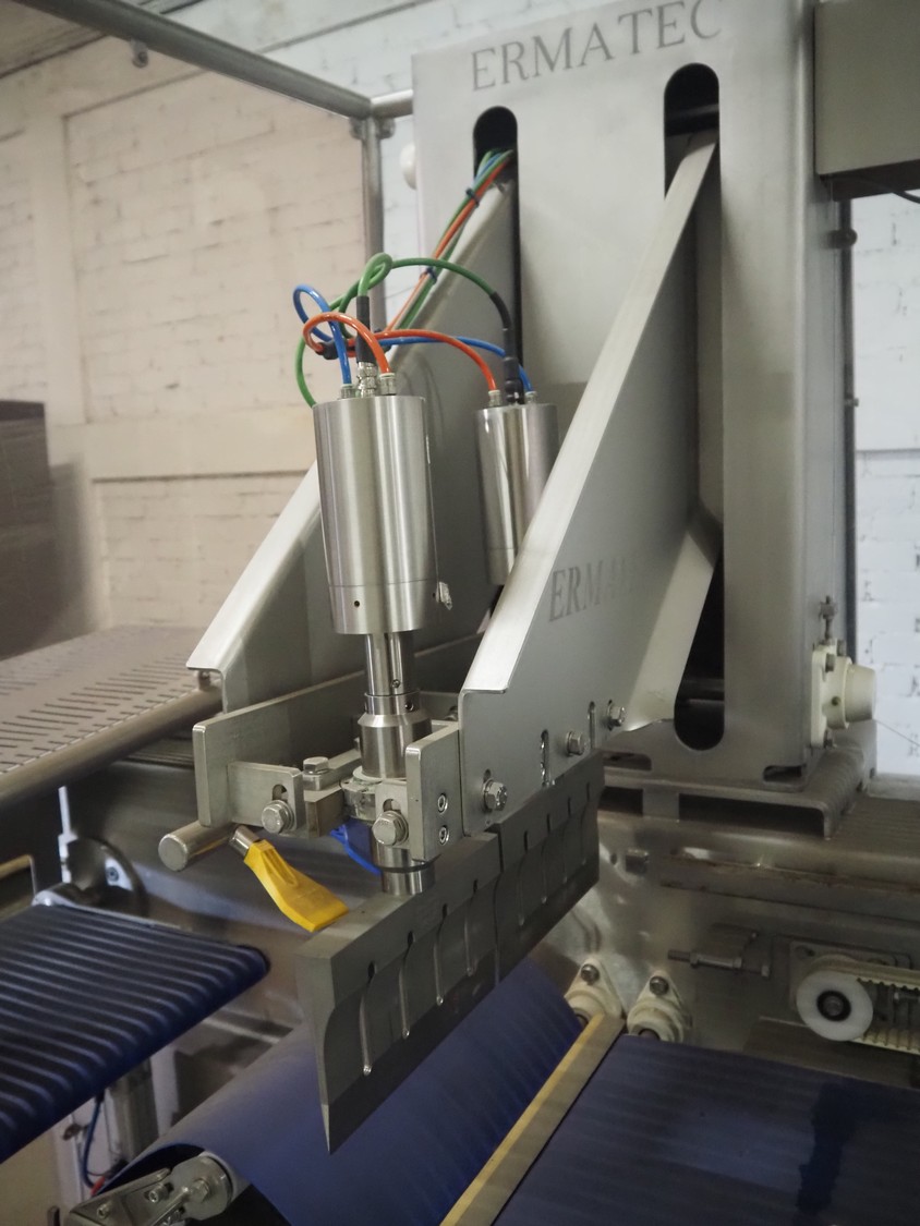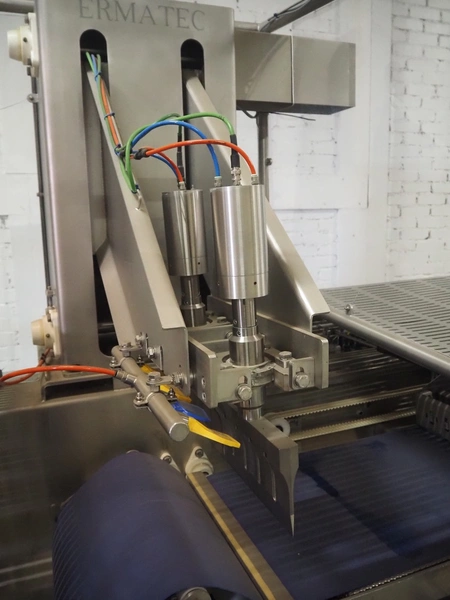 Ermatec slicer for cheese, serie: TRENCHEUR.US, number: 837, year of construction: 30.09.2005, plastic belt, belt width: 420 mm, working width: 485 mm, total dimensions: 3200 mm x 1300 mm x 2000 mm.