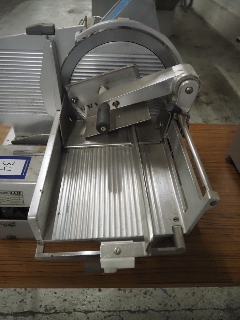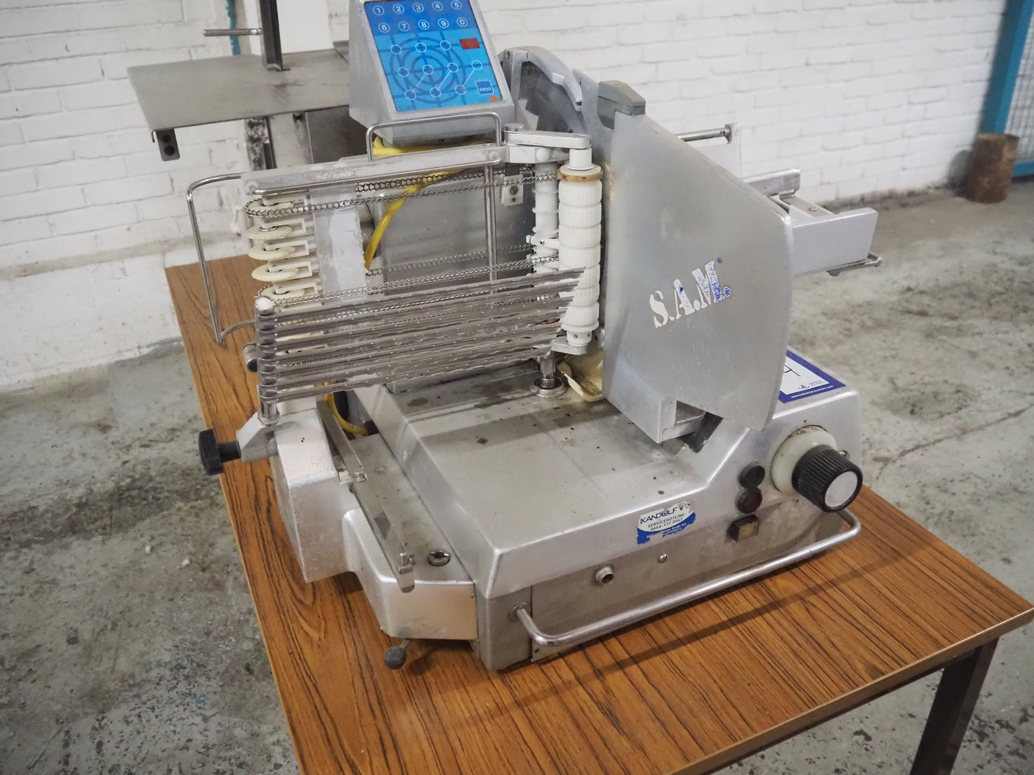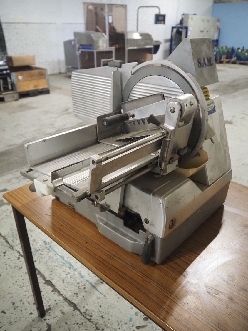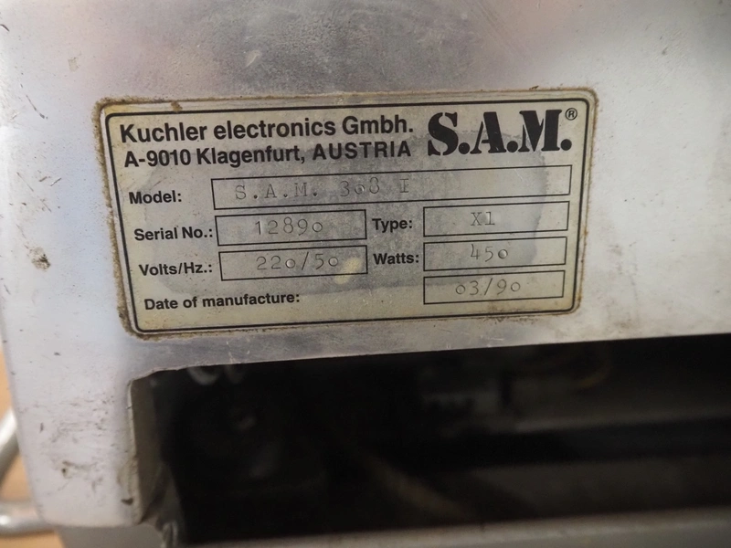 S.A.M. Kuchler electronics GmbH slicer, model: S.A.M. 303 I, type: X1, serial number: 12890, year of construction: 03/1990, 220 V, 50 Hz, 450 W, dimensions: 820 mm x 600 mm x 550 mm.