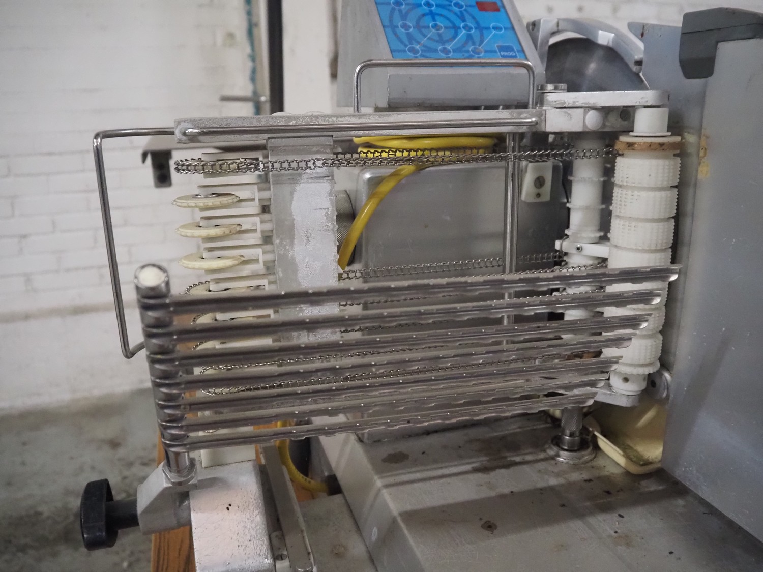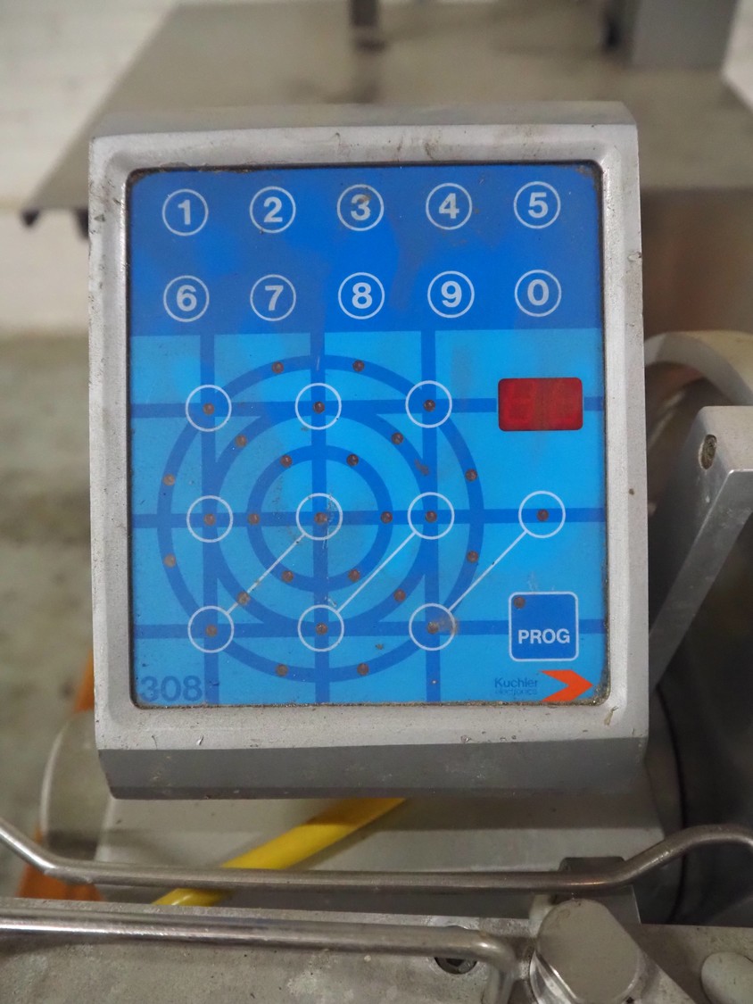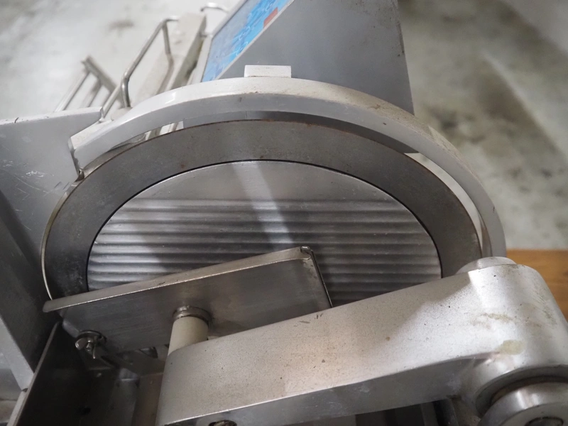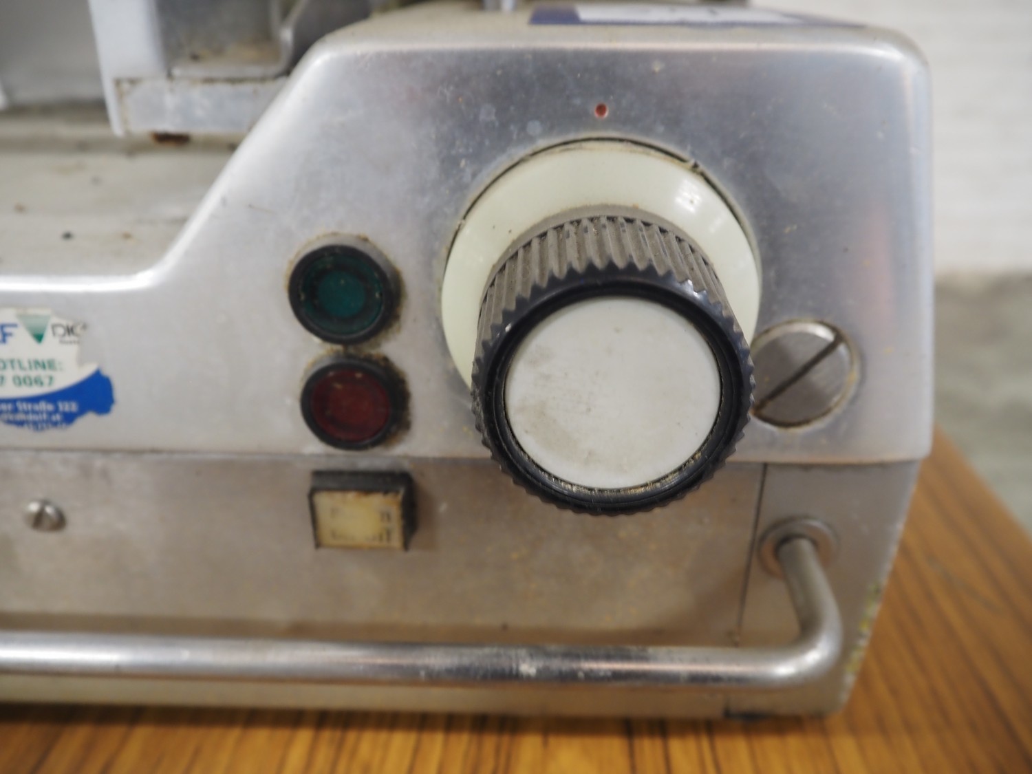 S.A.M. Kuchler electronics GmbH slicer, model: S.A.M. 303 I, type: X1, serial number: 12890, year of construction: 03/1990, 220 V, 50 Hz, 450 W, dimensions: 820 mm x 600 mm x 550 mm.