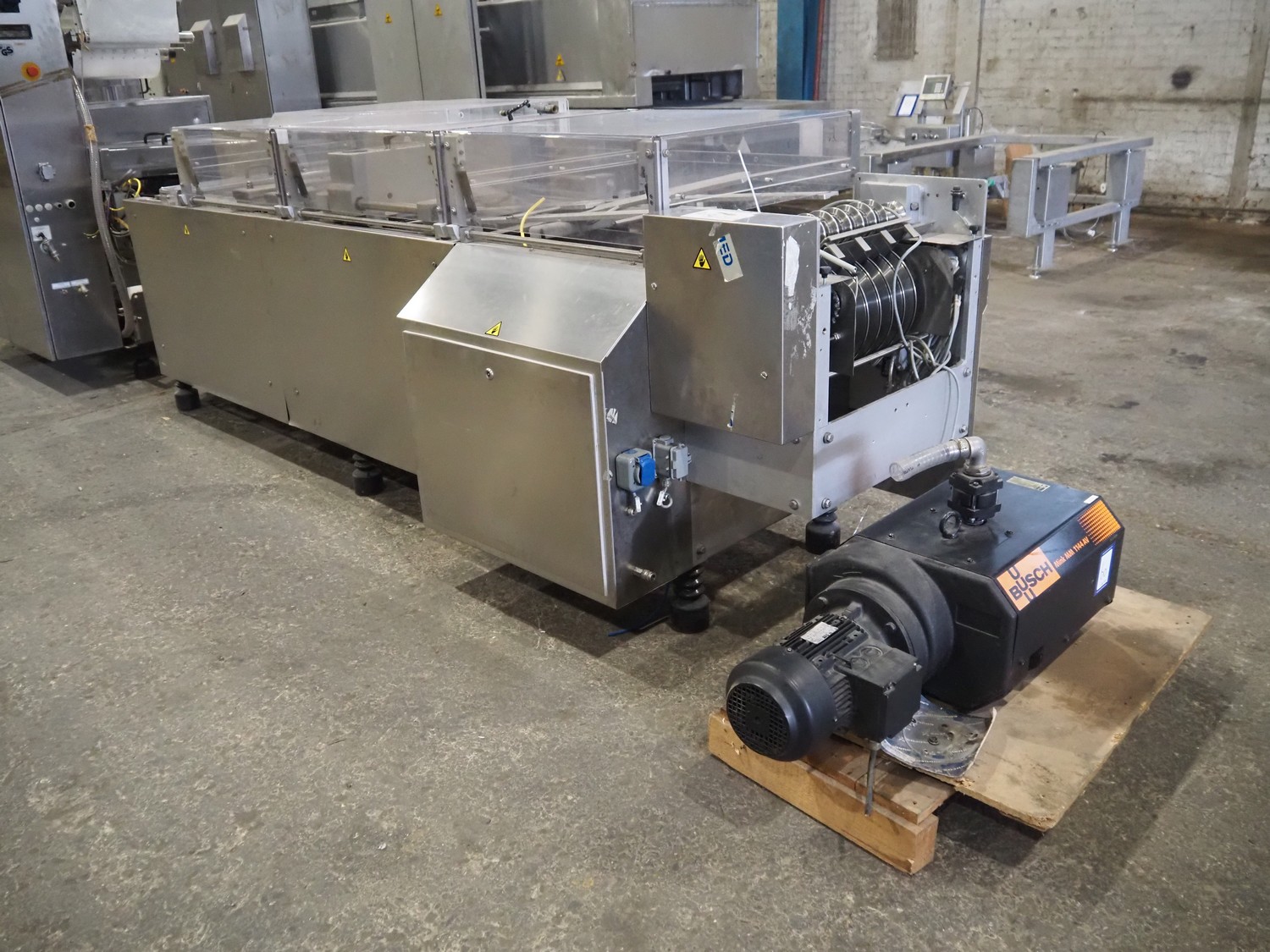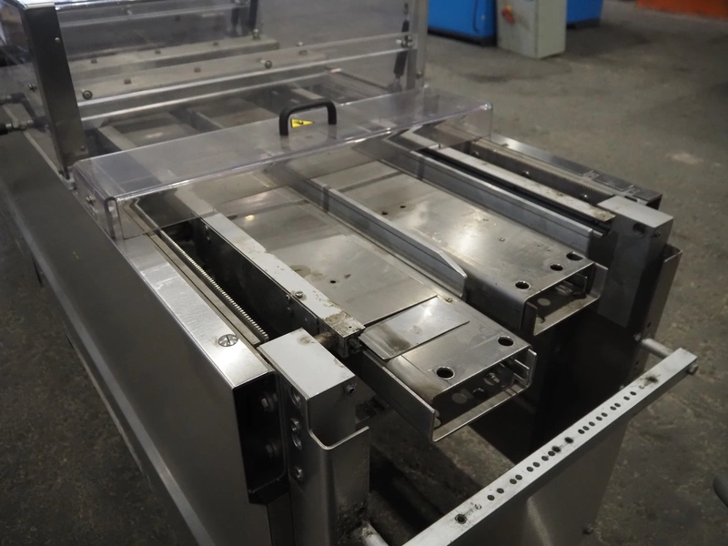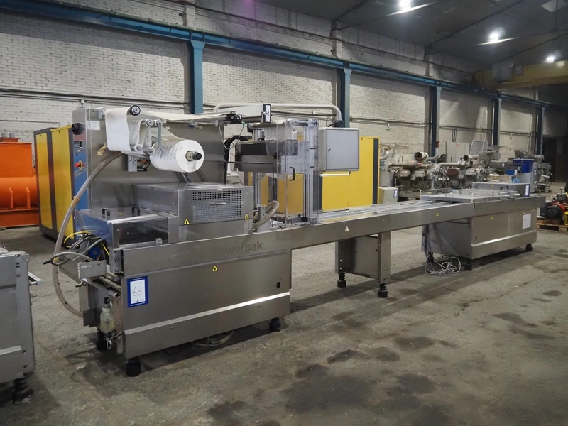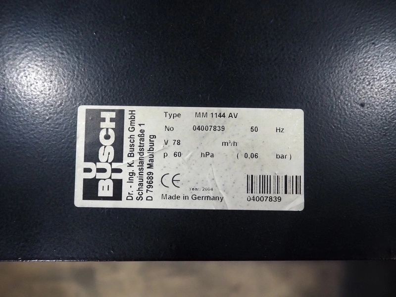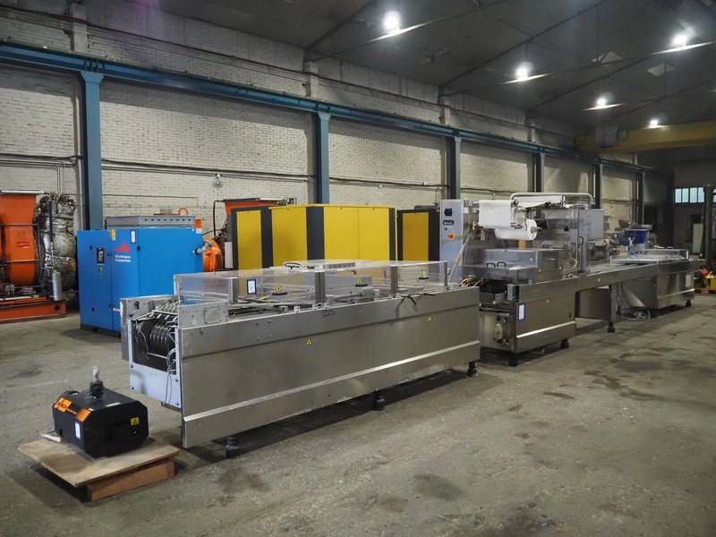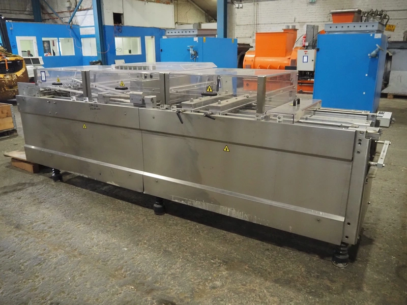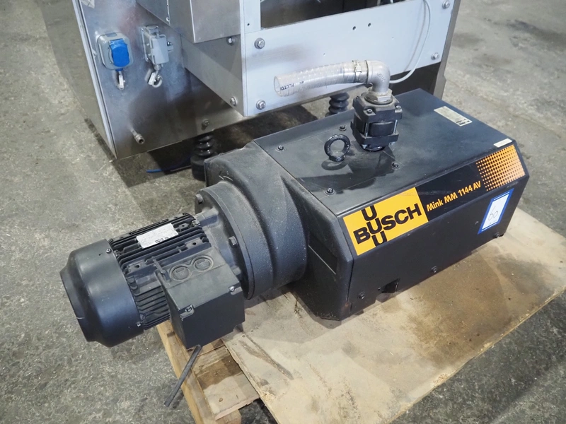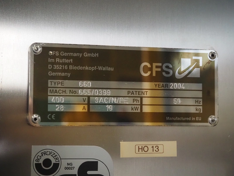 CFS thermoformer, type: 660, machine number: 665/0399, year of construction: 2004, 400 V, 3 Ph, 50 Hz, 28 A, 19 kW, dye: (14x) 230 mm x 30 mm, with Valentin label printer, type: DPM IV 107-12, total dimensions: 7600 mm x 1200 mm x 2000 mm and 3550 mm x 1000 mm x 1550 mm. Including Busch vacuum pump, type: MM 1144 AV, number: 04007839, 78 m³ per hour, and 3 pallets with parts, dye: (4x) 235 mm x 18 mm.
