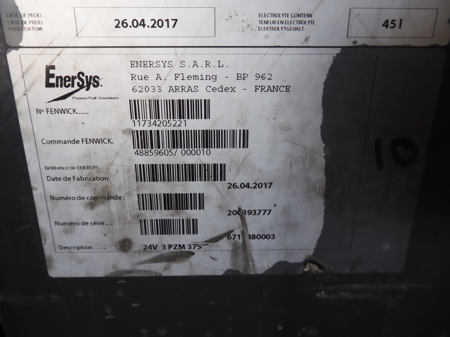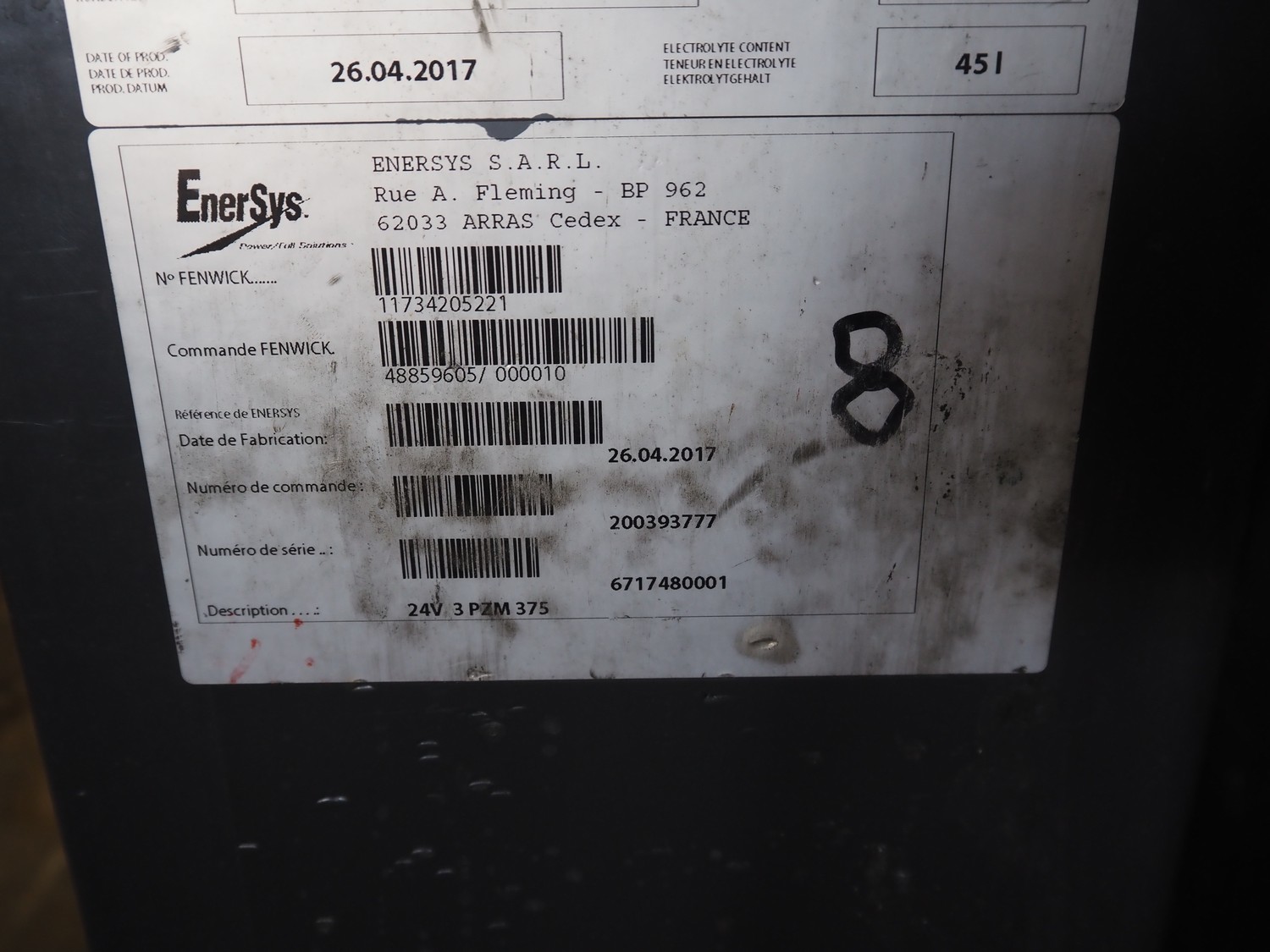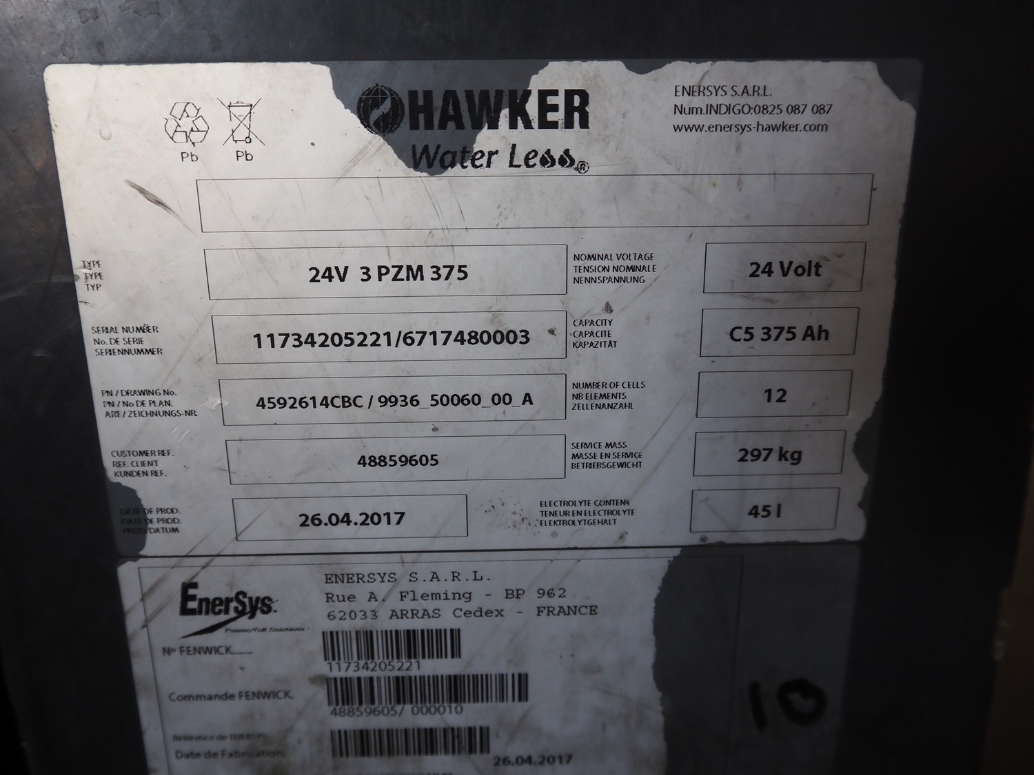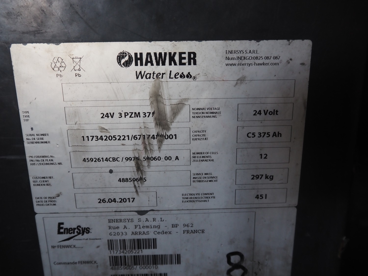 2 Hawker batteries, type: 24V 3 PZM 375, serial number: 11734205221/6717480003, year of construction: 26-04-2017, 24 V, capacity: C5 375 Ah, weight: 297 Kg, dimensions: (2x) 210 mm x 790 mm x 630 mm.