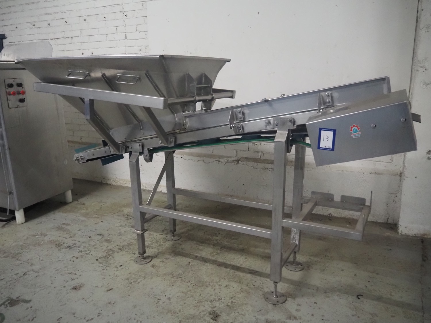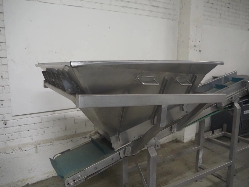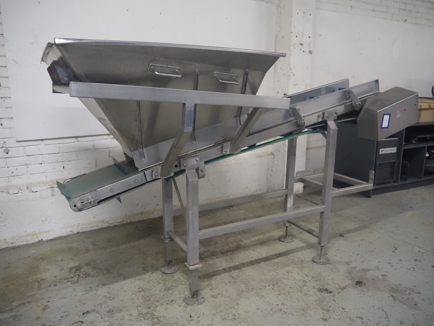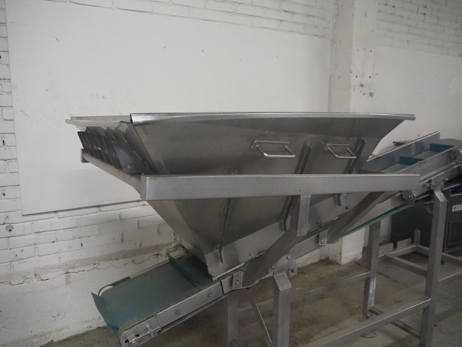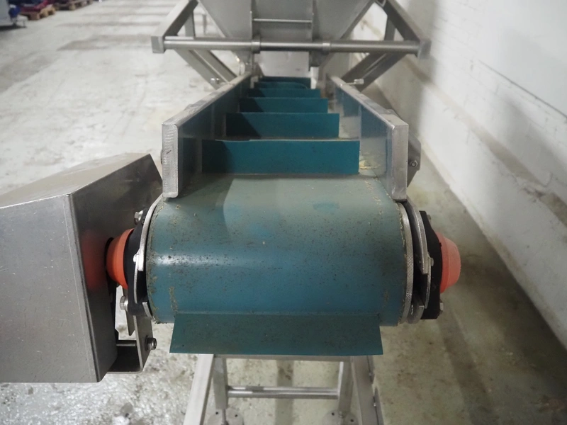 Elevating belt with dividers and infeed hopper, s/s frame, plastic belt, belt width: 300 mm, divider width: 240 mm, distance between dividers: 290 mm, divider height: 50 mm, elevating height: 1200 mm, total dimensions: 2350 mm x 1000 mm x 1450 mm.