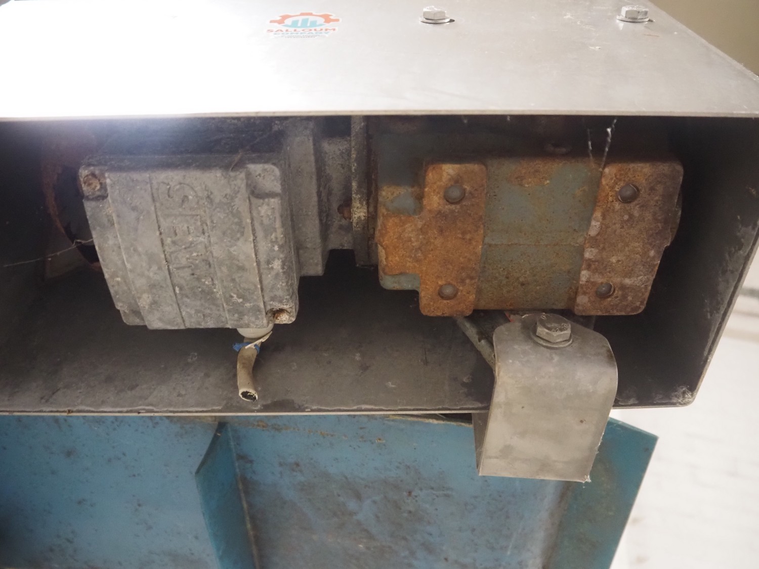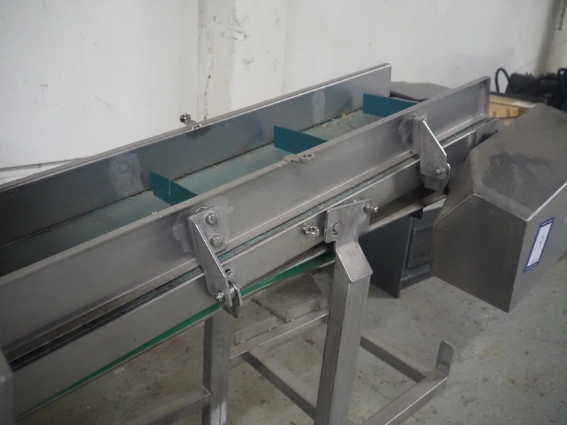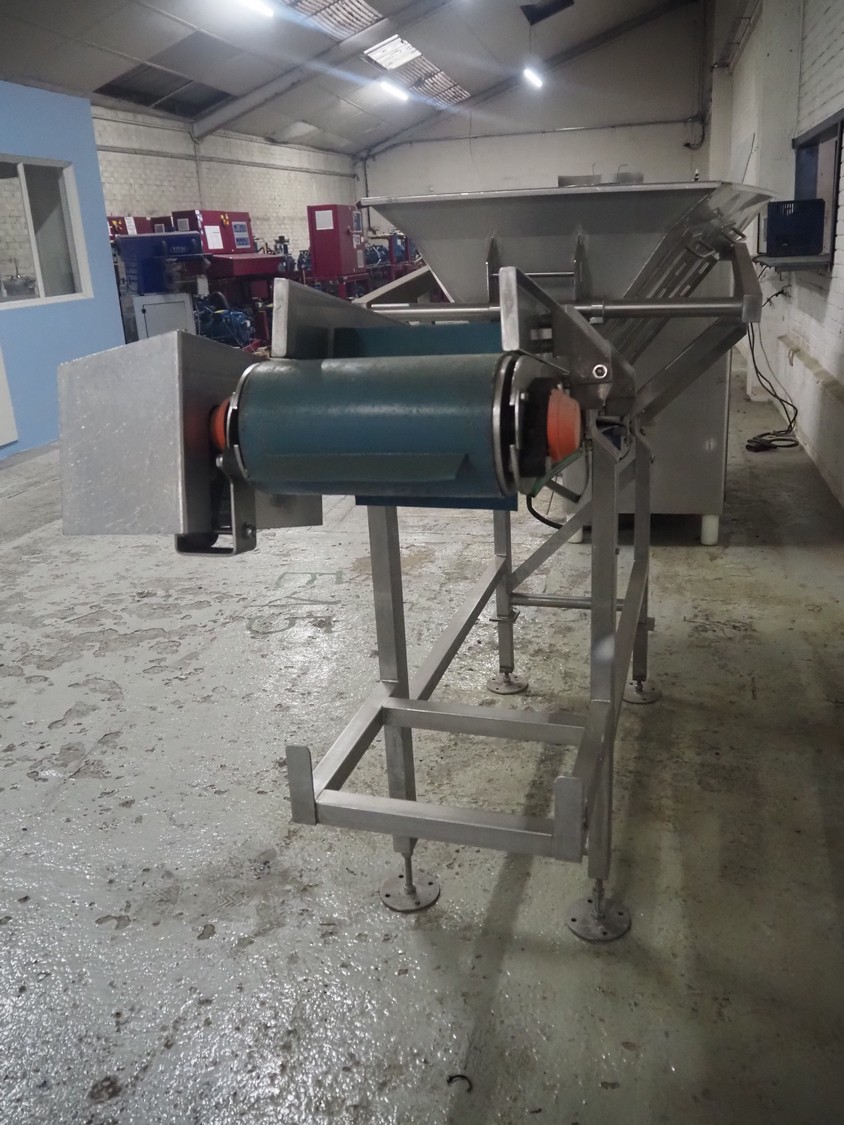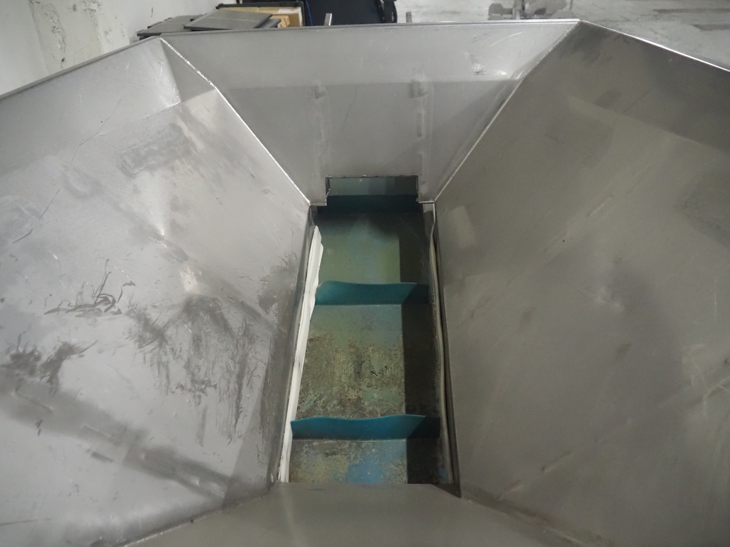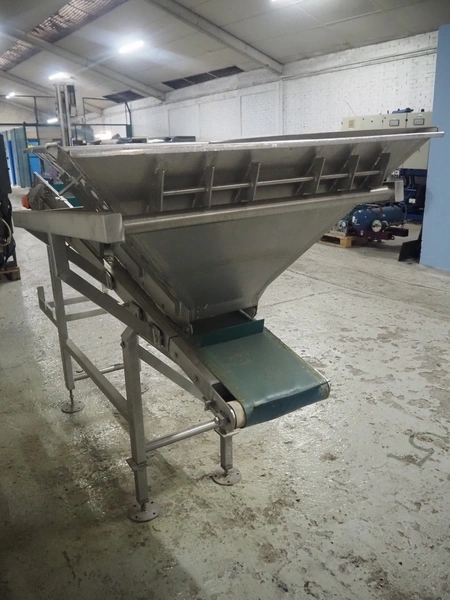 Elevating belt with dividers and infeed hopper, s/s frame, plastic belt, belt width: 300 mm, divider width: 240 mm, distance between dividers: 290 mm, divider height: 50 mm, elevating height: 1200 mm, total dimensions: 2350 mm x 1000 mm x 1450 mm.