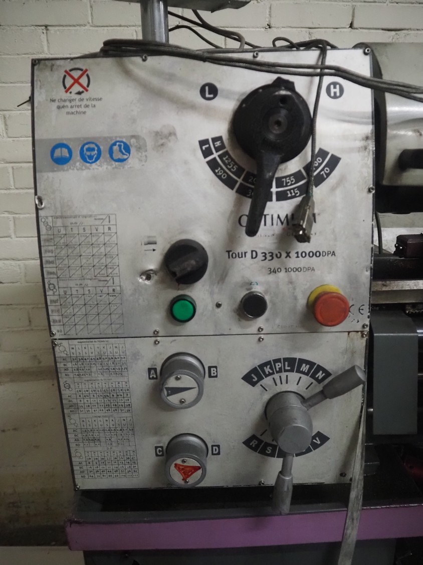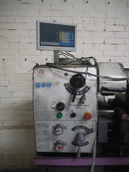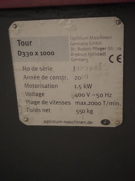 Optimum Maschinen lathe, model: Tour D330 x 1000, serial number: J020945, year of construction: 2010, 400 V, 50 Hz, 1.5 kW, dimensions: 1850 mm x 660 mm x 1600 mm.