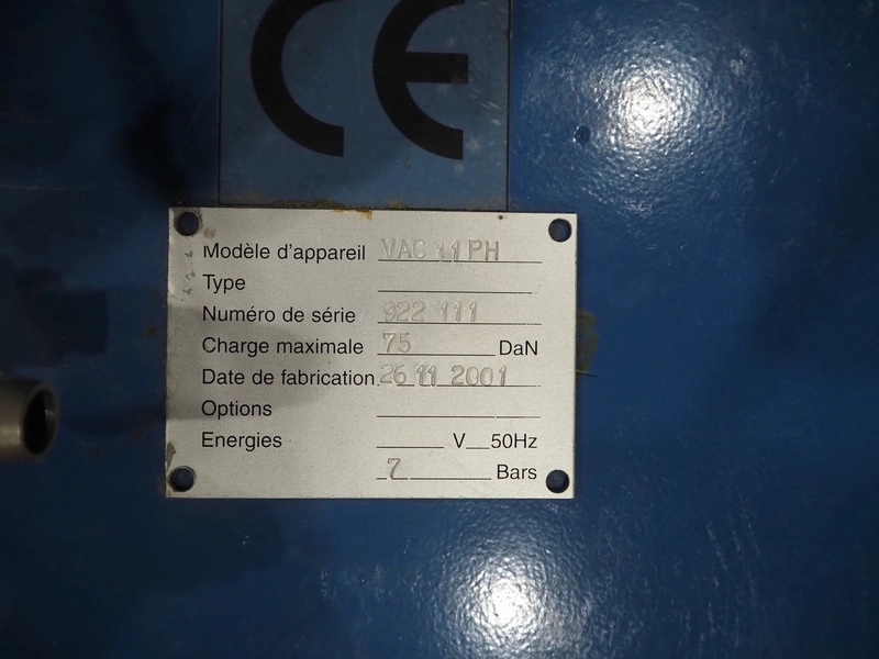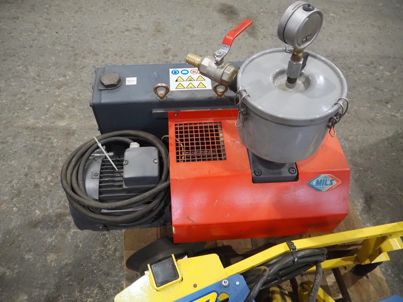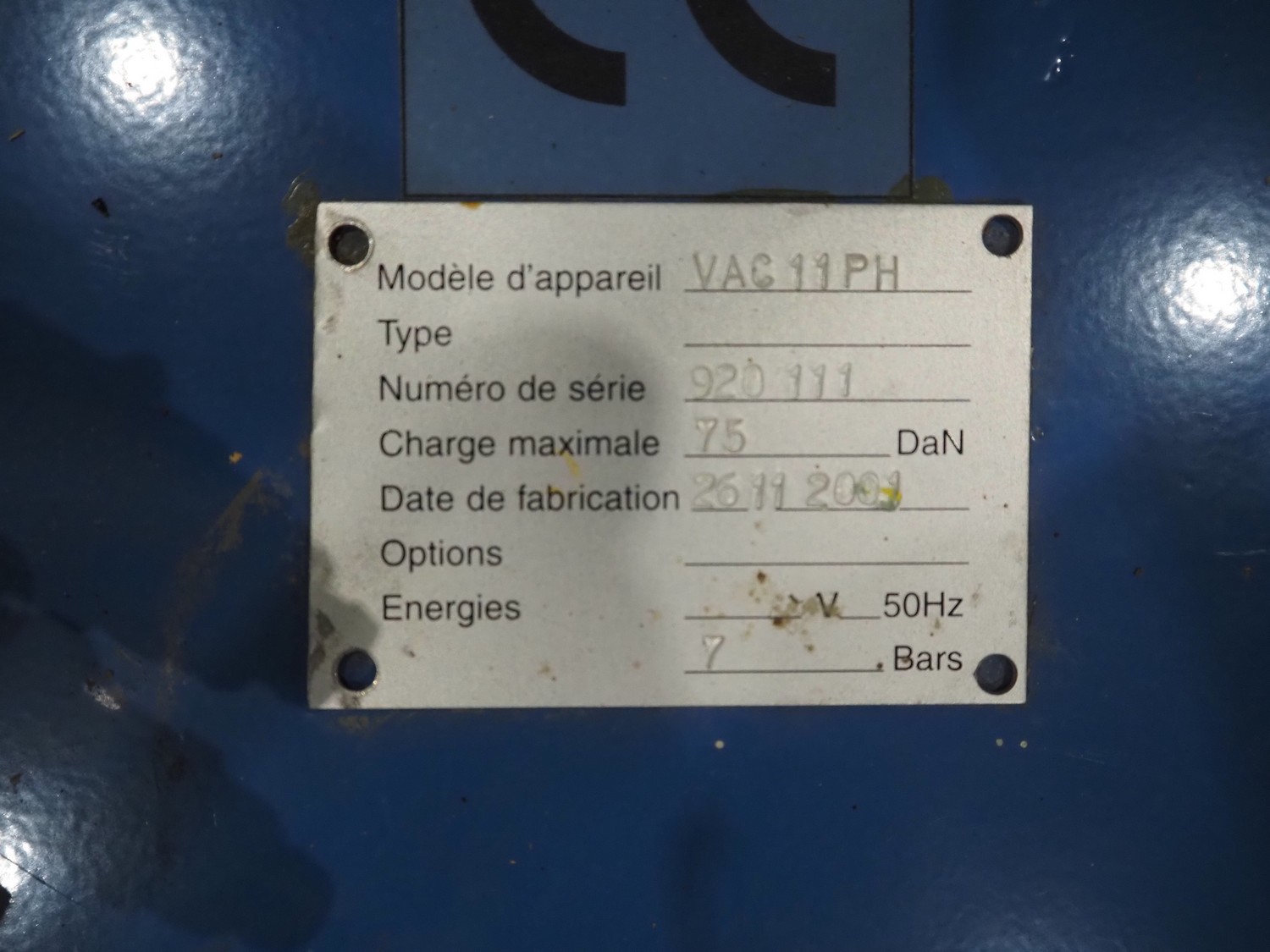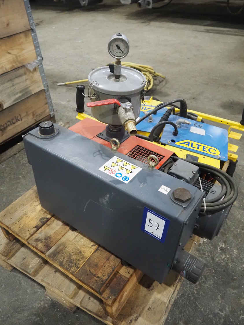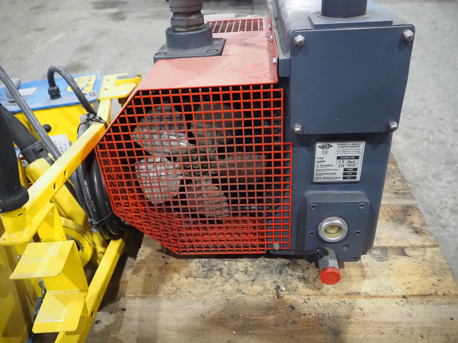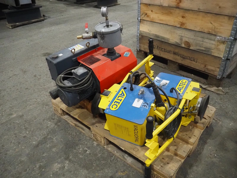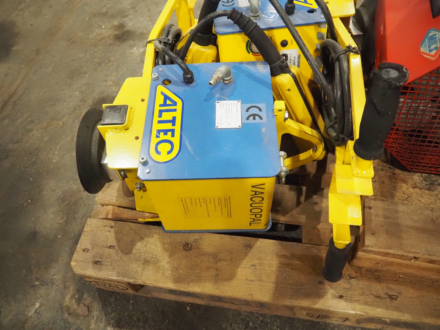 Altec vacuum gripper, consisting of 2 Altec suction cups, model: (2x) VAC11PH, serial number: 920111 and 922111, year of construction: 26-11-2001, with Mil's vacuum pump, type: EVISA E65, machine number: 488/GE065, year of construction: 08/2002, 1450 r.p.m, 0.5 mbar, ⌀ suction nap: (2x) 200 mm, total dimensions: 1200 mm x 800 mm x 1200 mm.