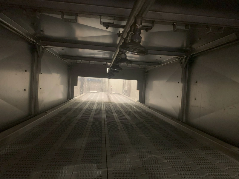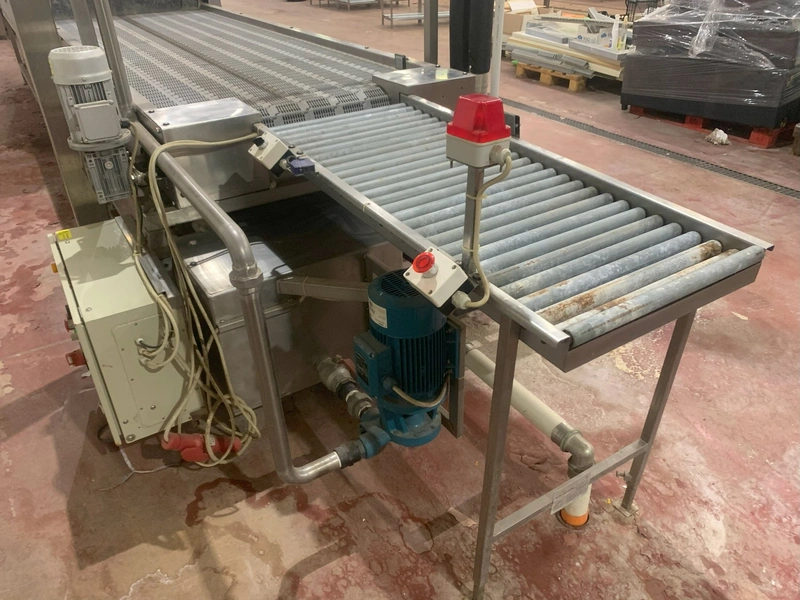 TECHNO GROUP LAB S.R.L. crate washing machine, model: Nastro Tipo "Intralox", serial number: 97/2015, year of construction: 2015, dimensions washing machine: 5950 mm x 1300 mm x 1600 mm, dimensions roller conveyor: 1300 mm x 700 mm x 1300 mm.