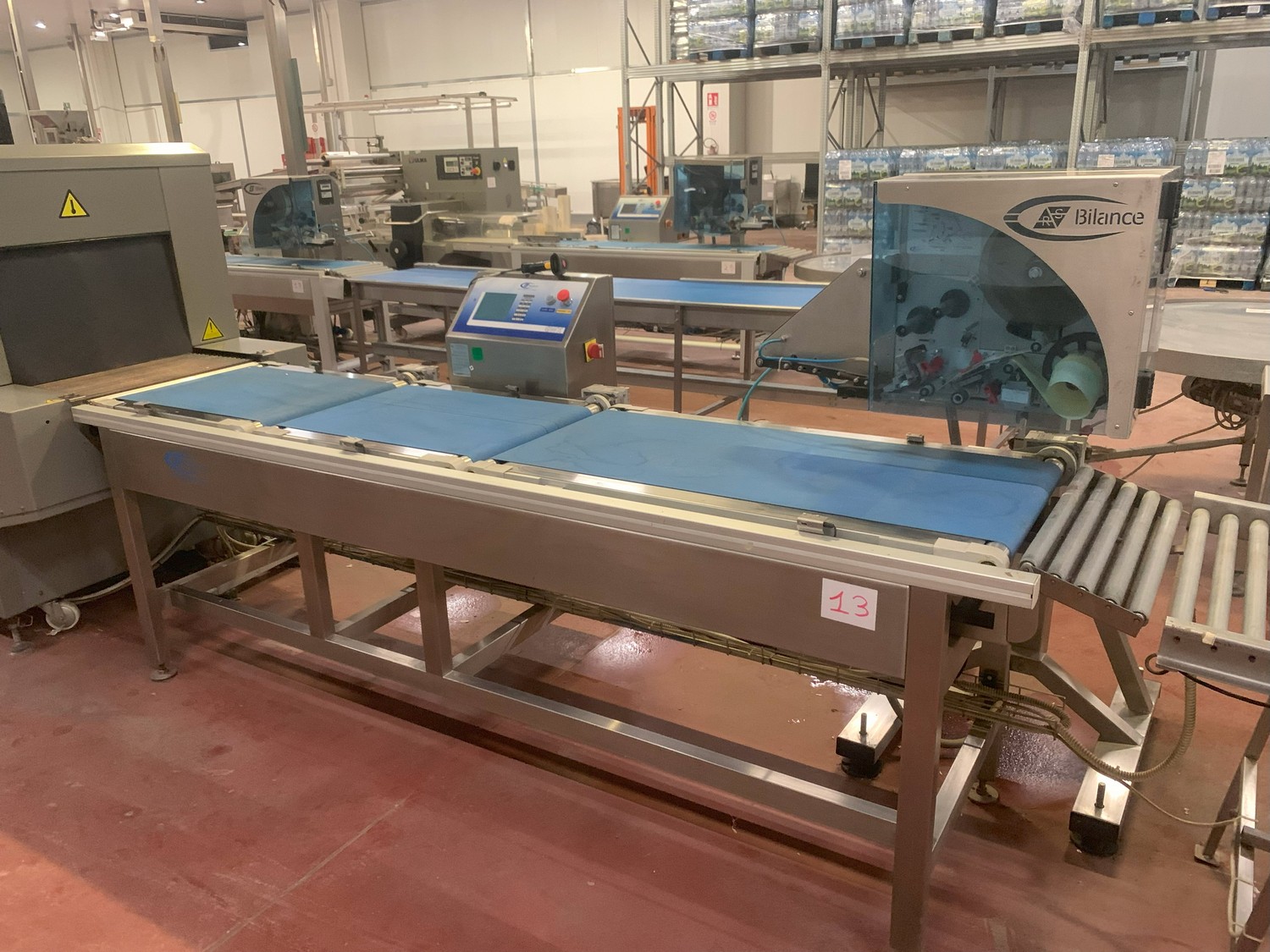 R.S. BILANCE s.n.c. weighing and labelling machine, model: GWX16B3DX, serial number: 0152015, 230 V, 50-60 Hz, minimum weight: 100 gram, maximum weight: 15000 gram, d= 5 gram, maximum rate: 55 units/min, maximum speed: 0.917 m/s, dimensions: 2850 mm x 1400 mm x 1500 mm.