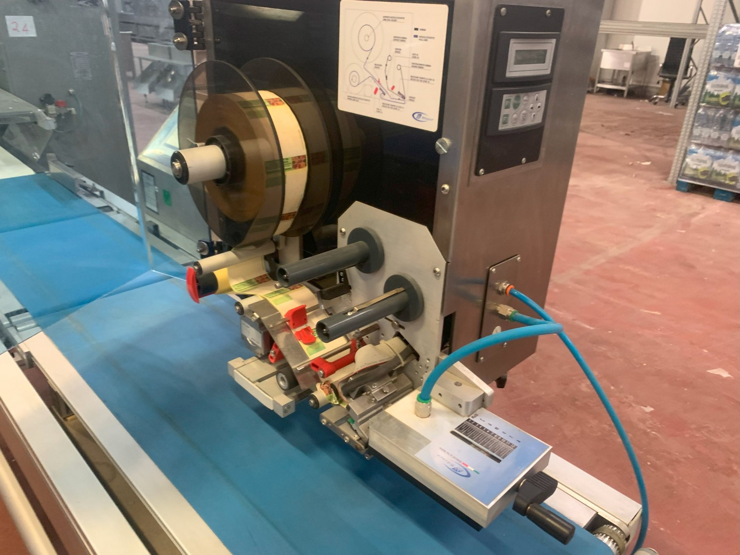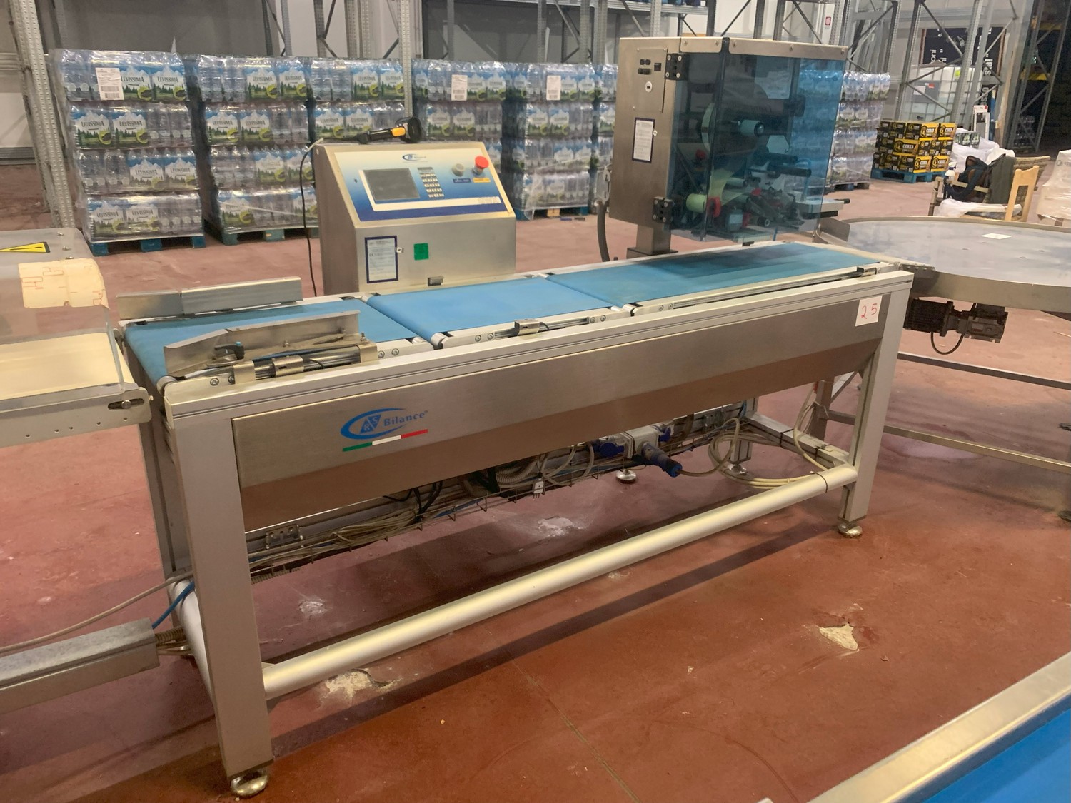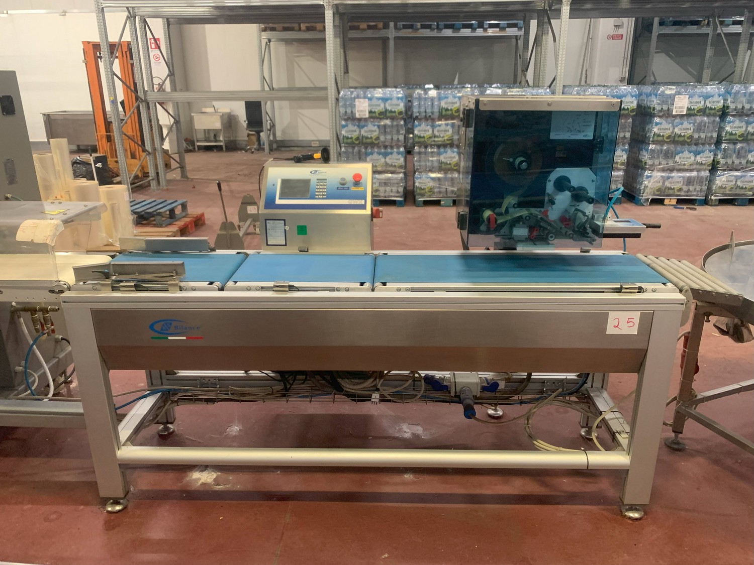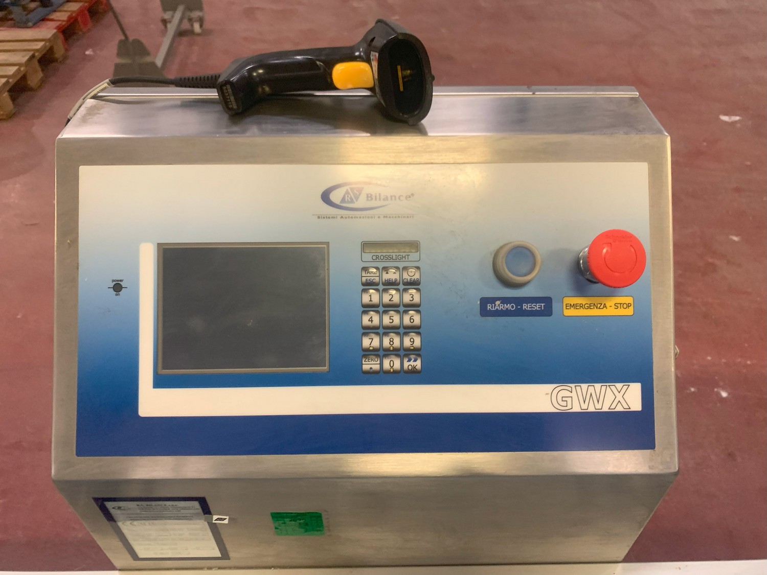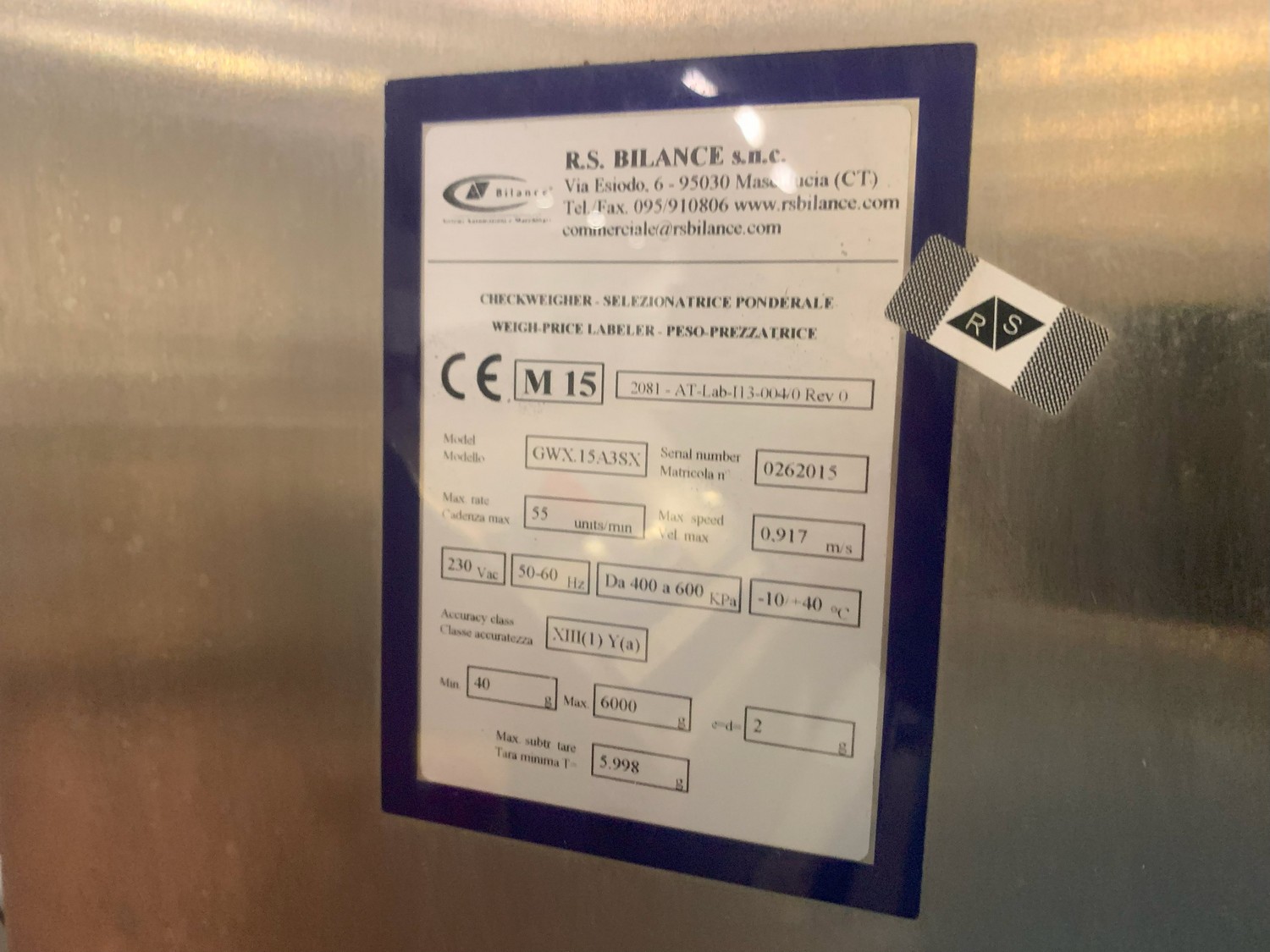 R.S. BILANCE s.n.c. weighing and labelling machine, model: GWX15A3SX, serial number: 0262015, 230 V, 50-60 Hz, minimum weight: 40 gram, maximum weight: 6000 gram, d= 2 gram, maximum rate: 55 units/min, maximum speed: 0.917 m/s, dimensions: 2250 mm x 1500 mm x 1500 mm.