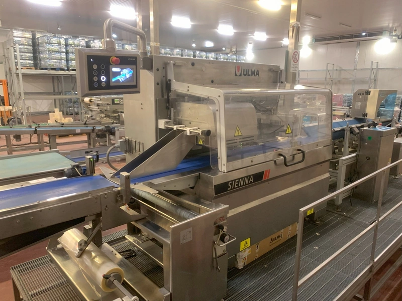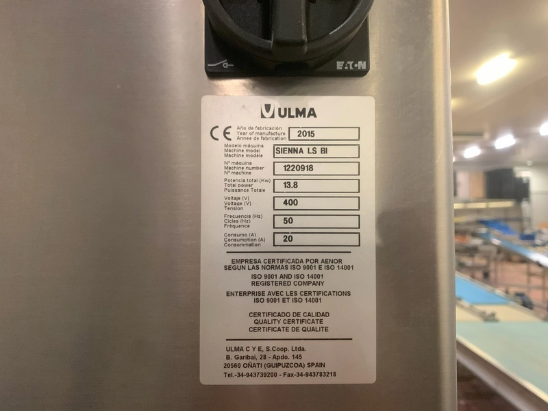 Ulma horizontal flow pack wrapper, model: SIENNA LS BI, machine number: 1220918, year of construction: 2015, 400 V, 50 Hz, 13.8 kW, 20 A, dimensions flow pack machine: 3000 mm x 1500 mm x 1900 mm, including infeed conveyor, dimensions: 2450 mm x 700 mm x 900 mm.