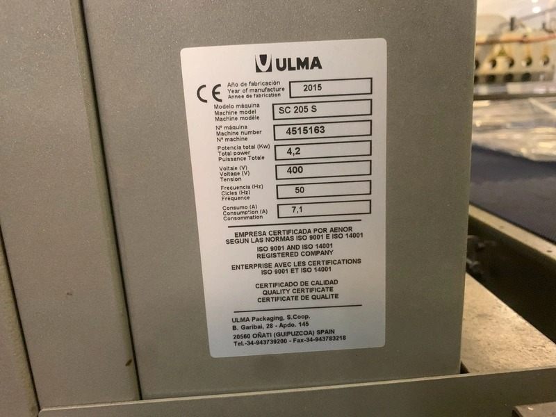 Ulma automatic side seal machine, model: SC 205 S, machine number: 4515163, year of construction: 2015, 400 V, 50 Hz, 4.2 kW, 7.1 A, dimensions: 2000 mm x 1950 mm x 1350 mm.
