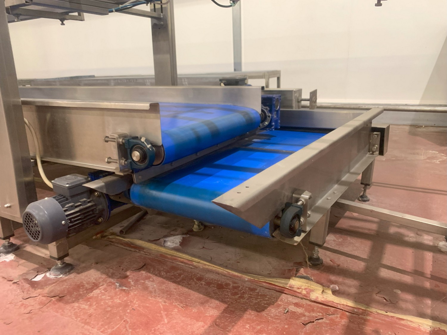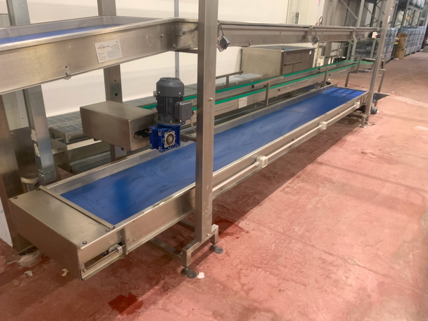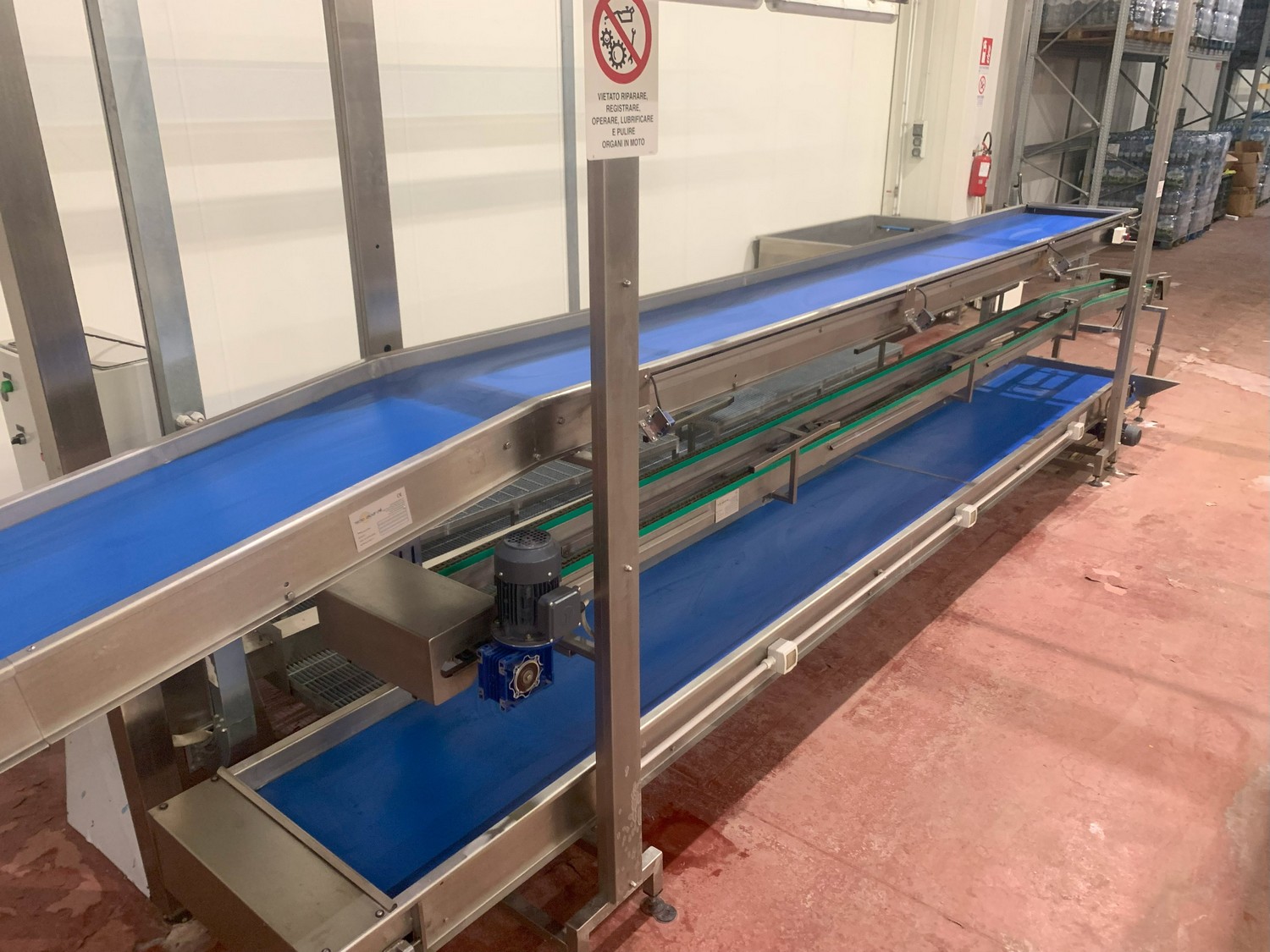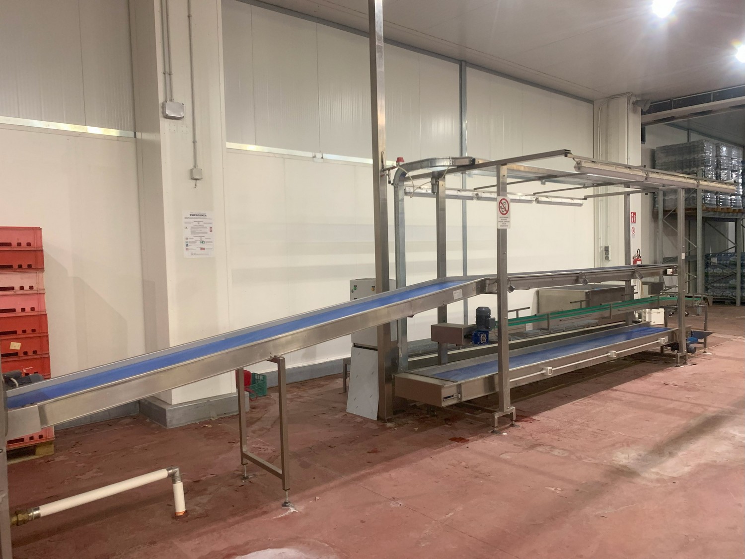 TECHNO GROUP LAB S.R.L. crate packaging conveyor, s/s frame, plastic belts, year of construction: 2015, dimensions: 1020 mm x 2300 mm x 2400 mm.
