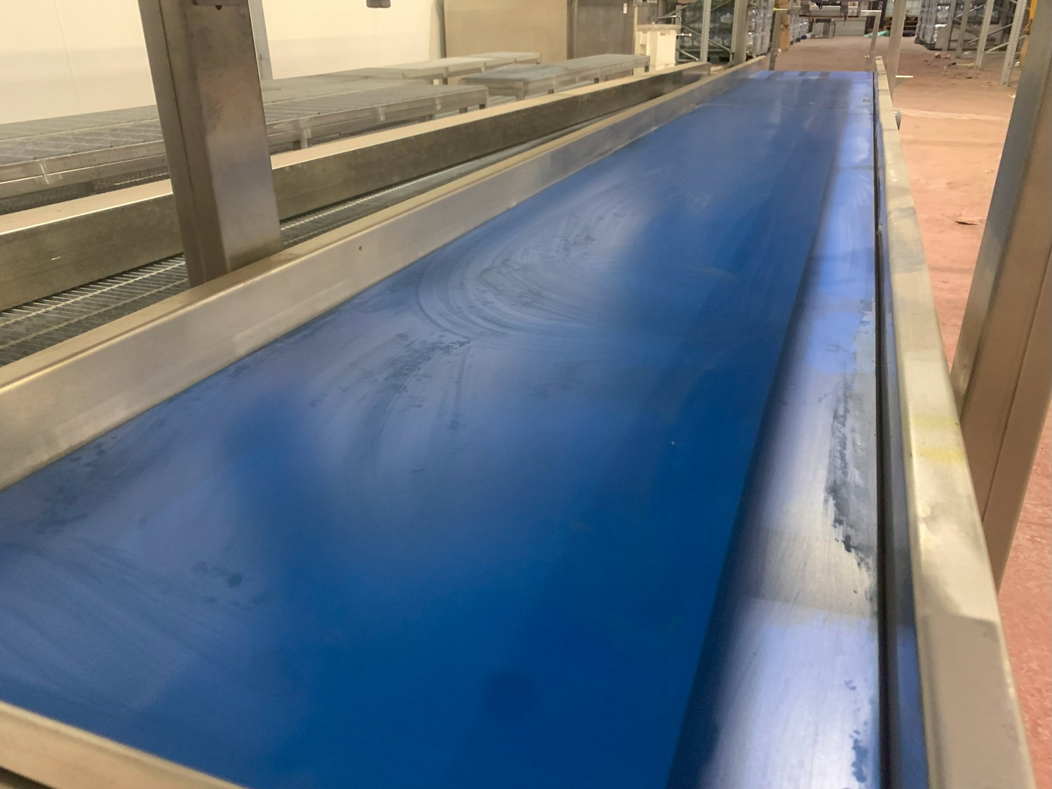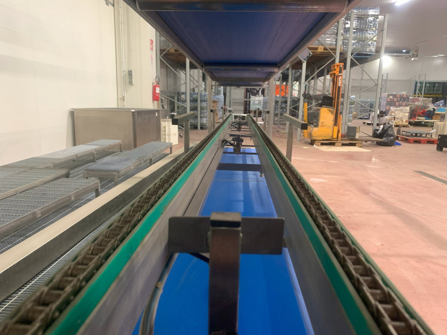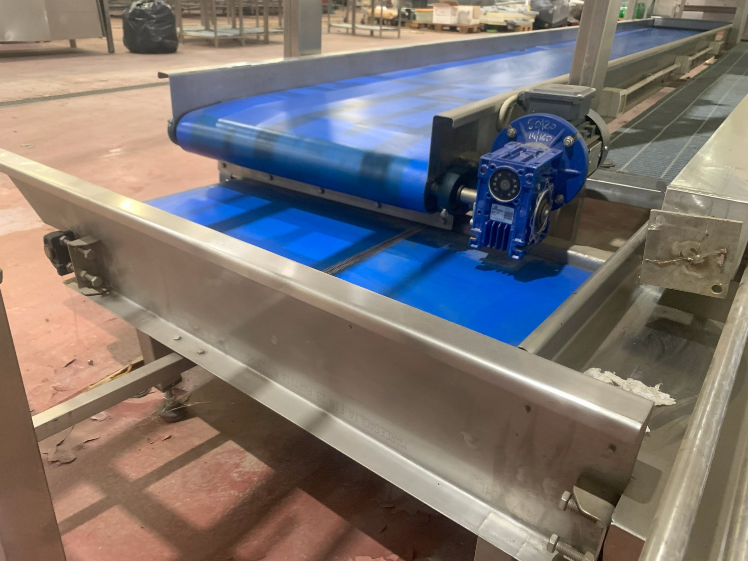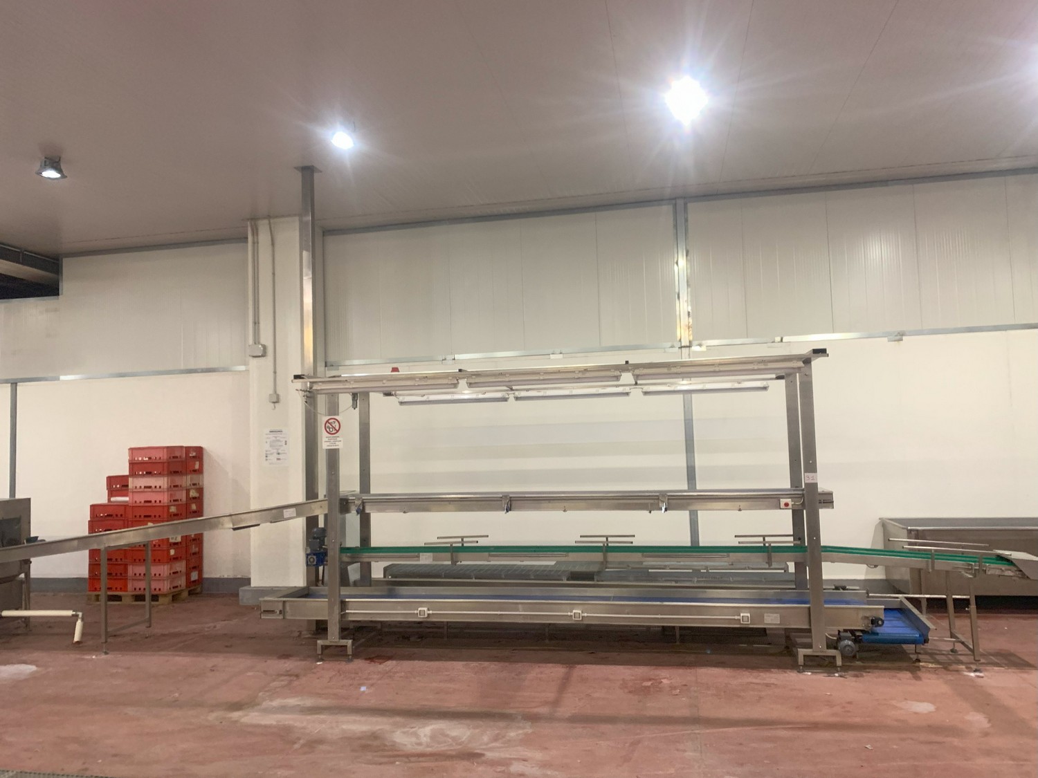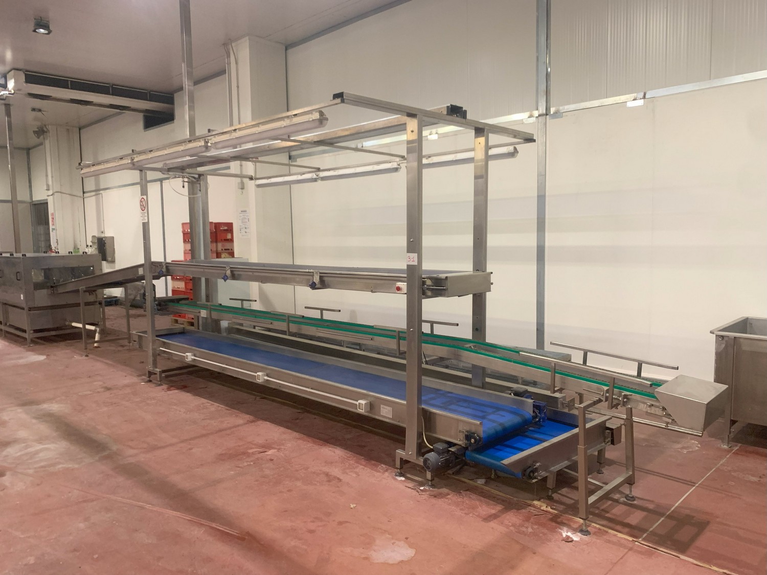 TECHNO GROUP LAB S.R.L. crate packaging conveyor, s/s frame, plastic belts, year of construction: 2015, dimensions: 1020 mm x 2300 mm x 2400 mm.