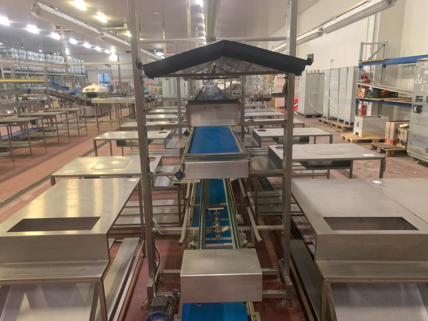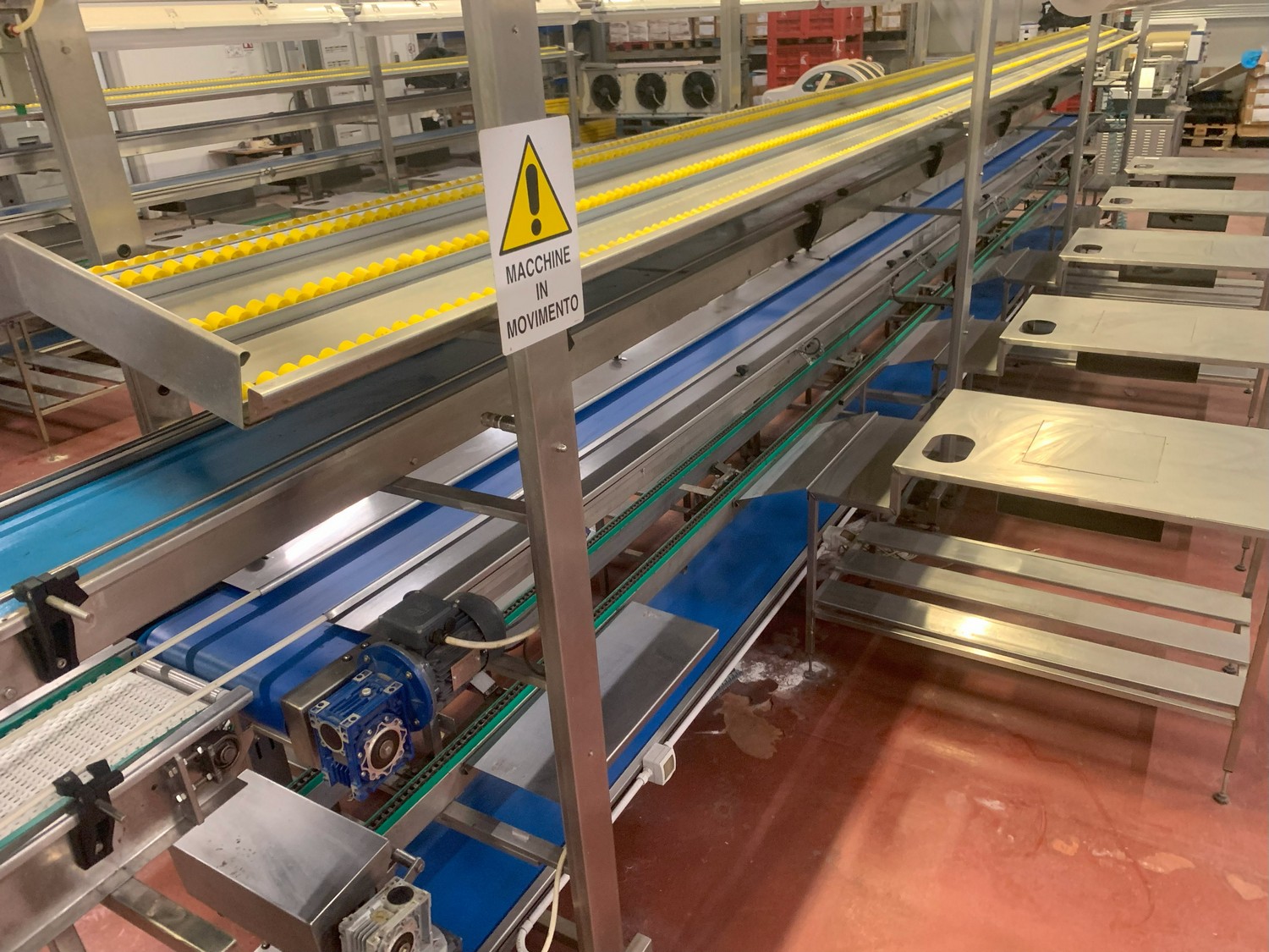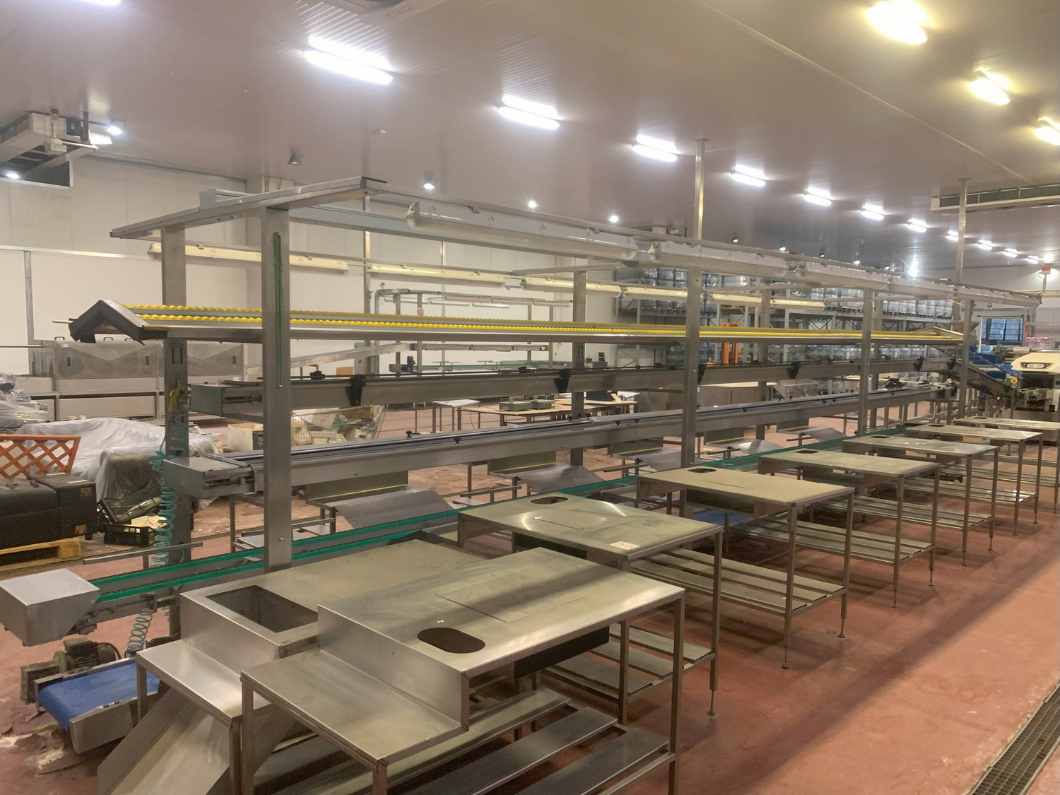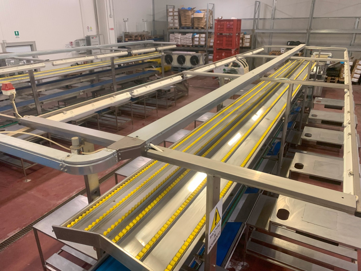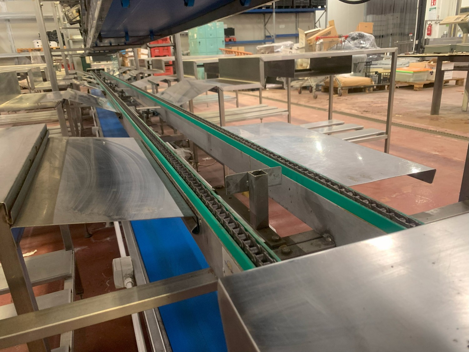 TECHNO GROUP LAB S.R.L. double crate un-packaging conveyor, s/s frame, plastic belts, year of construction: 2015, dimensions: 15150 mm x 2700 mm x 2500 mm and 13150 mm x 2700 mm x 250 mm.