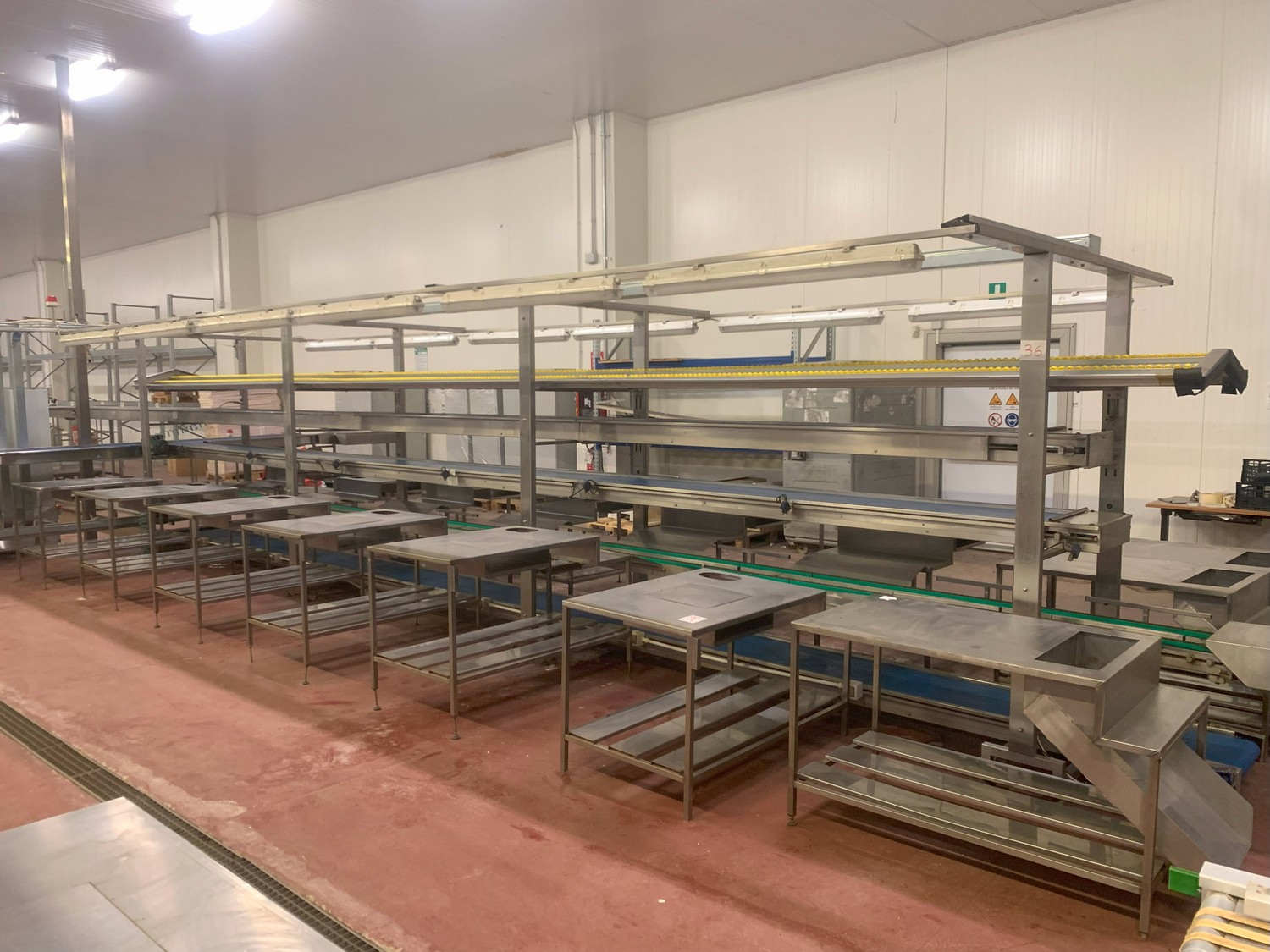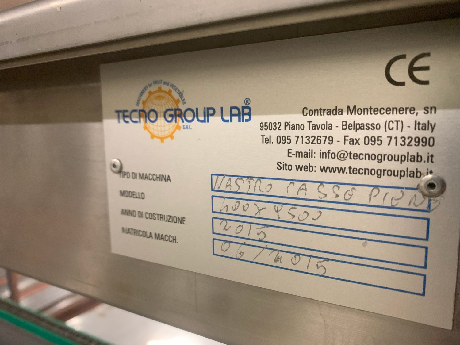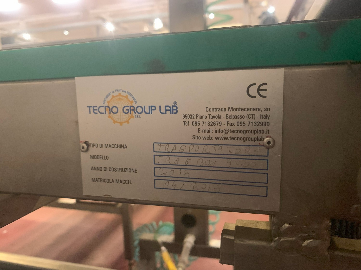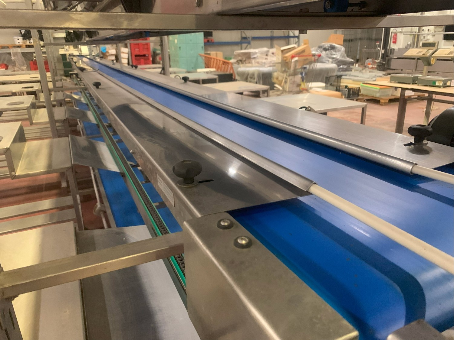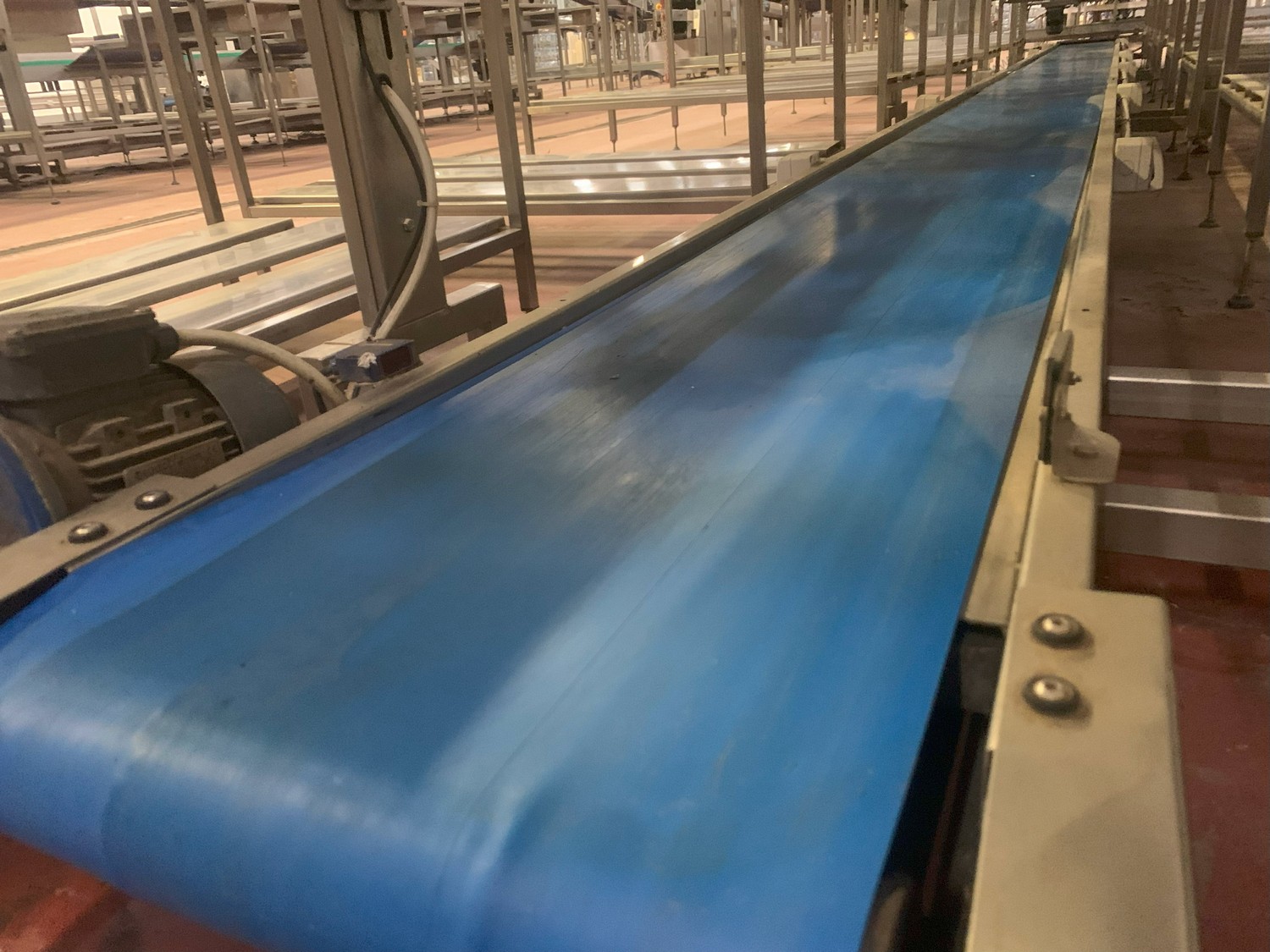 TECHNO GROUP LAB S.R.L. double crate un-packaging conveyor, s/s frame, plastic belts, year of construction: 2015, dimensions: 15150 mm x 2700 mm x 2500 mm and 13150 mm x 2700 mm x 250 mm.