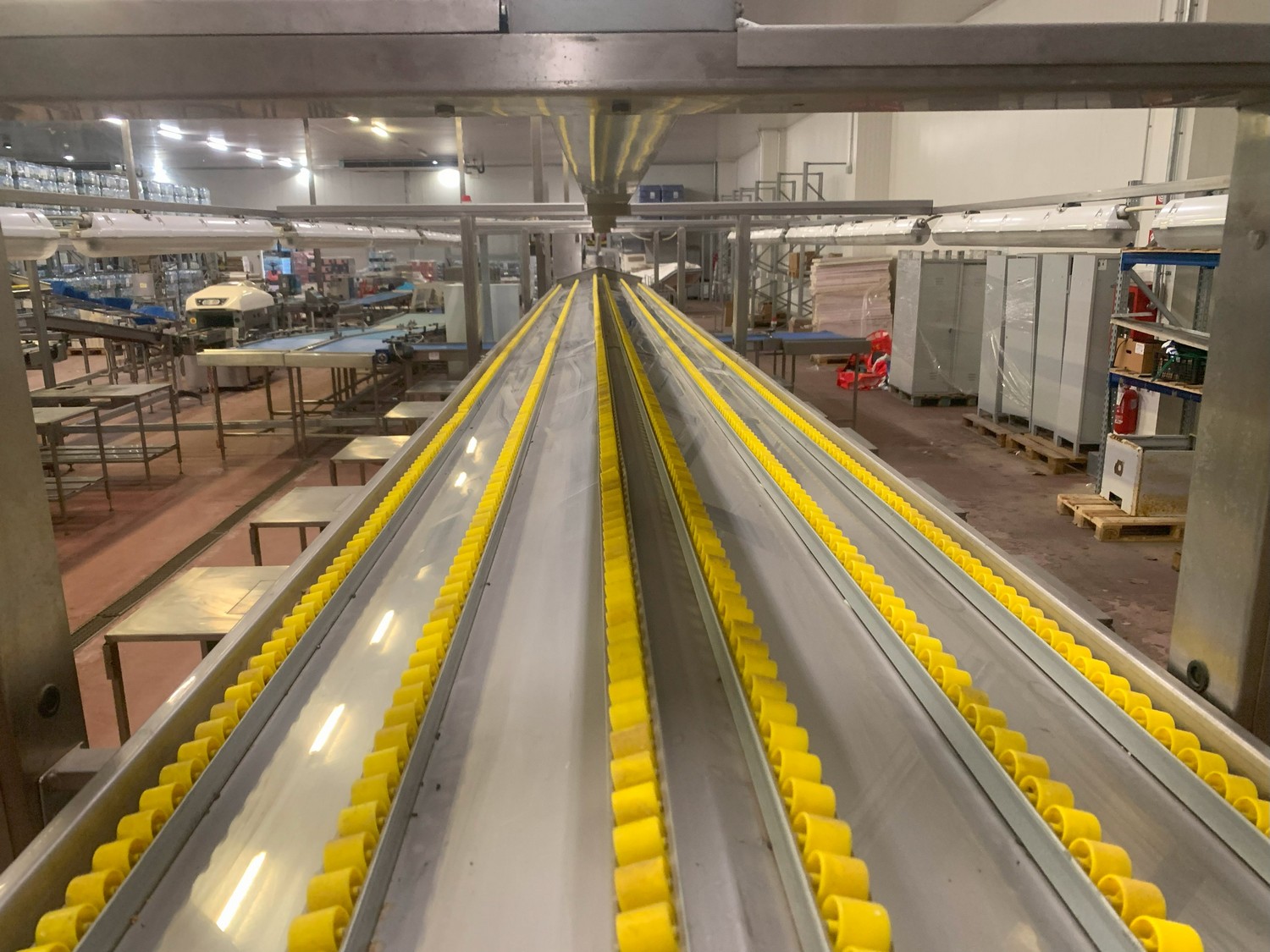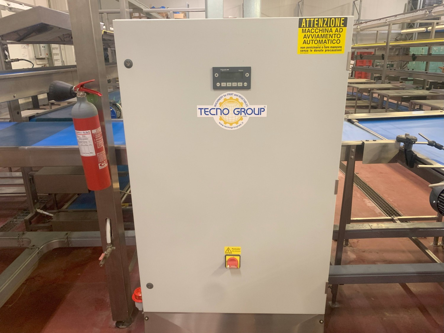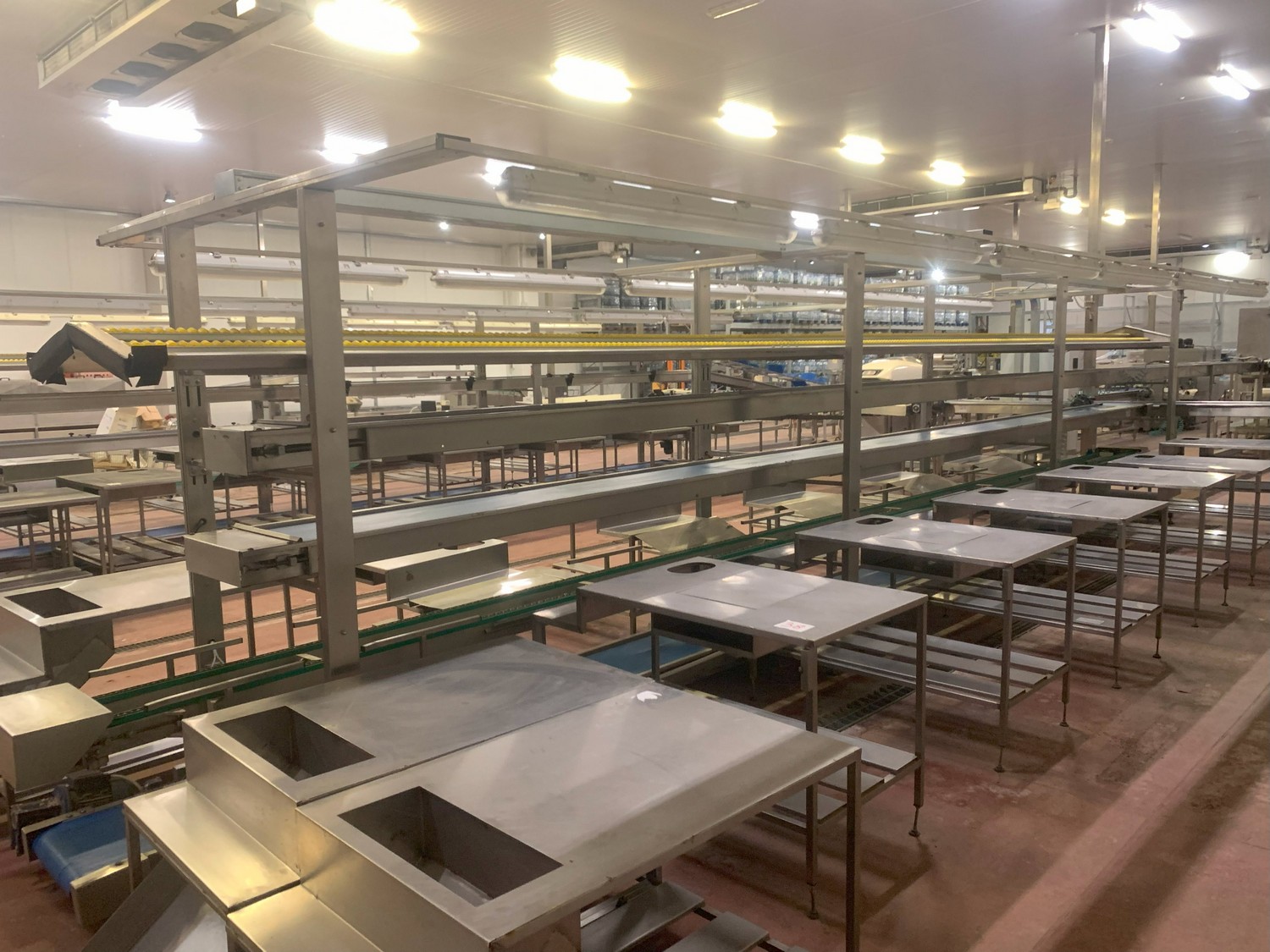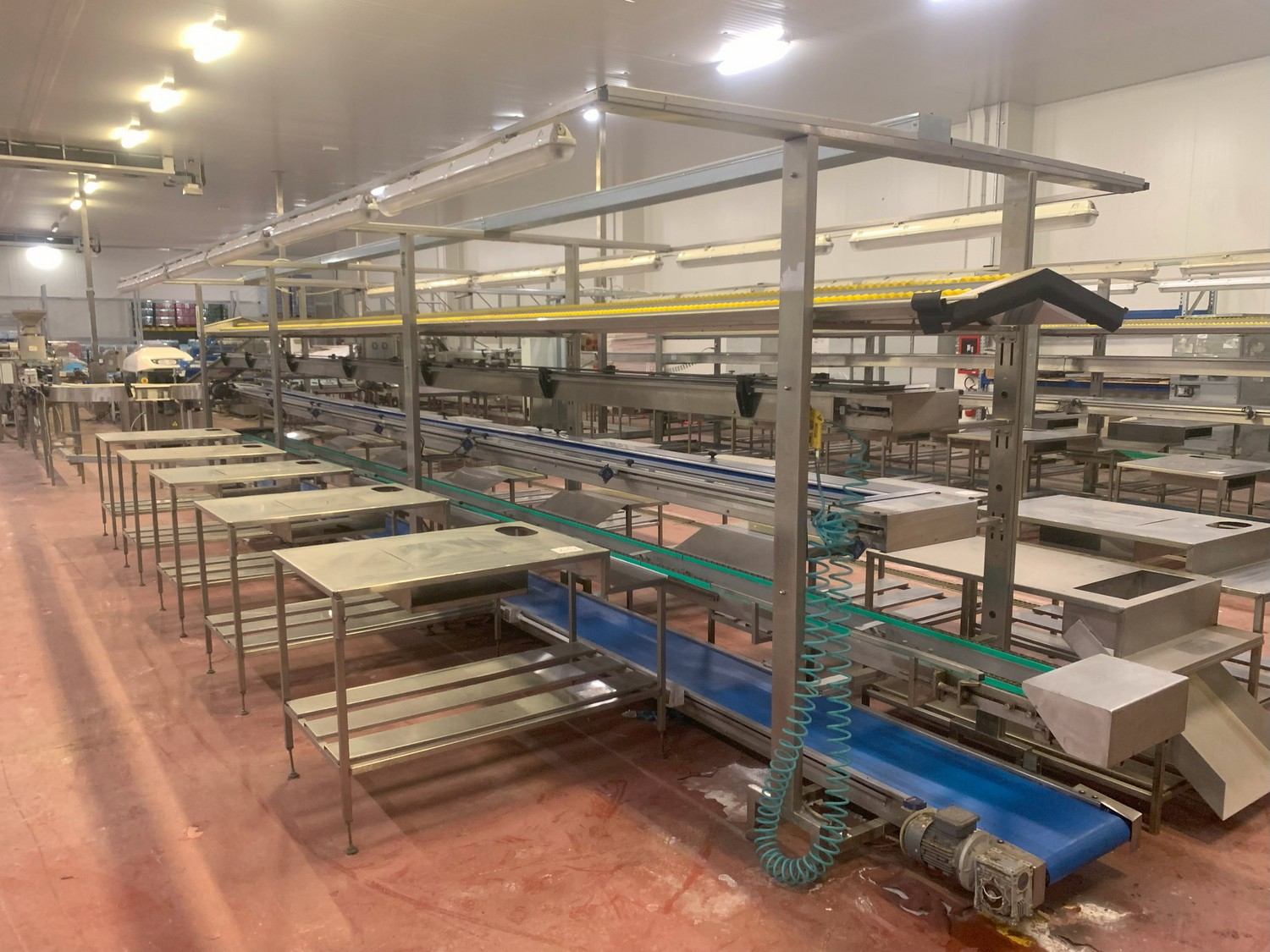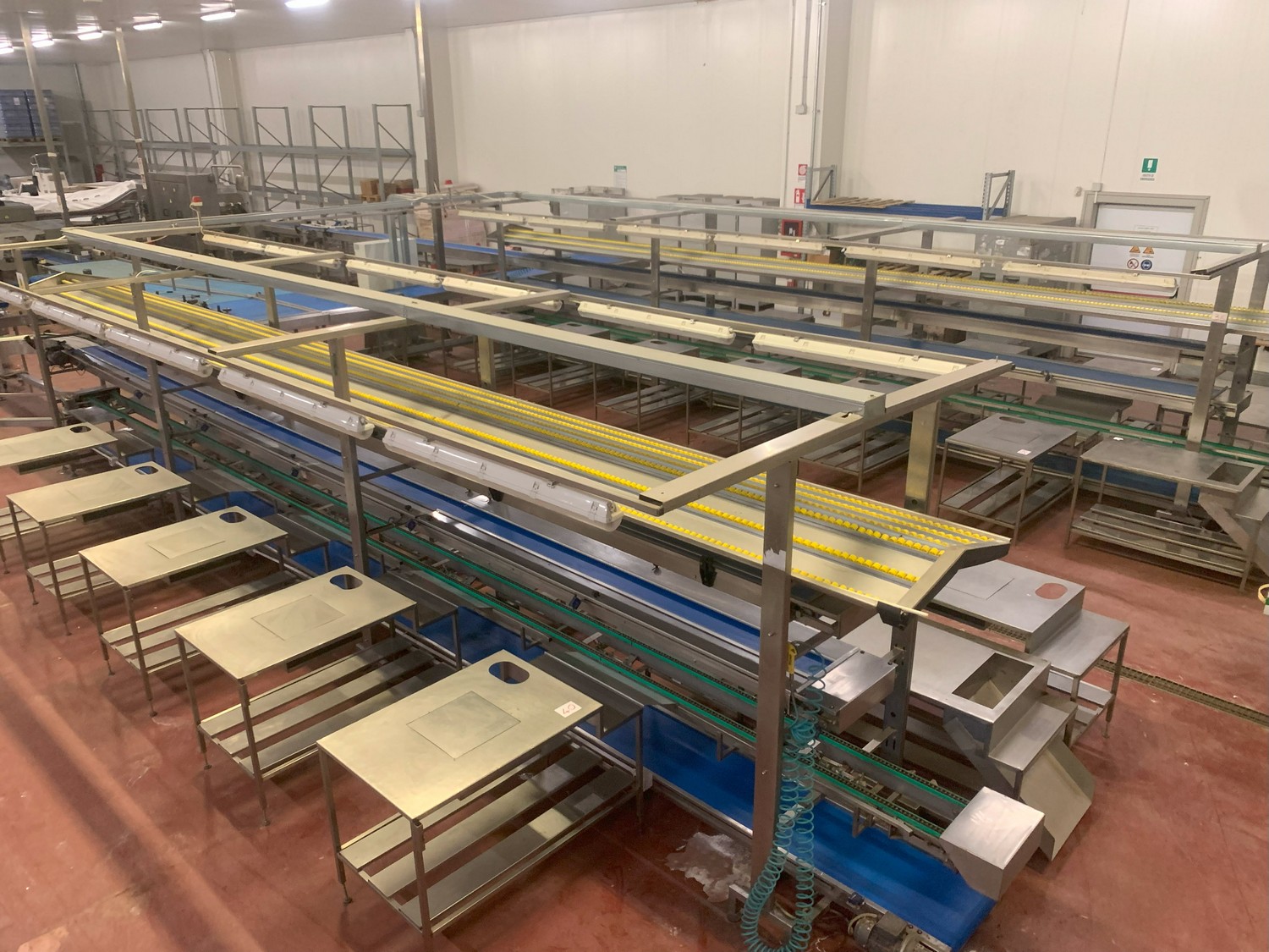 TECHNO GROUP LAB S.R.L. double crate un-packaging conveyor, s/s frame, plastic belts, year of construction: 2015, dimensions: 15150 mm x 2700 mm x 2500 mm and 13150 mm x 2700 mm x 250 mm.