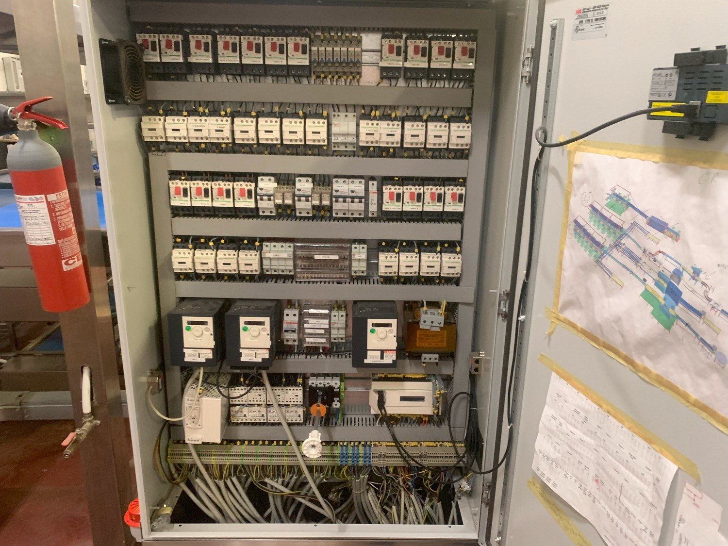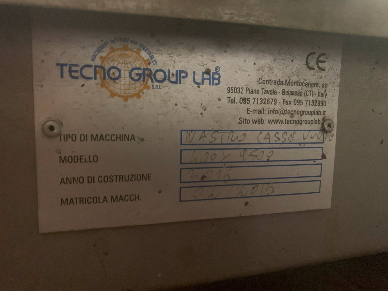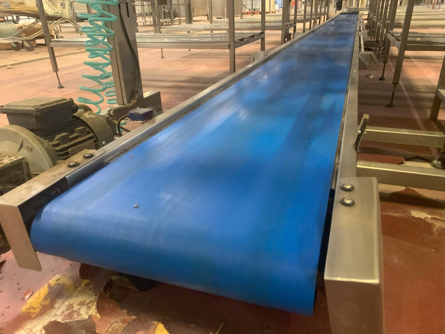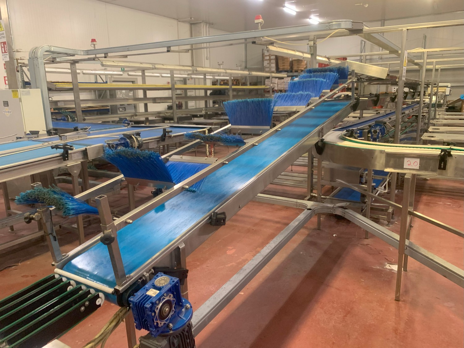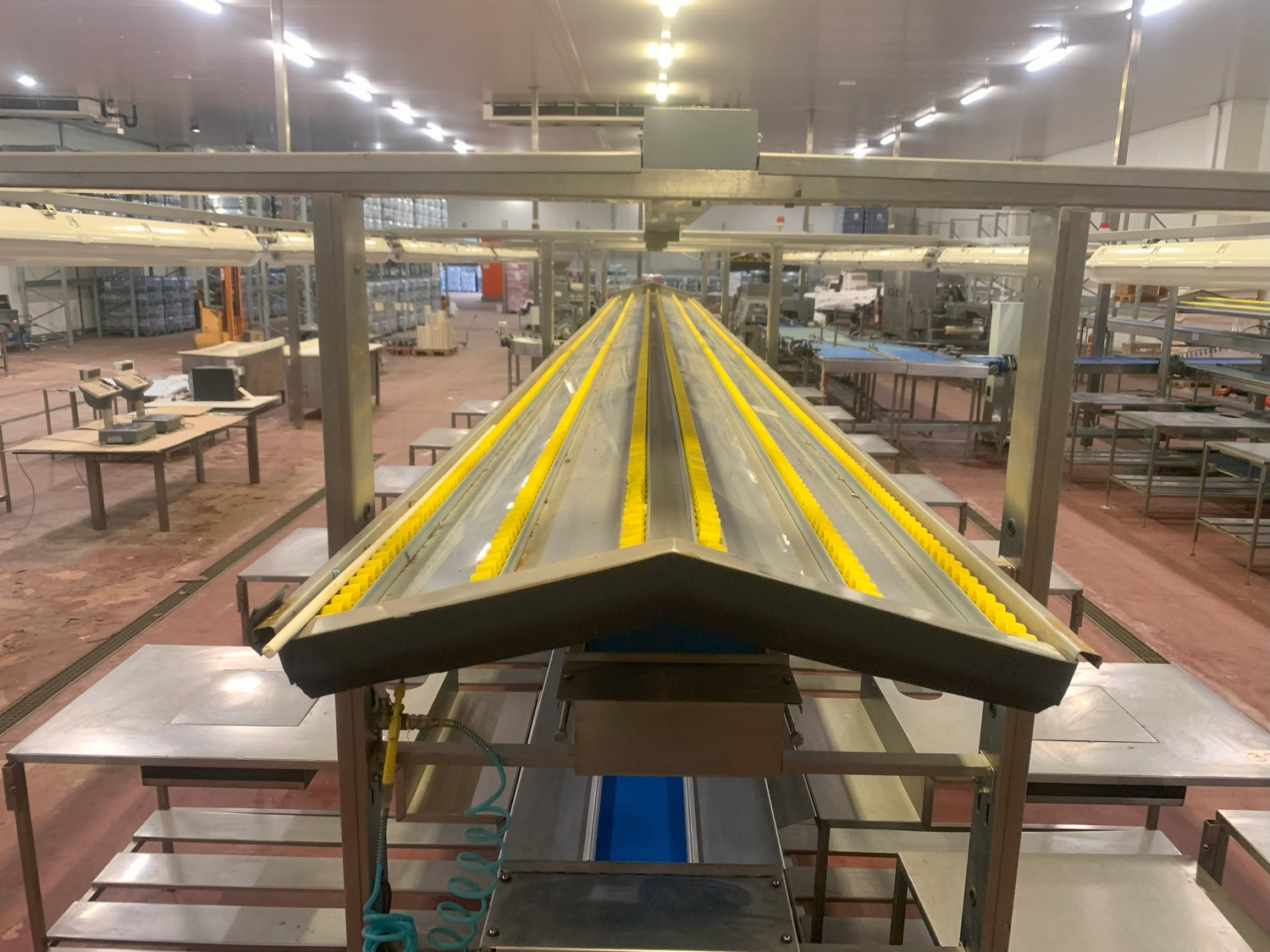 TECHNO GROUP LAB S.R.L. double crate un-packaging conveyor, s/s frame, plastic belts, year of construction: 2015, dimensions: 15150 mm x 2700 mm x 2500 mm and 13150 mm x 2700 mm x 250 mm.