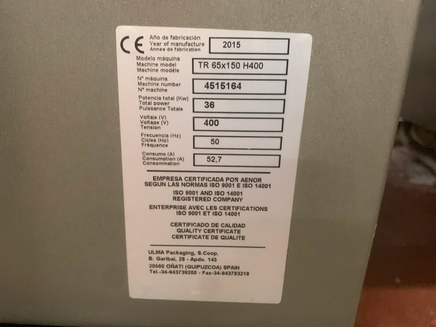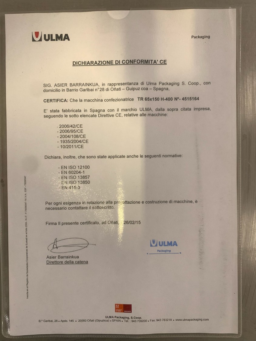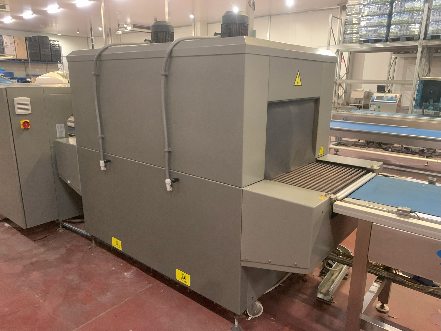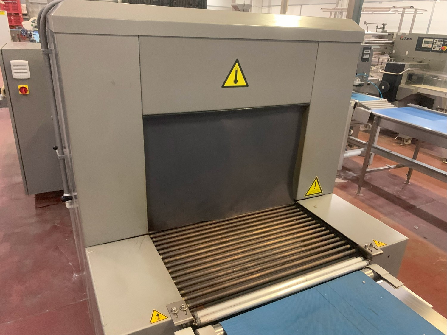 Ulma shrink tunnel, model: TR 65x150 H400, machine number: 4515164, year of construction: 2015, 400 V, 50 Hz, 36 kW, 52.7 A, dimensions: 2450 mm x 1450 mm x 1850 mm.