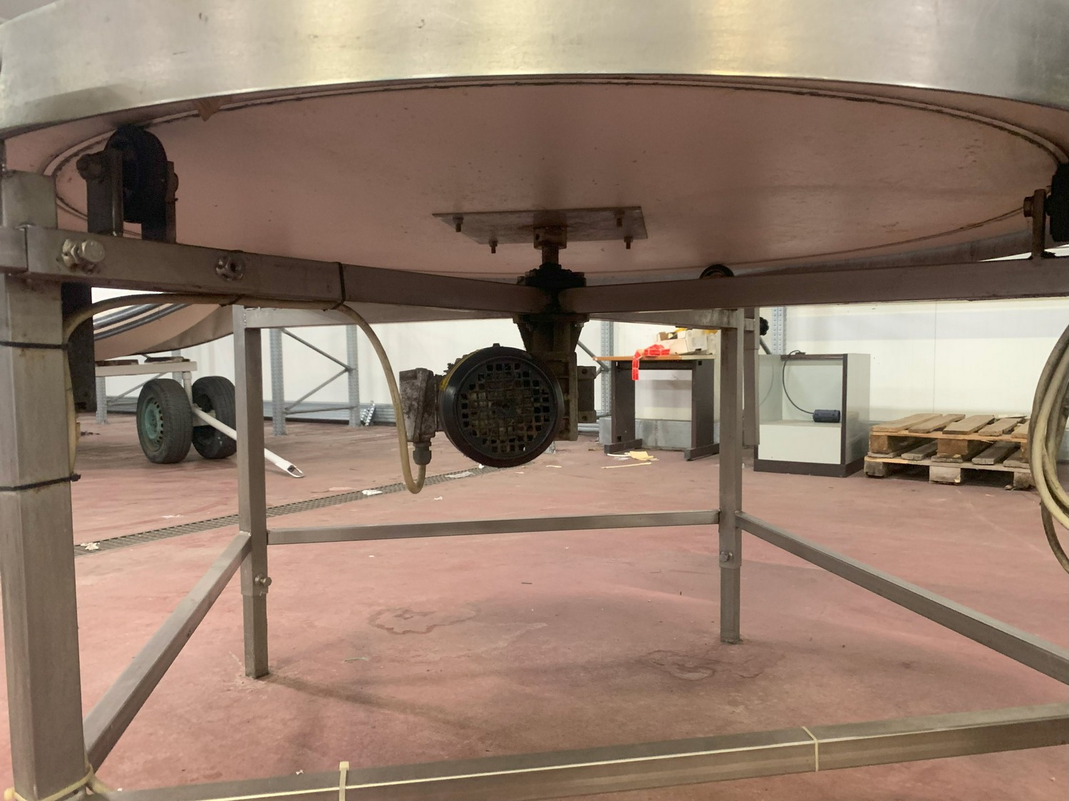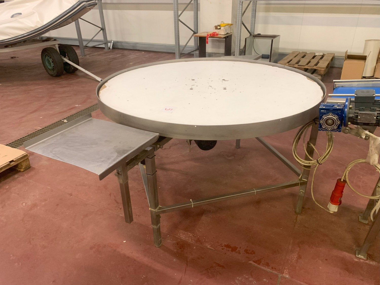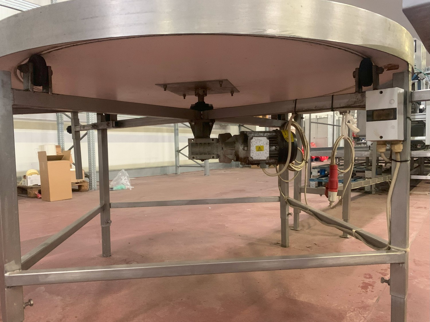 Tecno Impianti turning table, s/s frame, wooden top, dimensions: 2000 mm x 1550 mm x 900 mm.