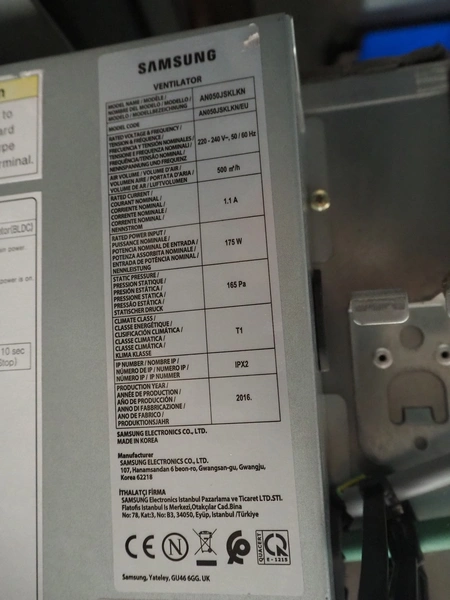 Fujitsu General air conditioner, model: ARHG24LMLA, serial number: R003541, 230 V, 50 Hz, dimensions: 1310 mm x 830 mm x 280 mm and Samsung ventilator, model: AN050JSKKLKN/EU, year of construction: 2016, 220-240 V, 50/60 Hz, 1.1 A, 175 W, dimensions: 1220 mm x 1080 mm x 280 mm.