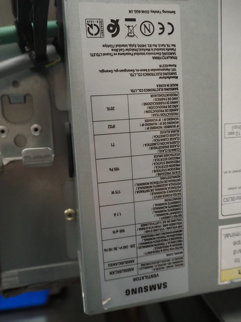 Fujitsu General air conditioner, model: ARHG24LMLA, serial number: R003541, 230 V, 50 Hz, dimensions: 1310 mm x 830 mm x 280 mm and Samsung ventilator, model: AN050JSKKLKN/EU, year of construction: 2016, 220-240 V, 50/60 Hz, 1.1 A, 175 W, dimensions: 1220 mm x 1080 mm x 280 mm.