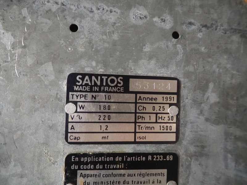 Santos orange press, type: 10, number: 53124, year of construction: 1991, 220 V, 1 Ph, 50 Hz, 1.2 A, dimensions: 290 mm x 200 mm x 380 mm.