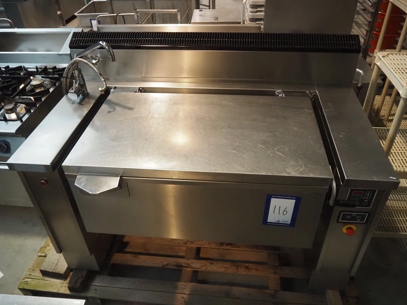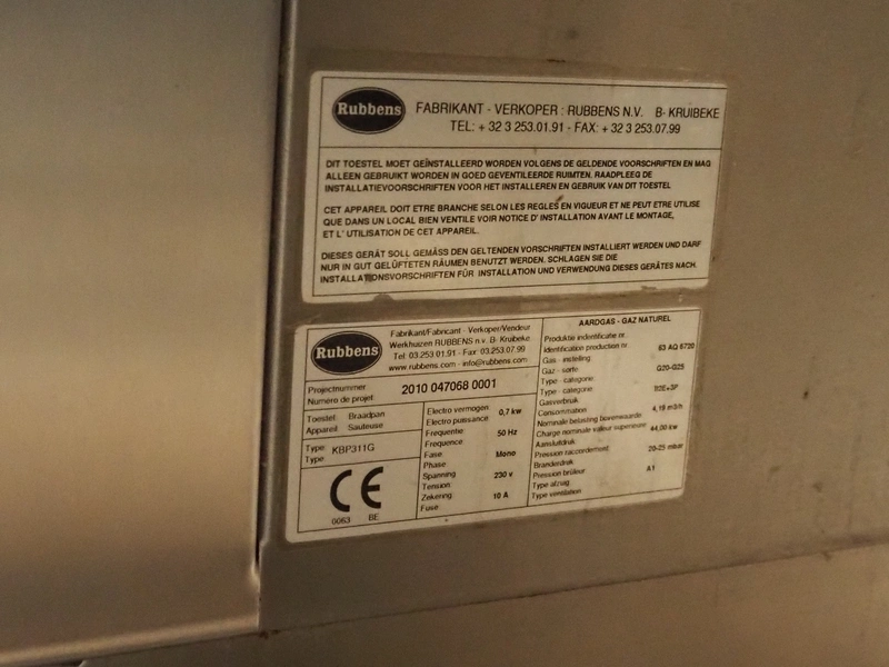 Rubbens braising pan, type: KBP311G, number: 2010 047068 0001, 230 V, 50 Hz, 10 A, 0.7 kW, dimensions inside: 1050 mm x 610 mm x 210 mm, total dimensions: 1640 mm x 1000 mm x 1250 mm.