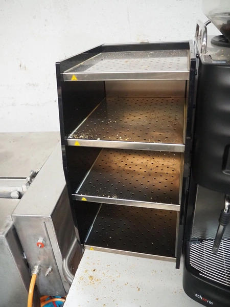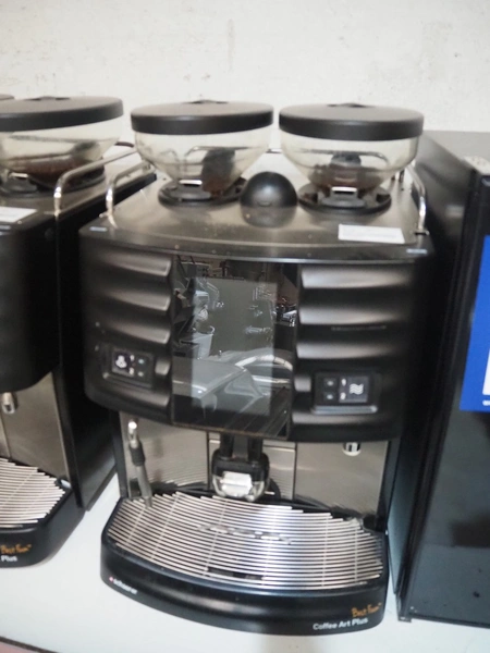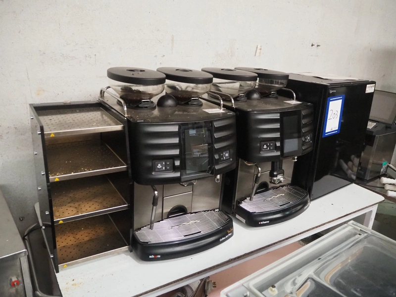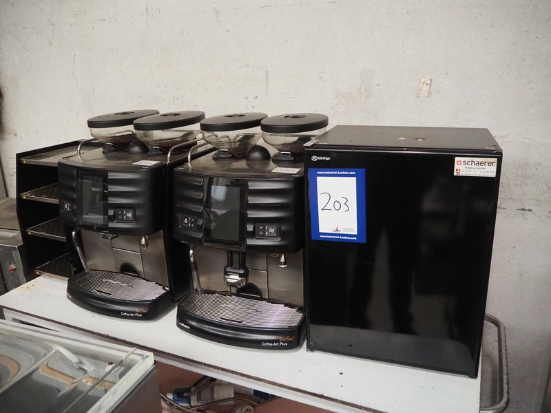 2 Schaerer coffee machines with Vitrifrigo fridge and cabinet, model fridge: C60 P DX, serial number: 16251706, 220/240 V, 50 Hz, 0.17 A, 30.5 W, volume: 60 liter, refrigerant: R600a, dimensions fridge: 430 mm x 470 mm x 610 mm, dimensions coffee machines: (2x) 550 mm x 420 mm x 670 mm, dimensions cabinet: 390 mm x 270 mm x 520 mm.
