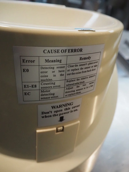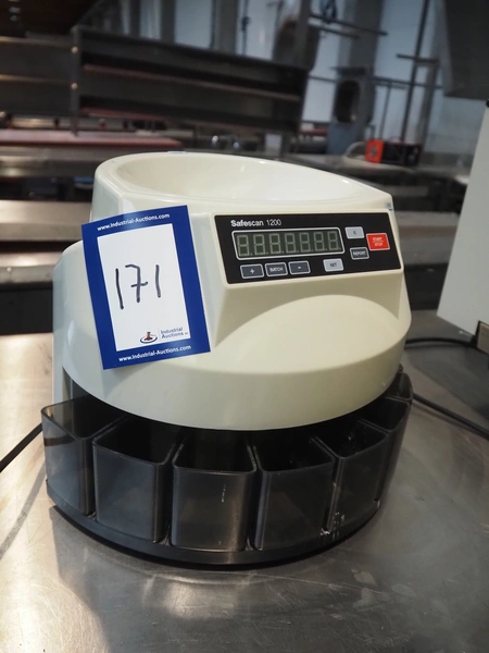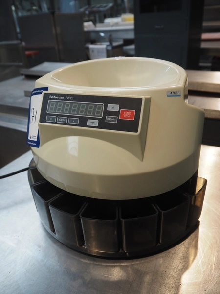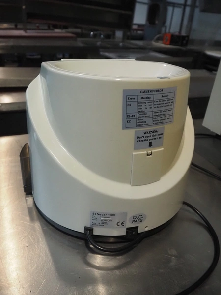 Safescan coin counter, model: 1200, serial number: 2008040408, 230 V, 3.15 A, 45 W, dimensions: 350 mm x 350 mm x 300 mm.
