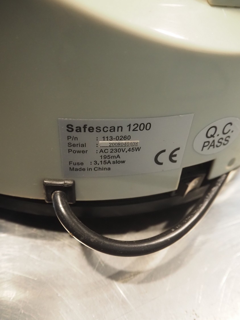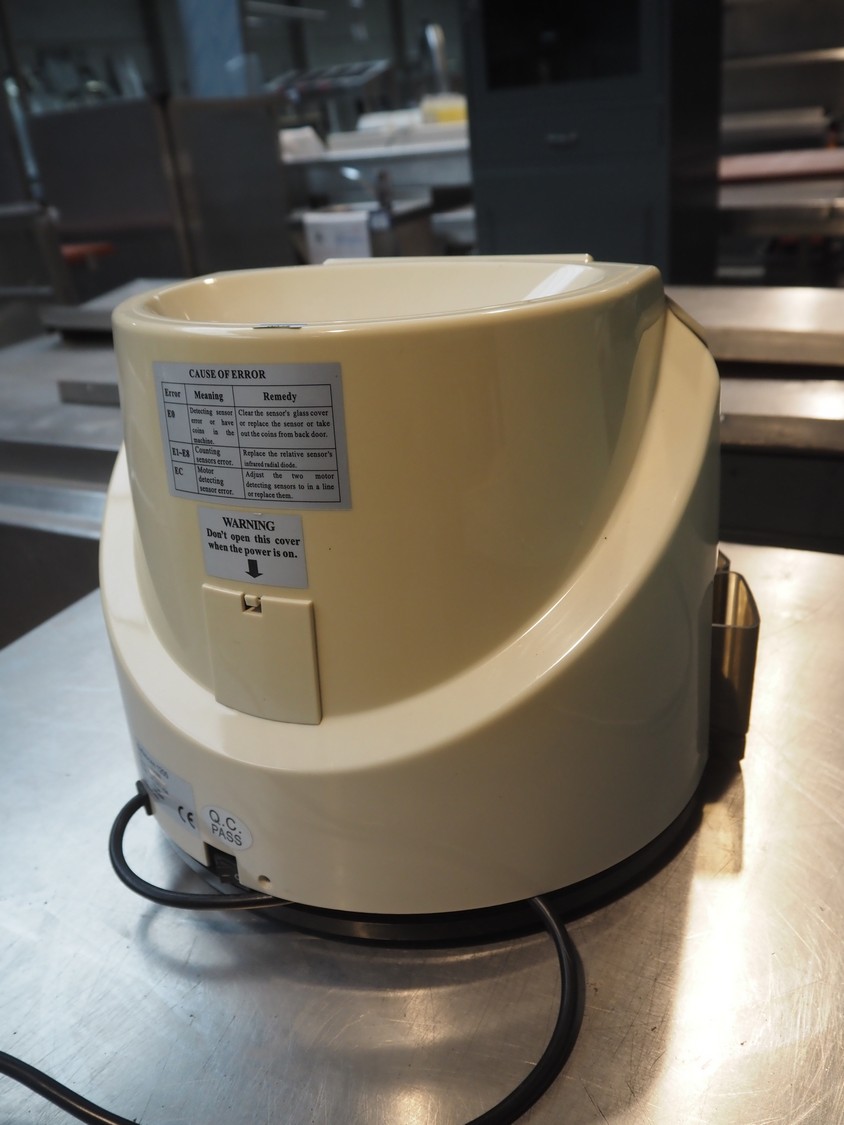 Safescan coin counter, model: 1200, serial number: 2008040408, 230 V, 3.15 A, 45 W, dimensions: 350 mm x 350 mm x 300 mm.