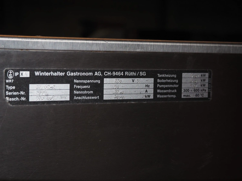 Winterhalter dishwasher, type: GR 62/2, serial number: 376 004, 230 V, 50 Hz, 27 A, 10 kW, dimensions: 600 mm x 660 mm x 840 mm.