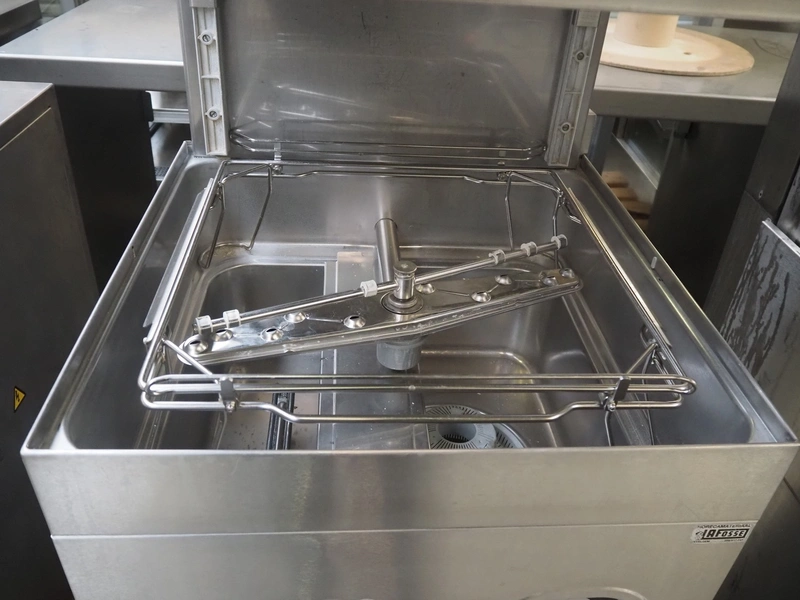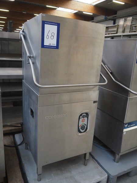 Comenda dishwasher, model: C100, number: DB013593/12/04, 380/400 V, 3 Ph, 50 Hz, 14 A, 8/9.1 kW, dimensions inside: 500 mm x 500 mm, total dimensions: 830 mm x 730 mm x 1530 mm.