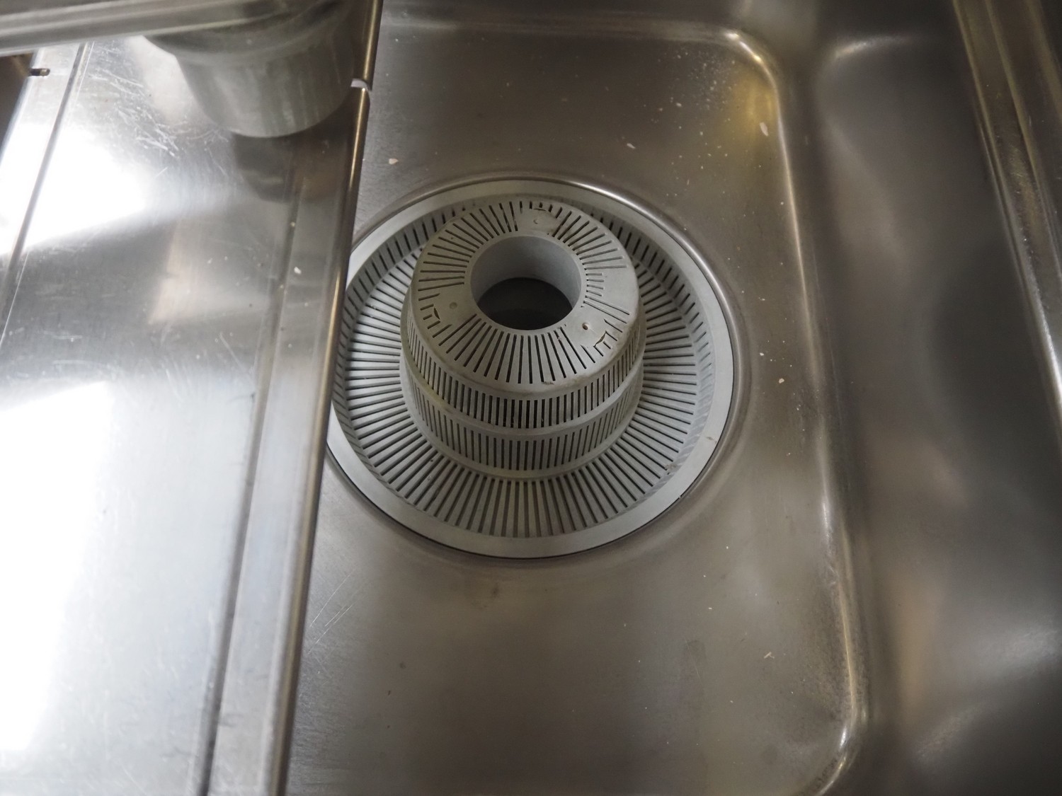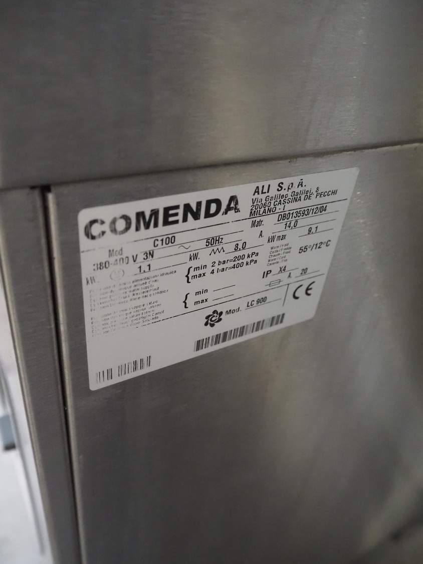 Comenda dishwasher, model: C100, number: DB013593/12/04, 380/400 V, 3 Ph, 50 Hz, 14 A, 8/9.1 kW, dimensions inside: 500 mm x 500 mm, total dimensions: 830 mm x 730 mm x 1530 mm.