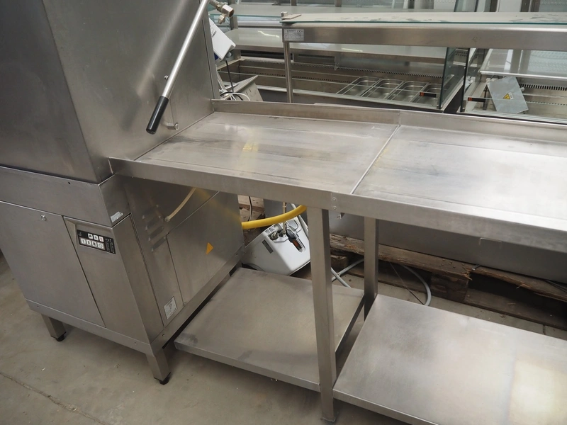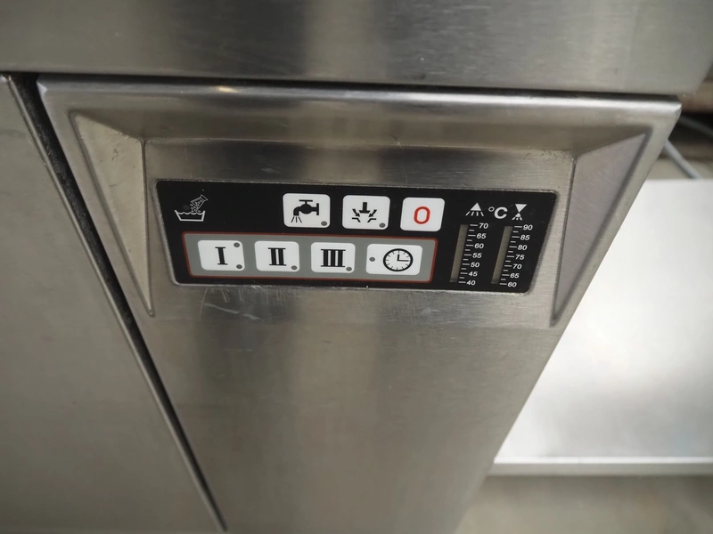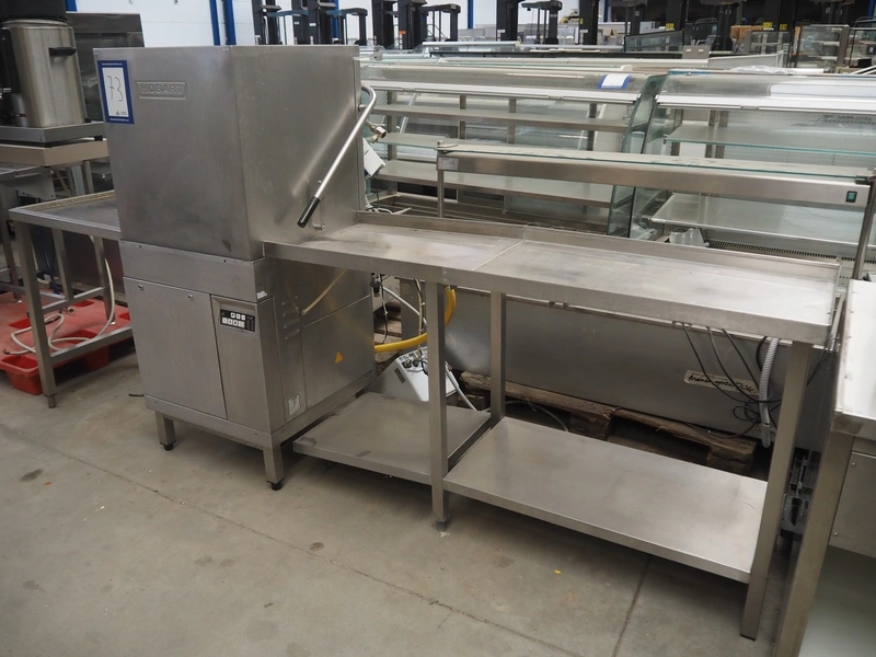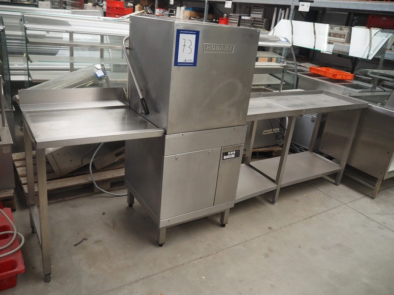 Hobart dishwasher with infeed- and outfeed table, model: AUX70E, serial number: 86314055, year of construction: 2002, 400 V, 3 Ph, 50 Hz, 33 A, 19.7 kW, dimensions inside: 500 mm x 500 mm, total dimensions: 1900 mm x 700 mm x 1500 mm.