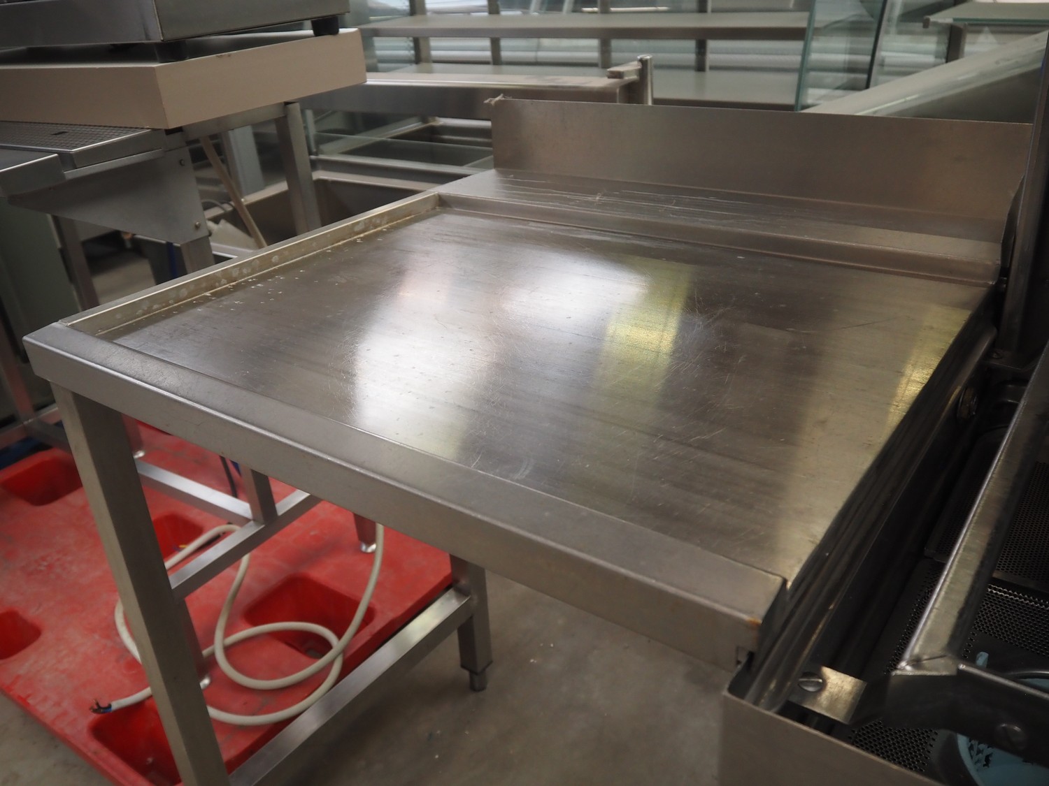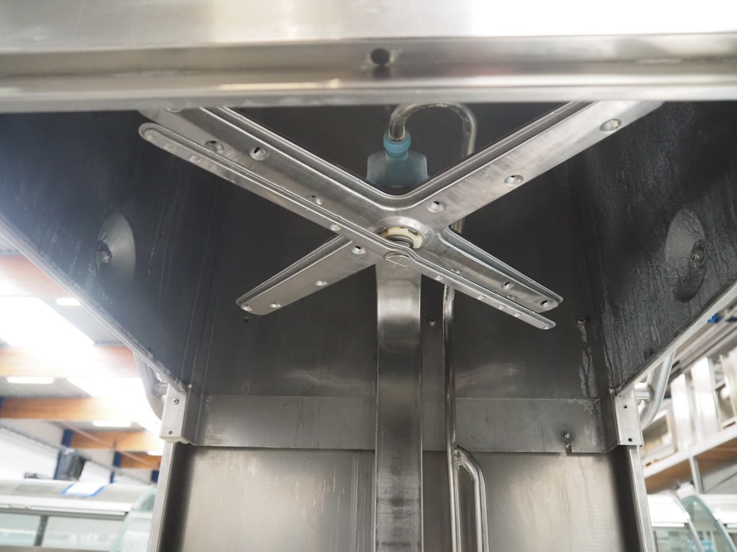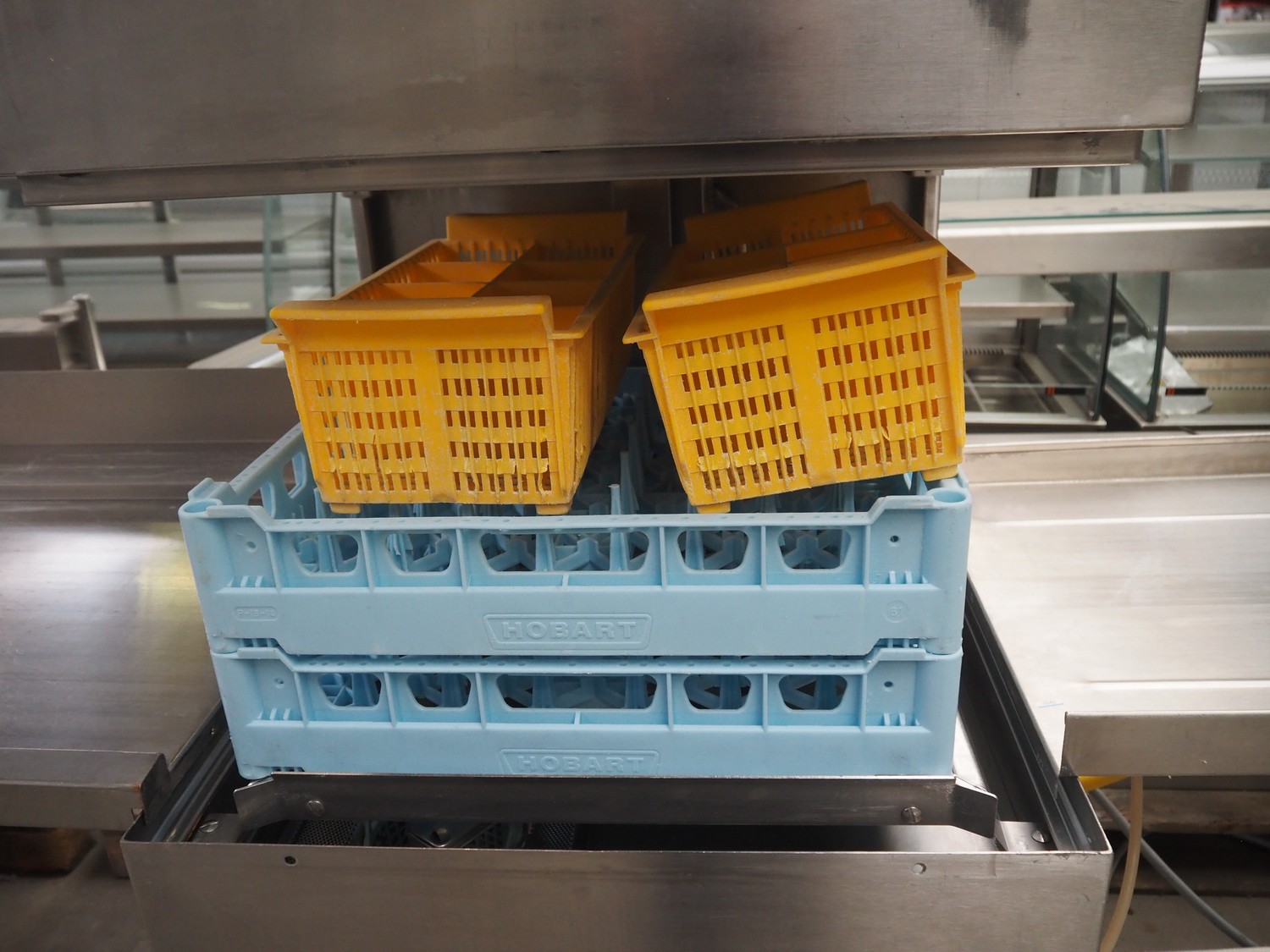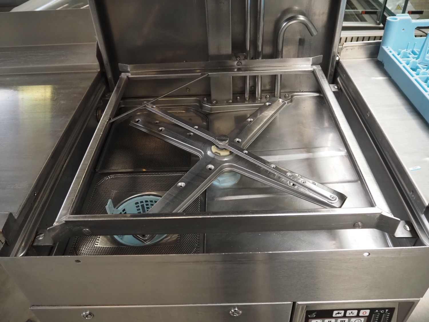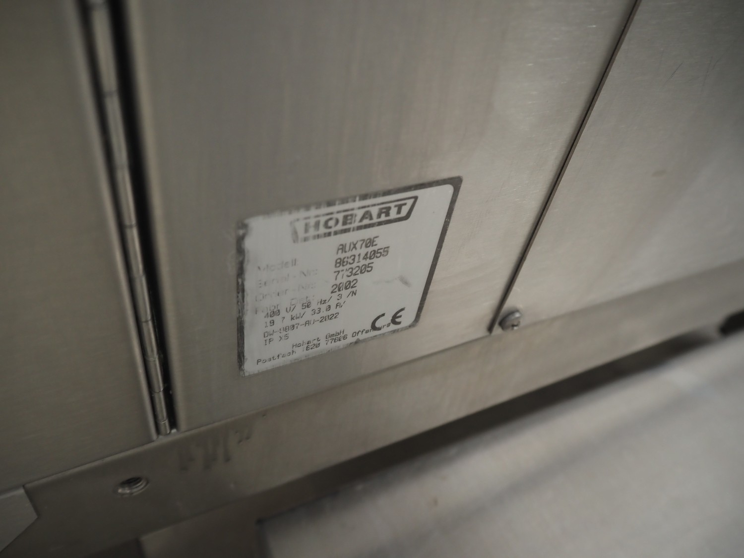 Hobart dishwasher with infeed- and outfeed table, model: AUX70E, serial number: 86314055, year of construction: 2002, 400 V, 3 Ph, 50 Hz, 33 A, 19.7 kW, dimensions inside: 500 mm x 500 mm, total dimensions: 1900 mm x 700 mm x 1500 mm.