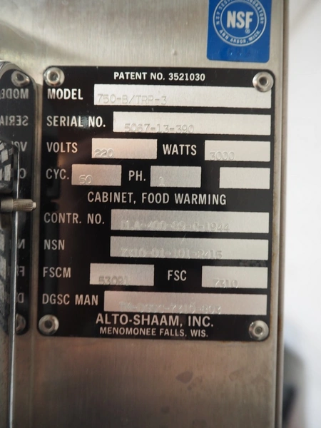 Alto-Shaam mobile warming cabinet, model: 750-B/TRP-3, serial number: 5067-13-390, 220 V, 1 Ph, 3000 W, (3x) 12 floors, dimensions each floor: 650 mm x 540 mm, total dimensions: 820 mm x 730 mm x 1920 mm.