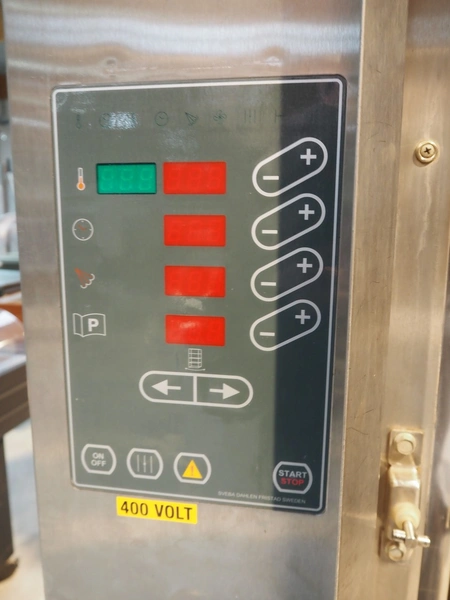 Sveba Dahlen AB mobile rotary oven with hood, model number: S400, serial number: M219995 /0924, 400 V, 3 Ph, 50 Hz, 23 kW, 10 floors, floor dimensions: (10x) 600 mm x 400 mm, total dimensions: 1180 mm x 1100 mm x 2100 mm.