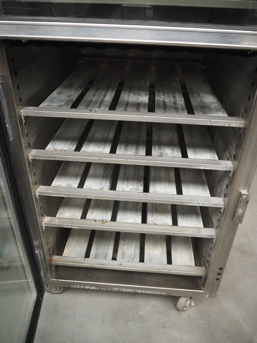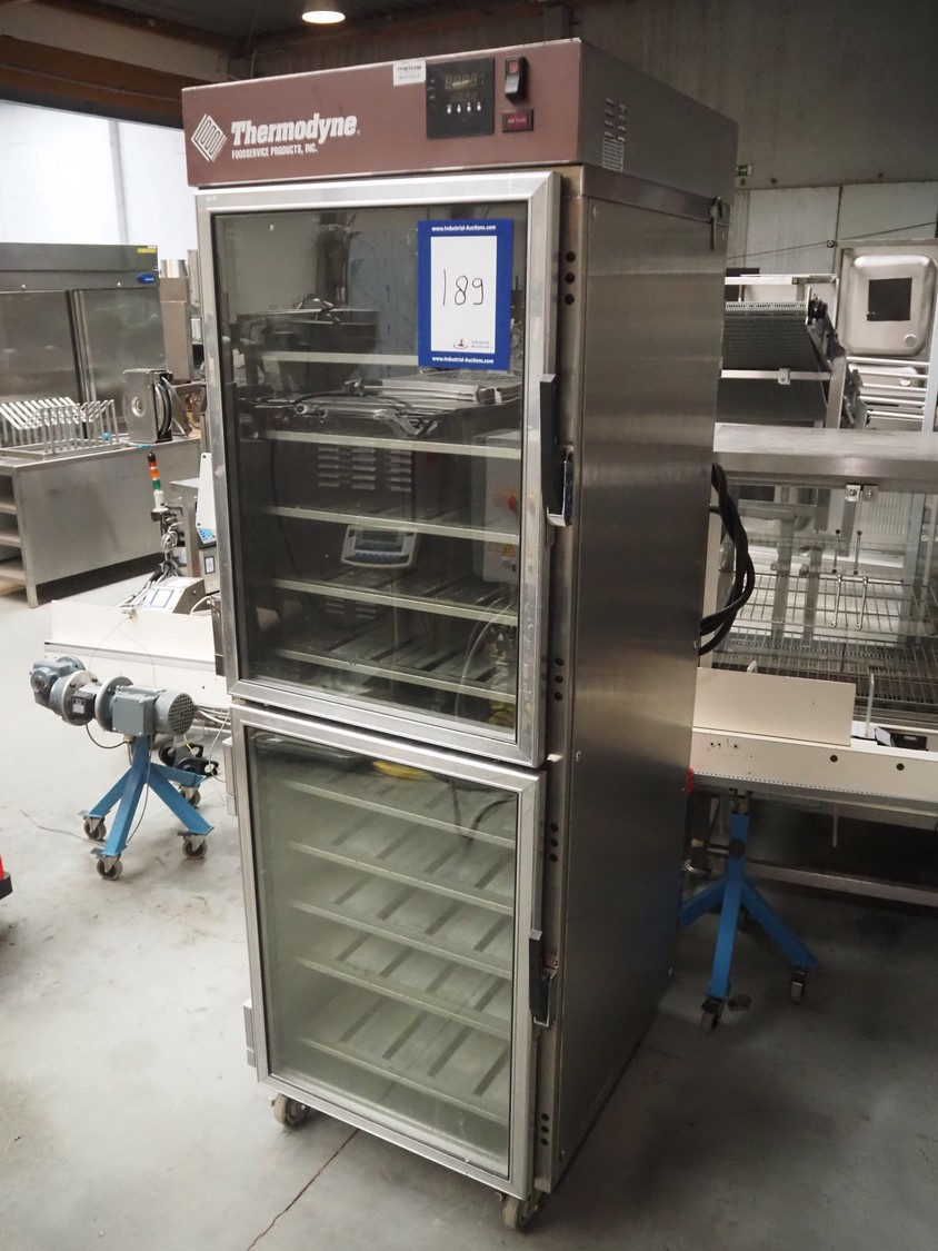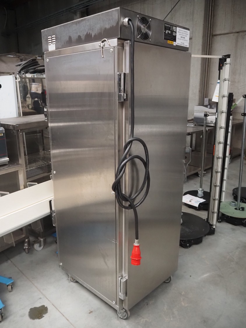 Thermodyne mobile slow cook and hold oven, model: 1900G, serial number: 14567, year of construction: 1/1/17, 230/440 V, 3 Ph, 50 Hz, 11 A, 10 floors, floor dimensions: 650 mm x 550 mm, total dimensions: 830 mm x 680 mm x 1960 mm.