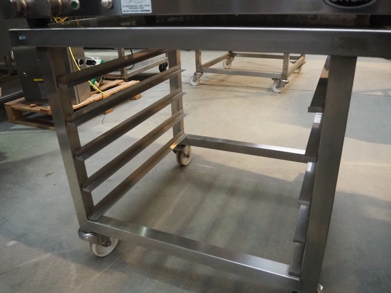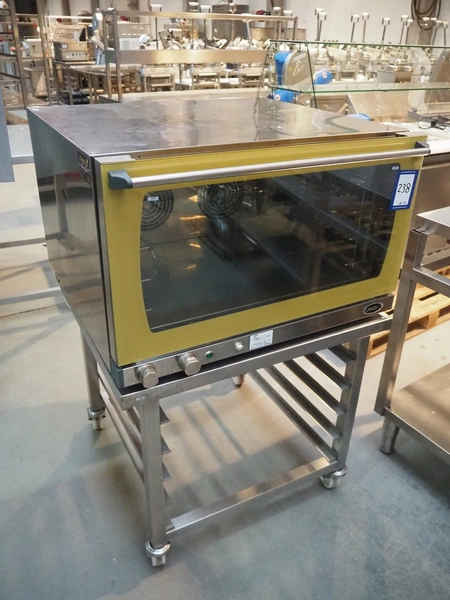 Unox oven on trolley, model: XF193, serial number: 2751, year of construction: 31/03/2008, 230/400 V, 3 Ph, 50/60 Hz, 6.3 kW, 4 floors, floor dimensions: 610 mm x 370 mm, total dimensions: 800 mm x 800 mm x 1230 mm.