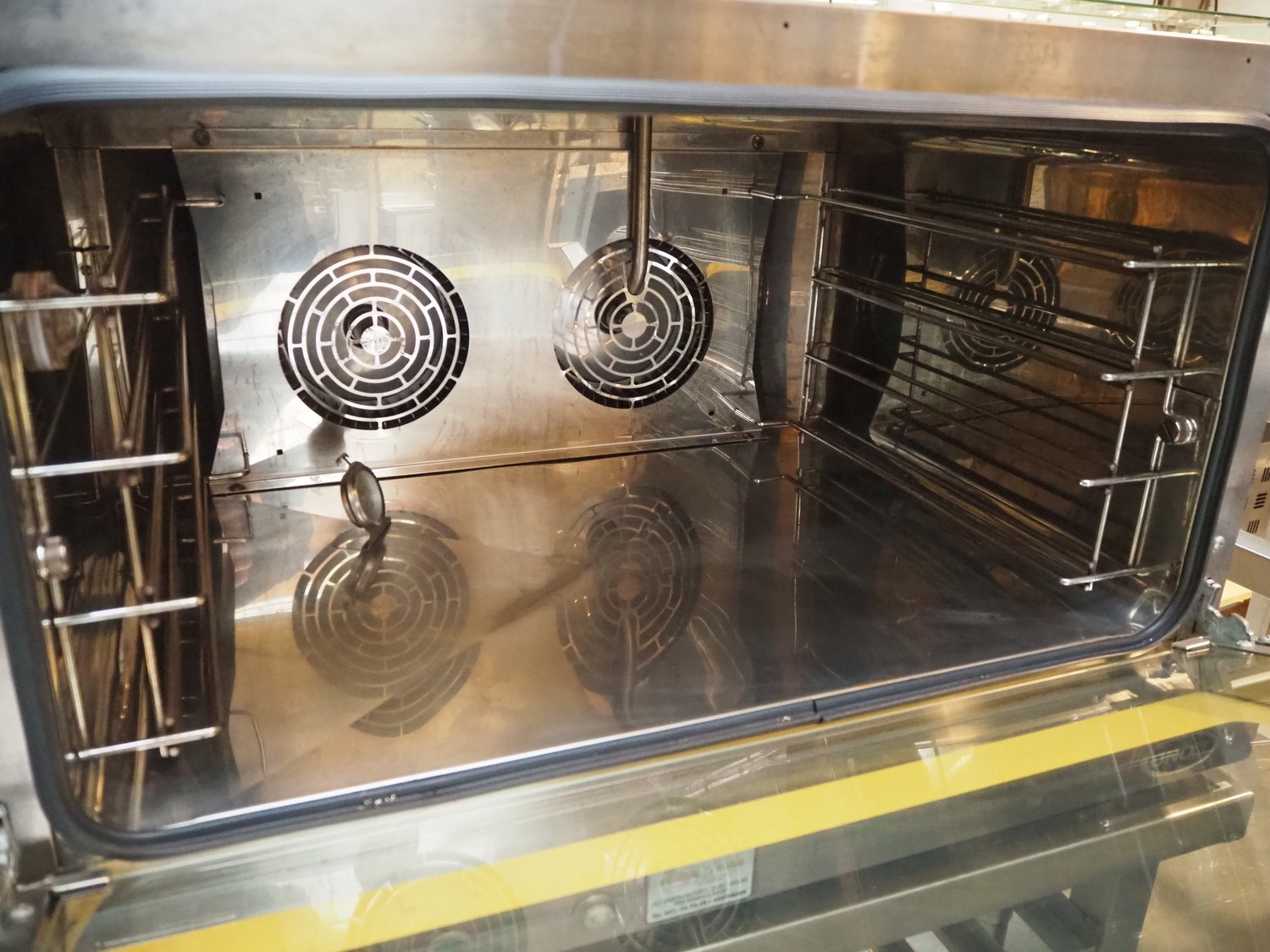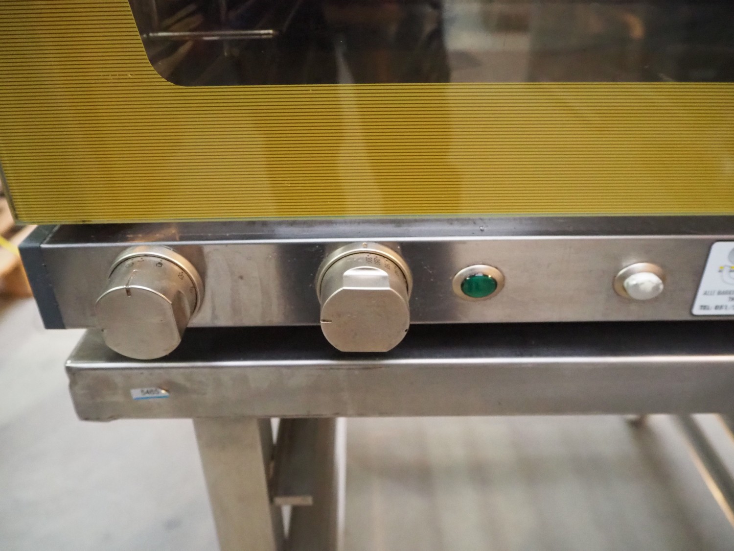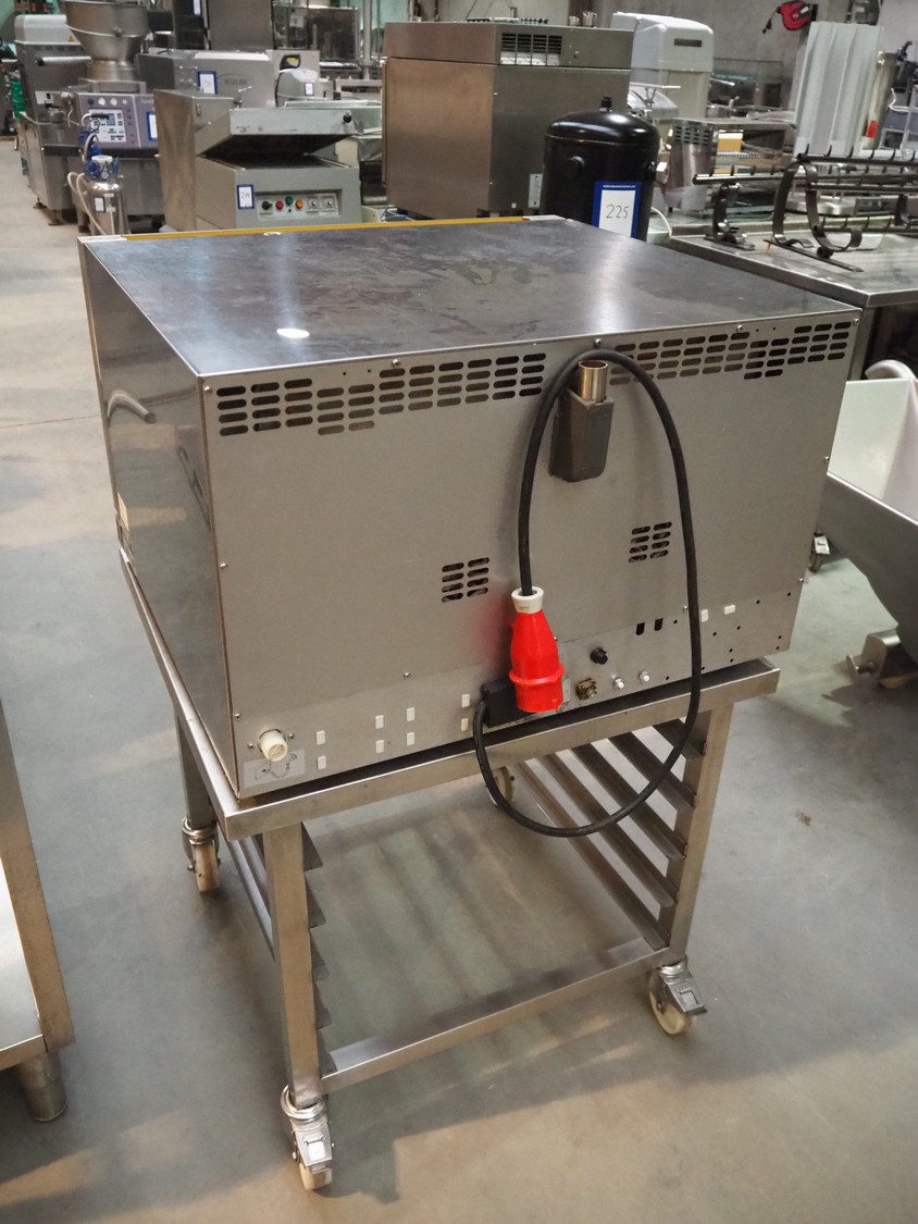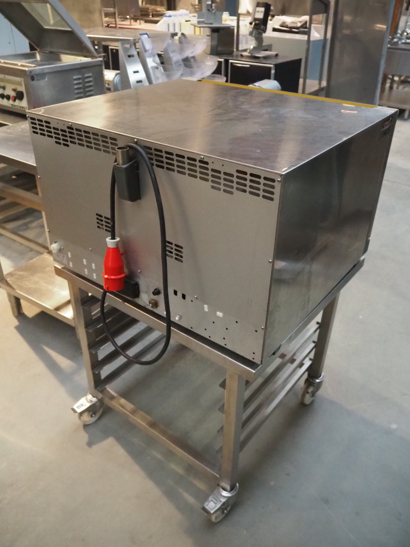 Unox oven on trolley, model: XF193, serial number: 2751, year of construction: 31/03/2008, 230/400 V, 3 Ph, 50/60 Hz, 6.3 kW, 4 floors, floor dimensions: 610 mm x 370 mm, total dimensions: 800 mm x 800 mm x 1230 mm.