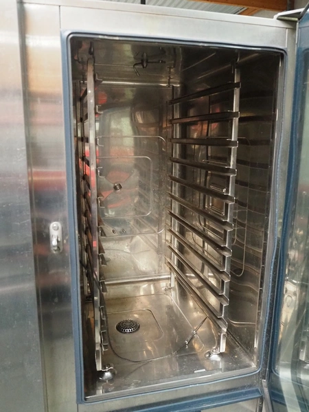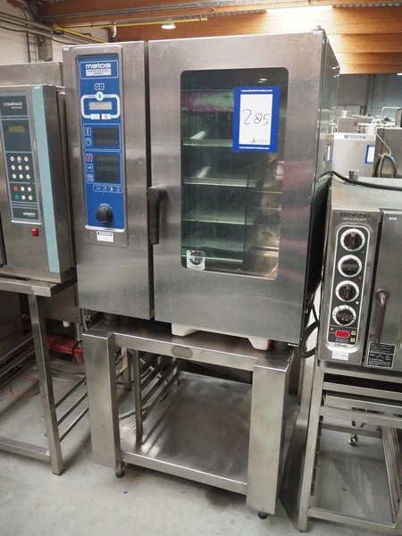 Metos combi steamer, model: CPCM 10G, type: B13/A3, serial number: G11CD02091074660, 230 V, 1 Ph, 50-60 Hz, 1.0 kW, gas heated, 10 floors, dimensions each floor: 540 mm x 330 mm, with s/s frame with rack for plates, total dimensions: 900 mm x 830 mm x 1885 mm.