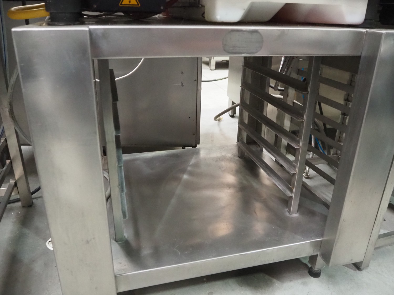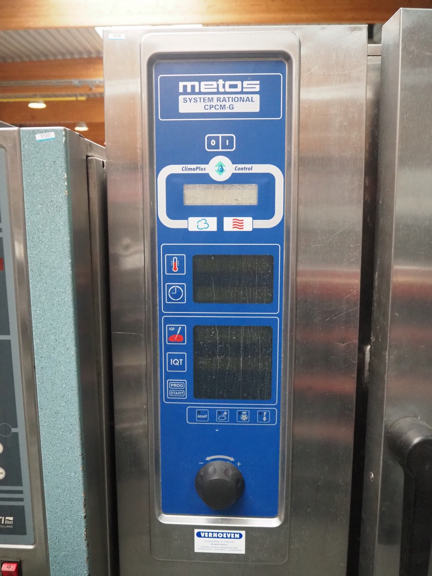 Metos combi steamer, model: CPCM 10G, type: B13/A3, serial number: G11CD02091074660, 230 V, 1 Ph, 50-60 Hz, 1.0 kW, gas heated, 10 floors, dimensions each floor: 540 mm x 330 mm, with s/s frame with rack for plates, total dimensions: 900 mm x 830 mm x 1885 mm.