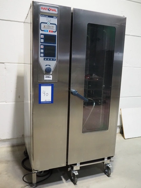 Rational combi steamer, type: CPC 201, serial number: E21CA98121854, 400 V, 3 Ph, 50 Hz, 38 kW, electric heated, with s/s trolley, 20 floors, dimensions each floor: 530 mm x 325 mm, total dimensions: 900 mm x 500 mm x 1800 mm.